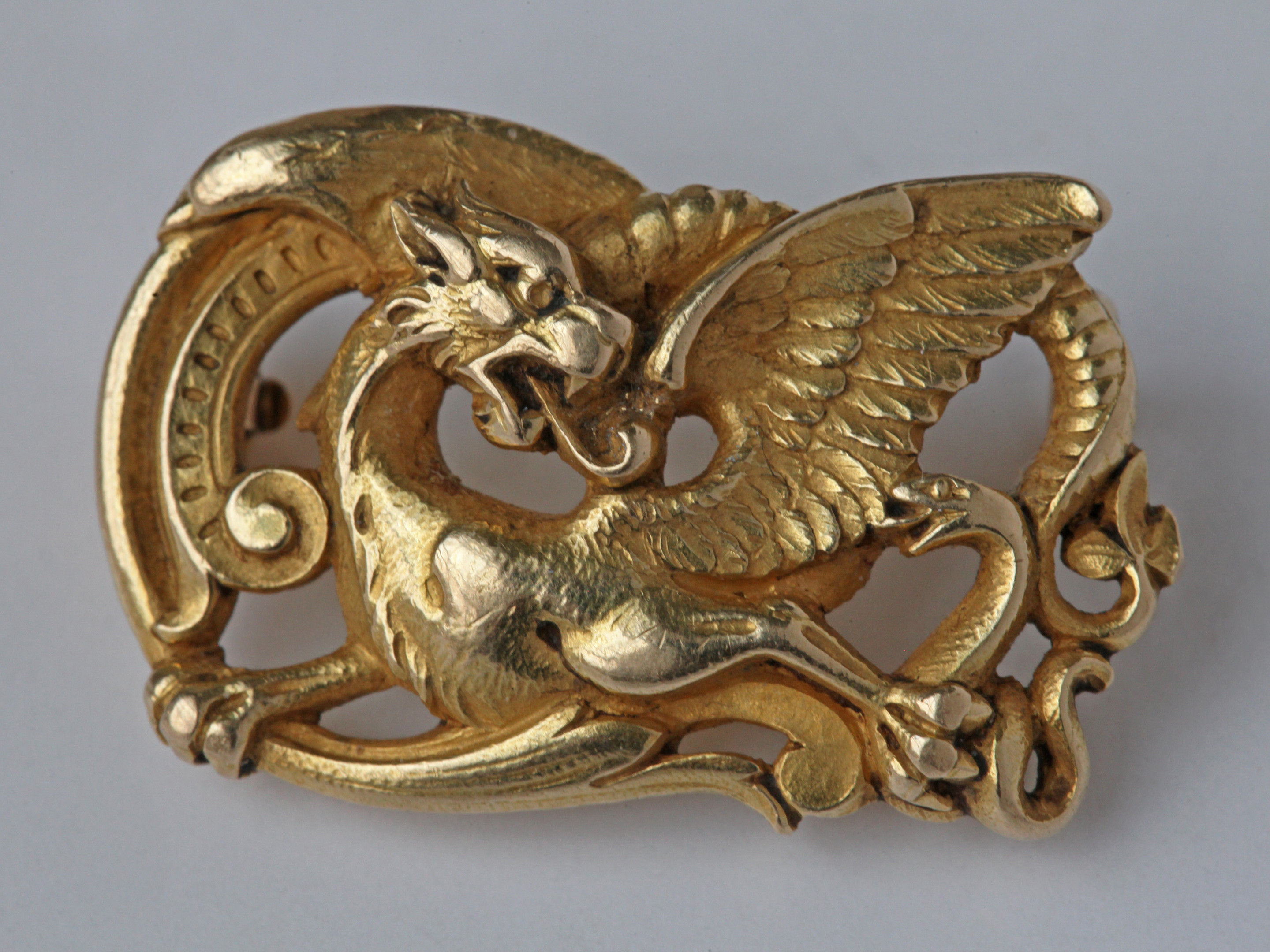 Fabulous jewel of a fabulous beast. This gold Dragon or Wyvern was sculpted for the famous French jeweler Wièse. This Wyvern is closely related to the chimera of choice for the City of London's coat of arms and whose iconic presence can be seen 'guarding the city's boundaries'