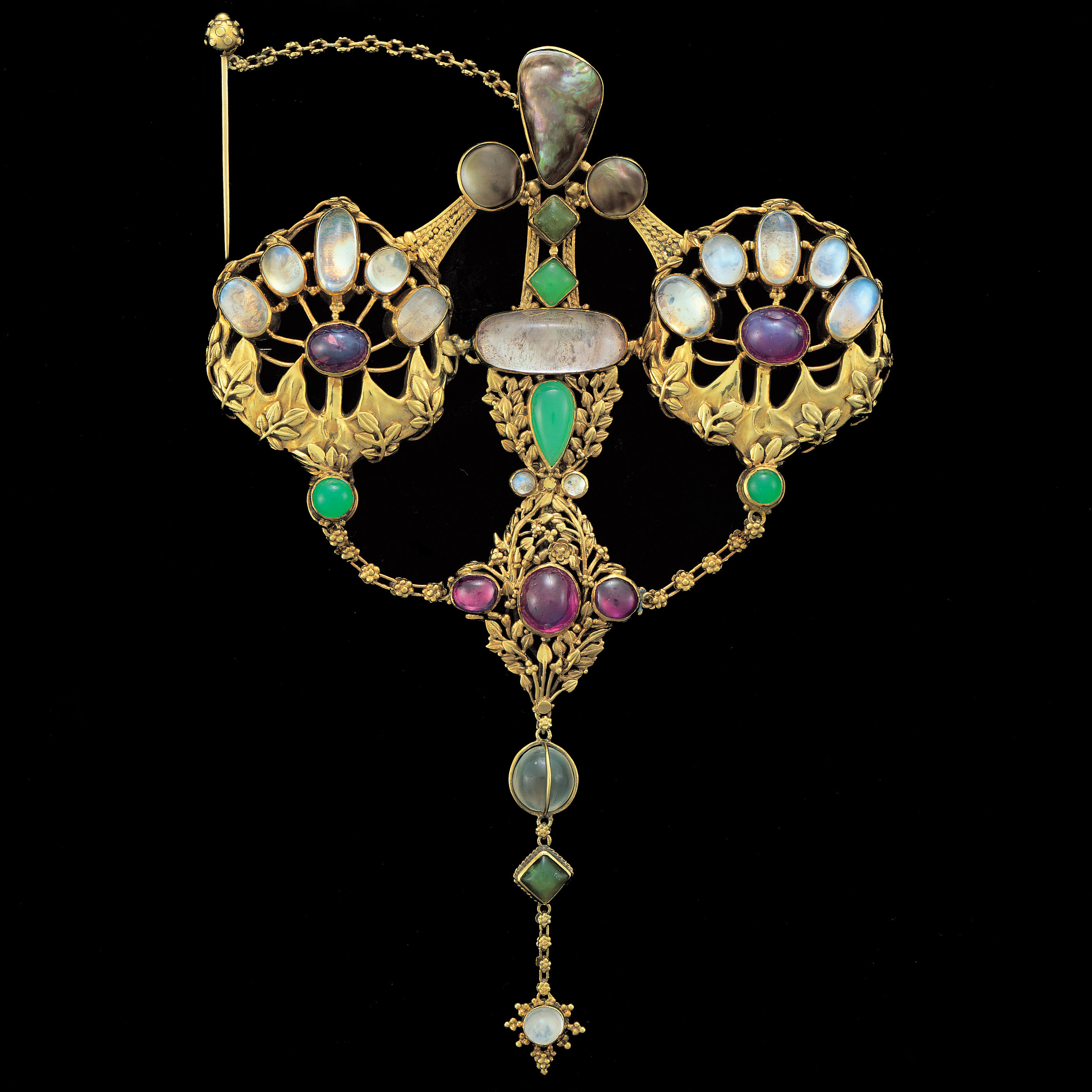 Gold set with black blister pearls, moonstones, amethysts, chrysoprase, bowenite & rubies.