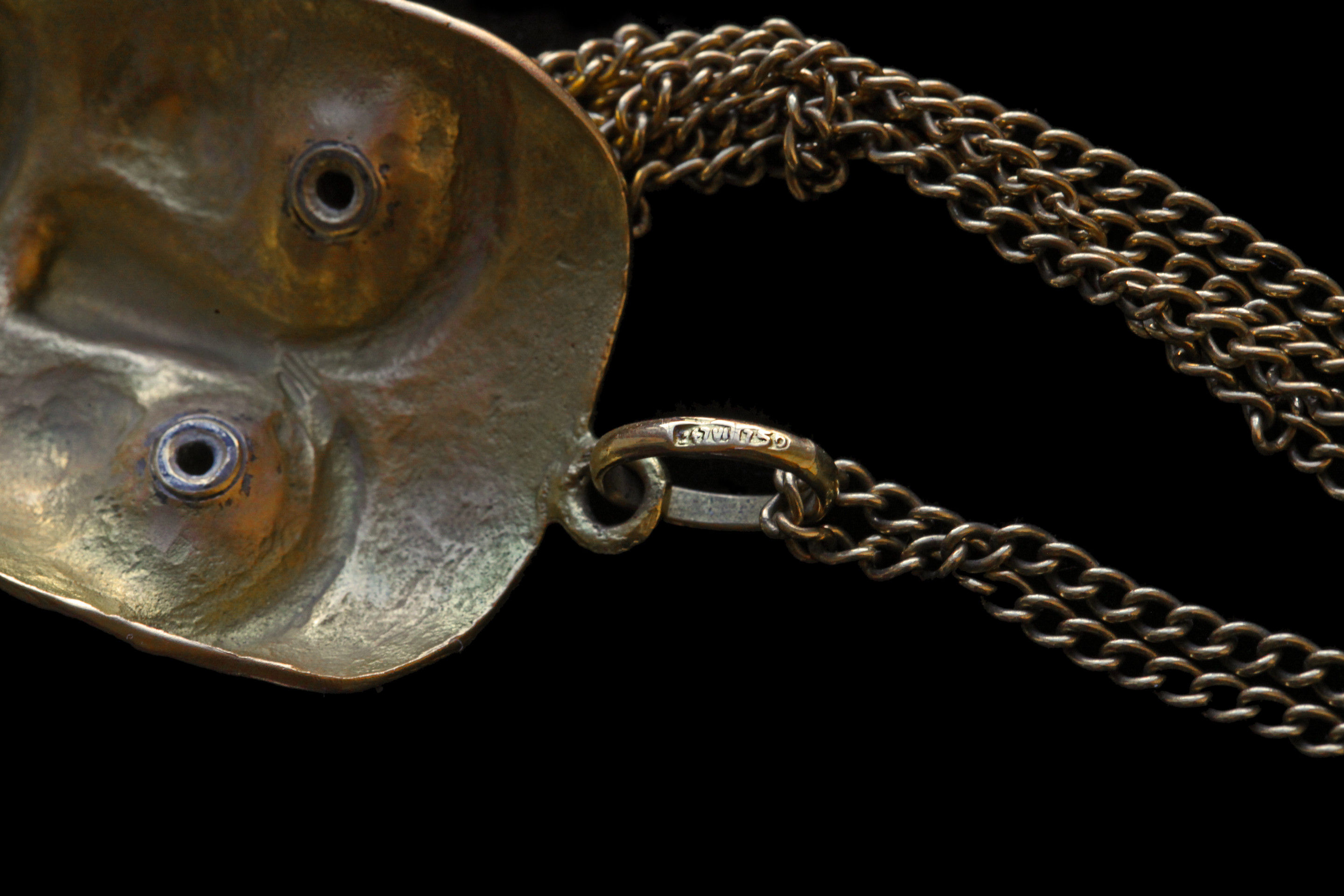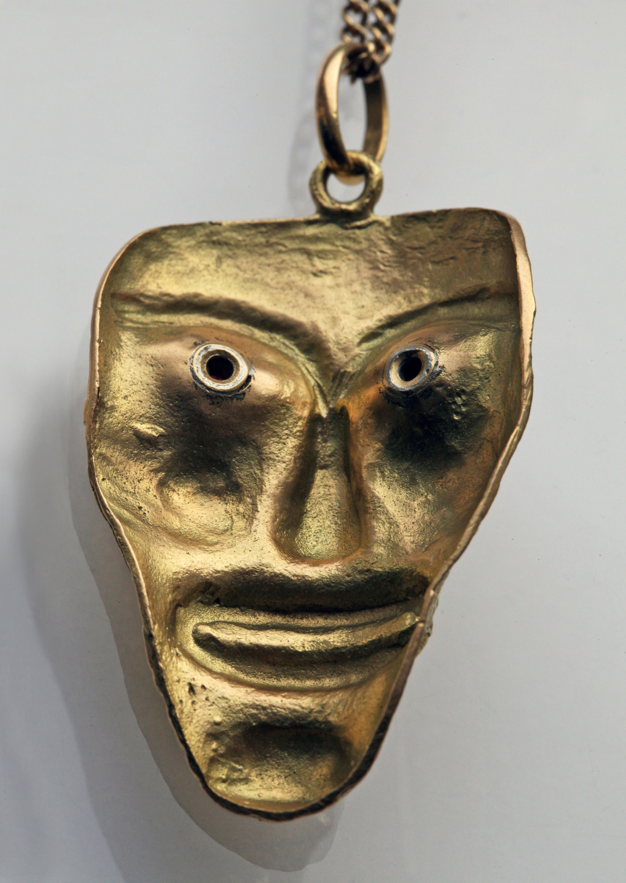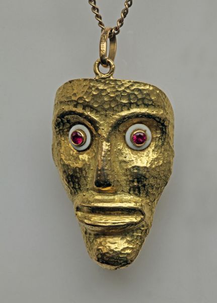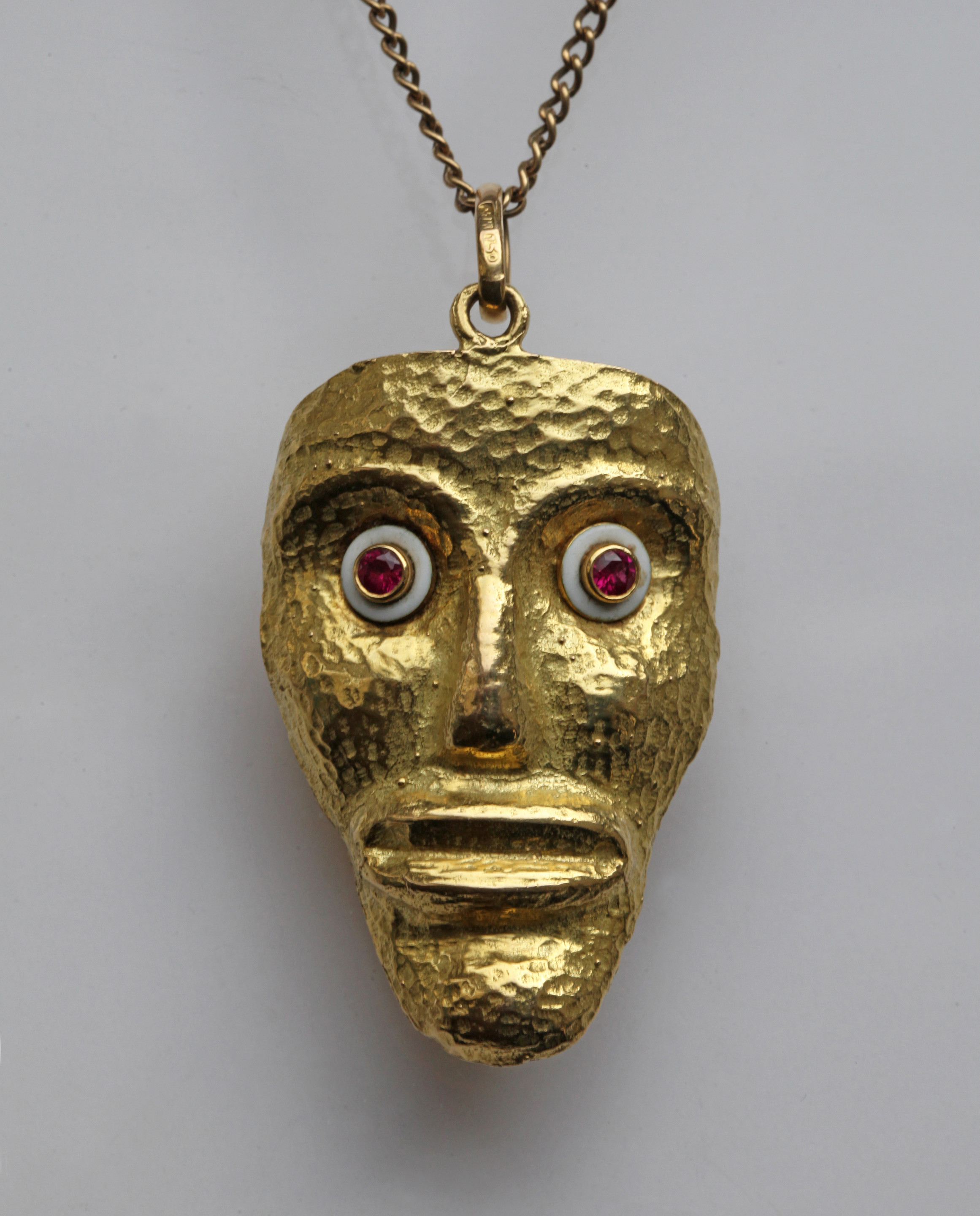 A Powerful Talismanic pendant of Rastafarian interest based on Ashanti & Ethiopian original masks. Cire perdue gold with ruby and enamel eyes.