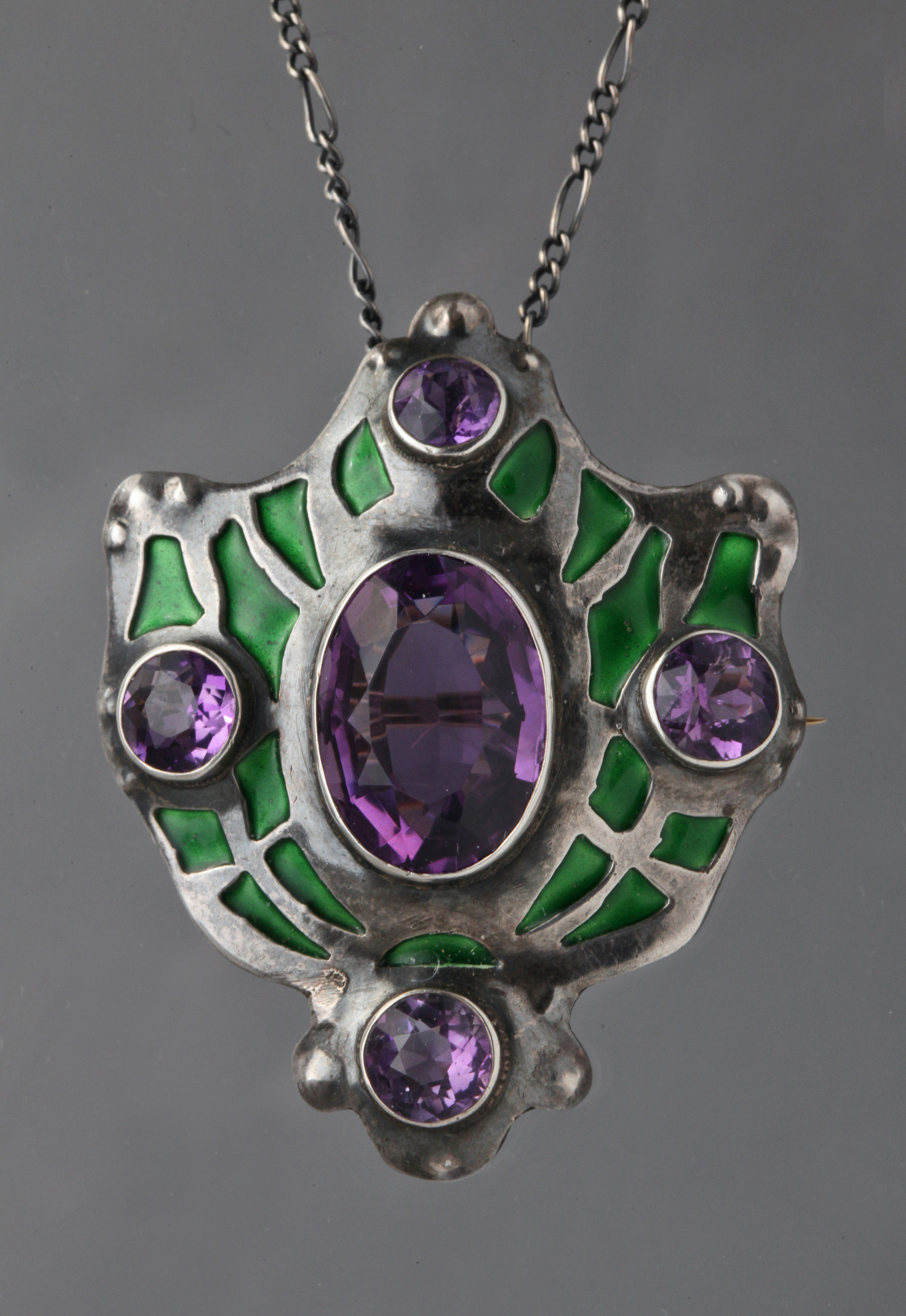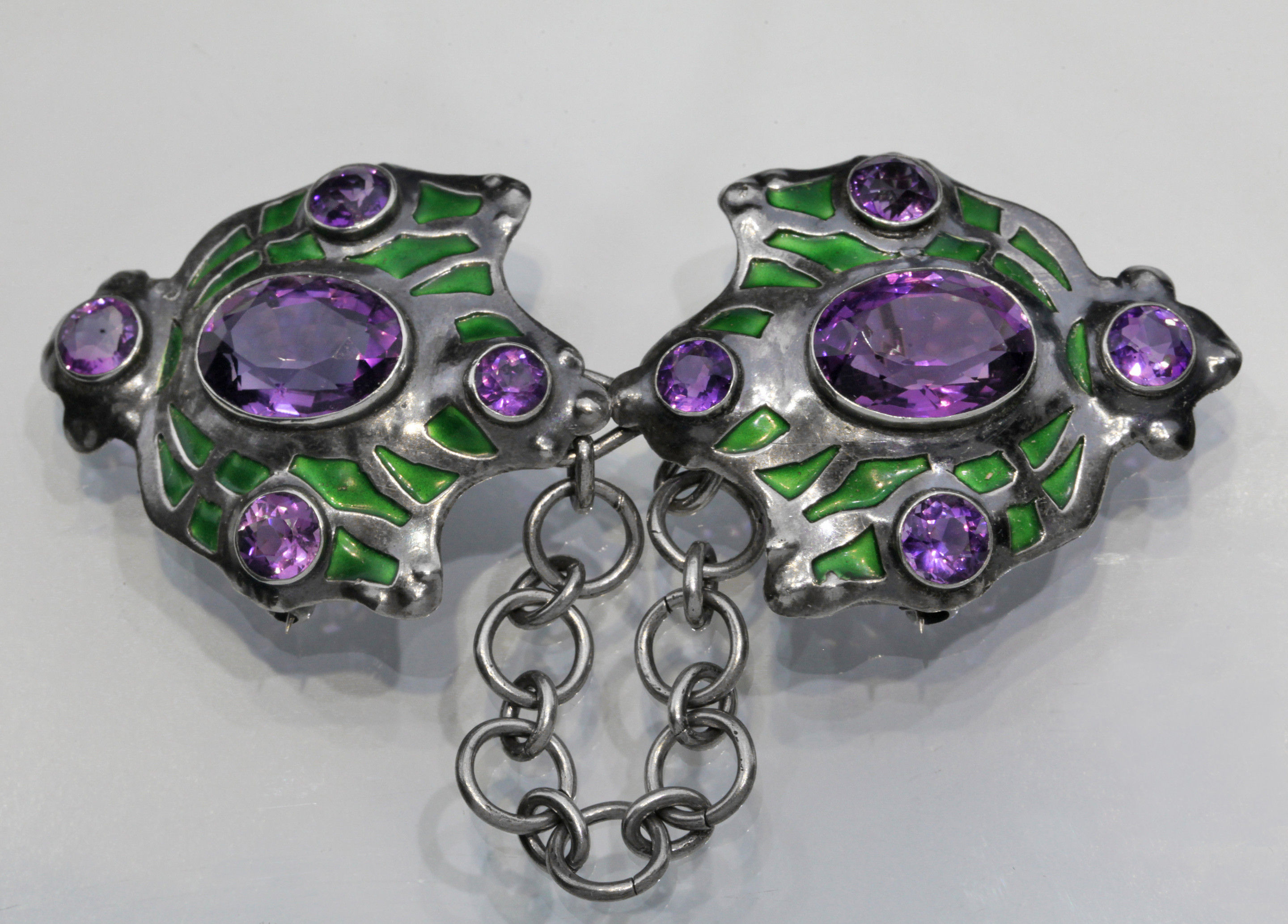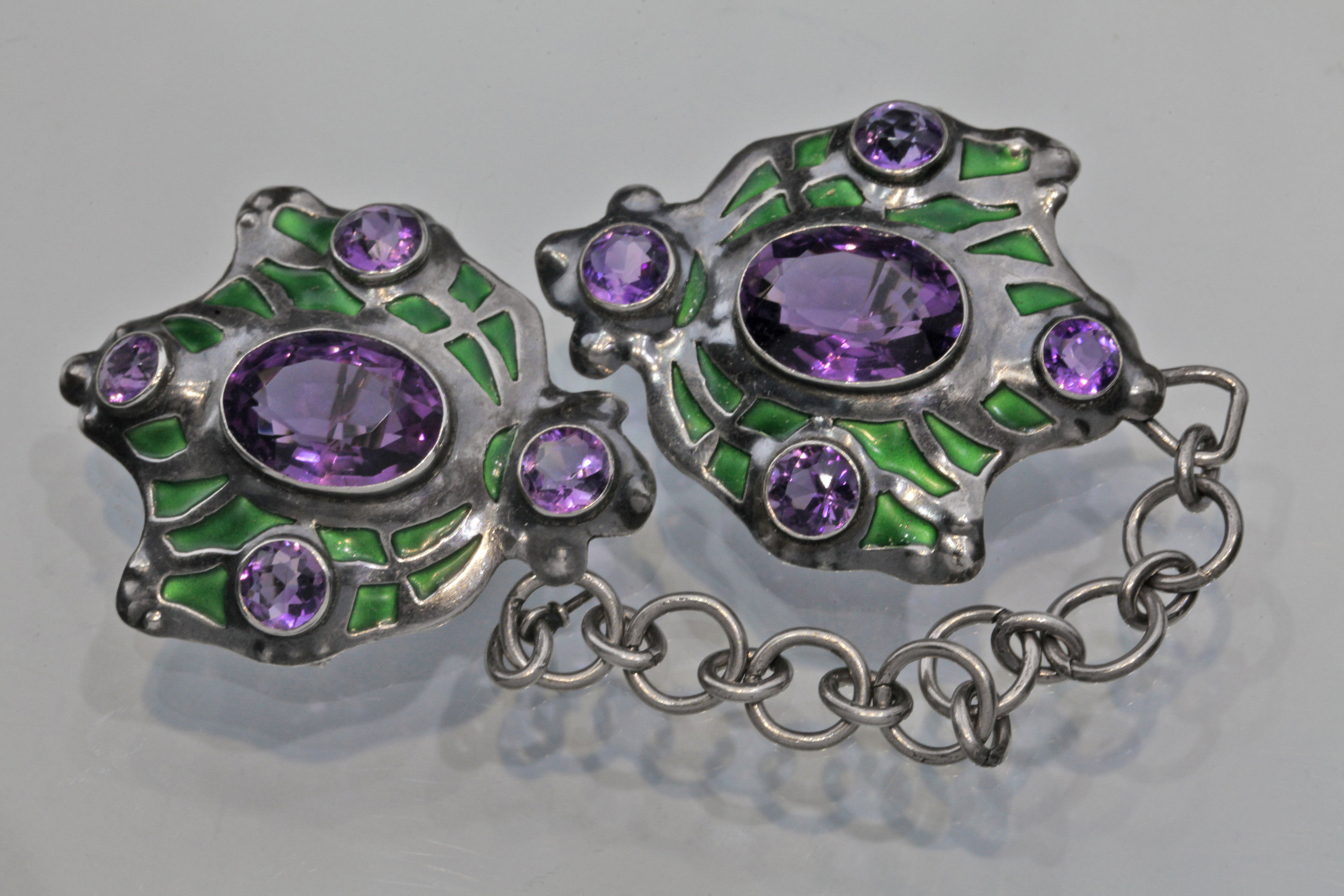 An impressive Arts & Crafts Cloak Clasp attributed to The Guild of Handicraft. Champleve enamel with superb amethysts.