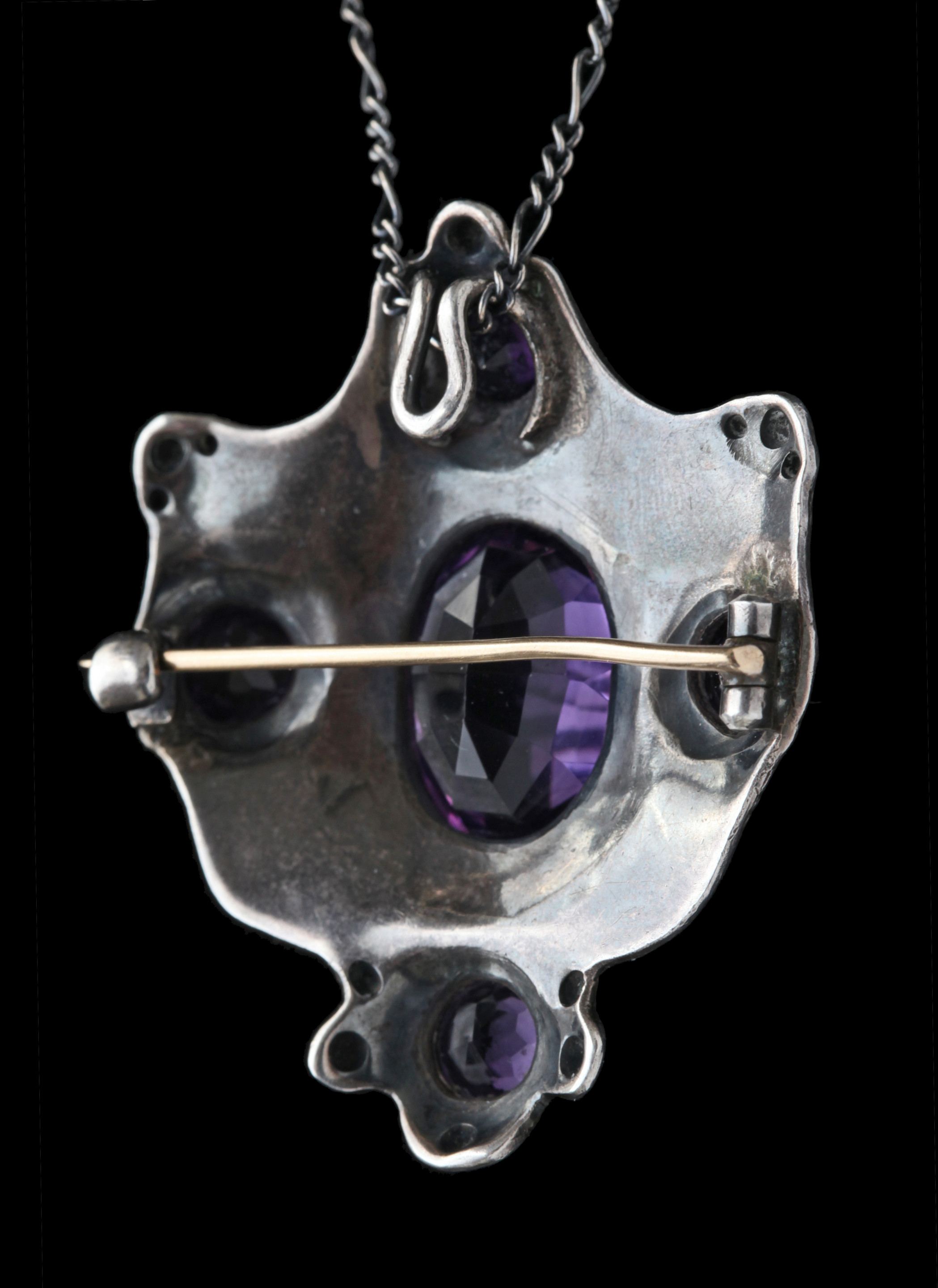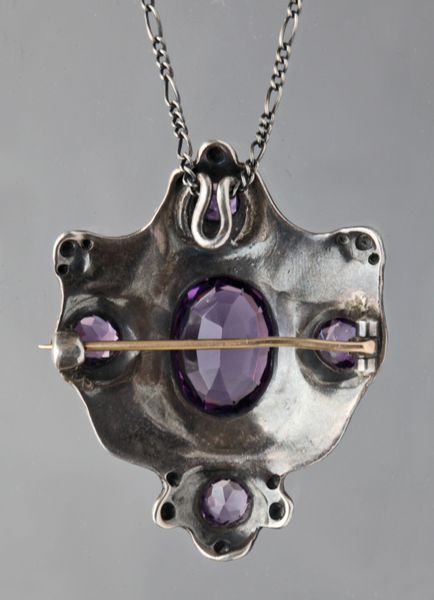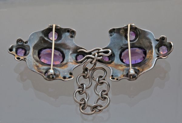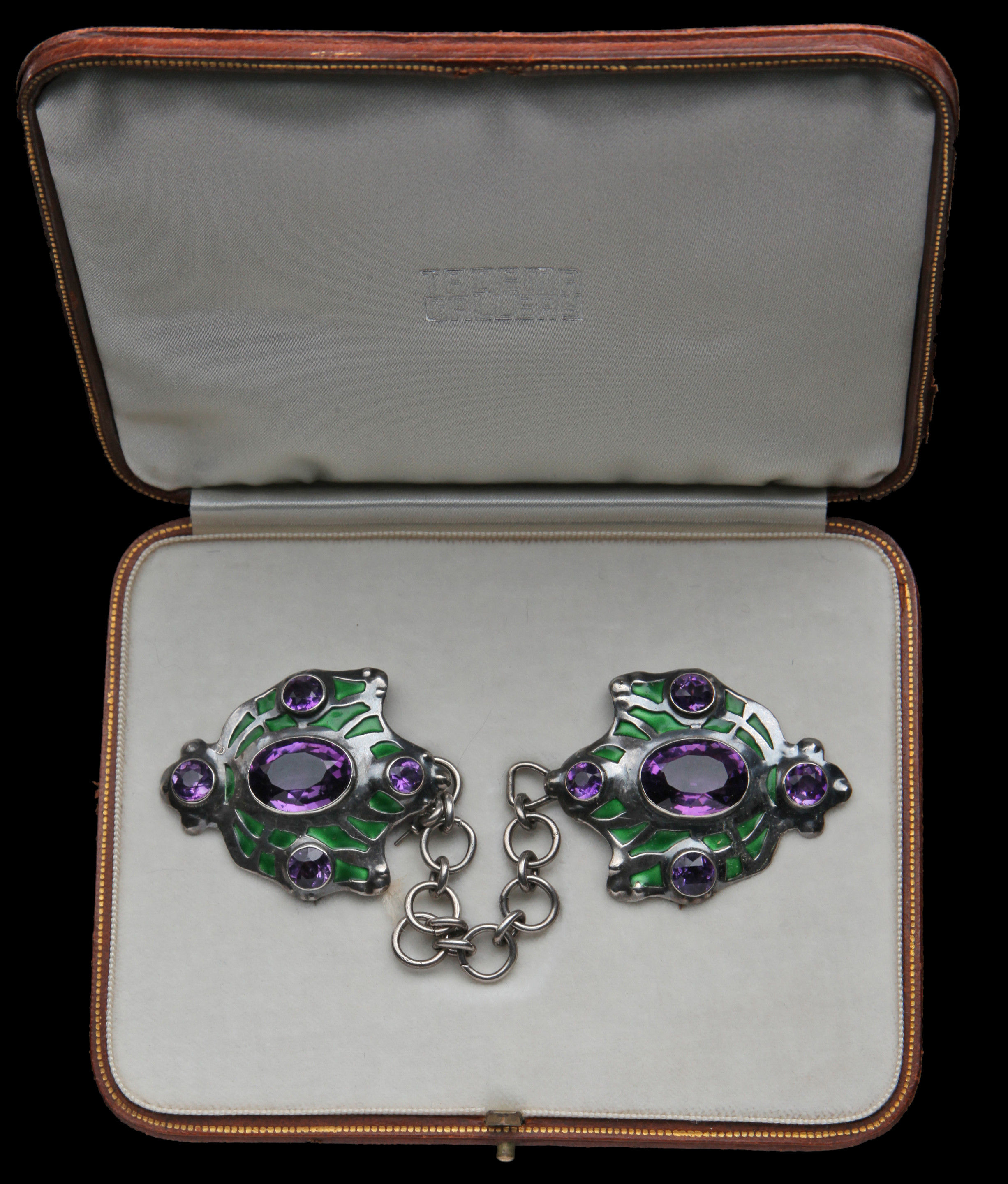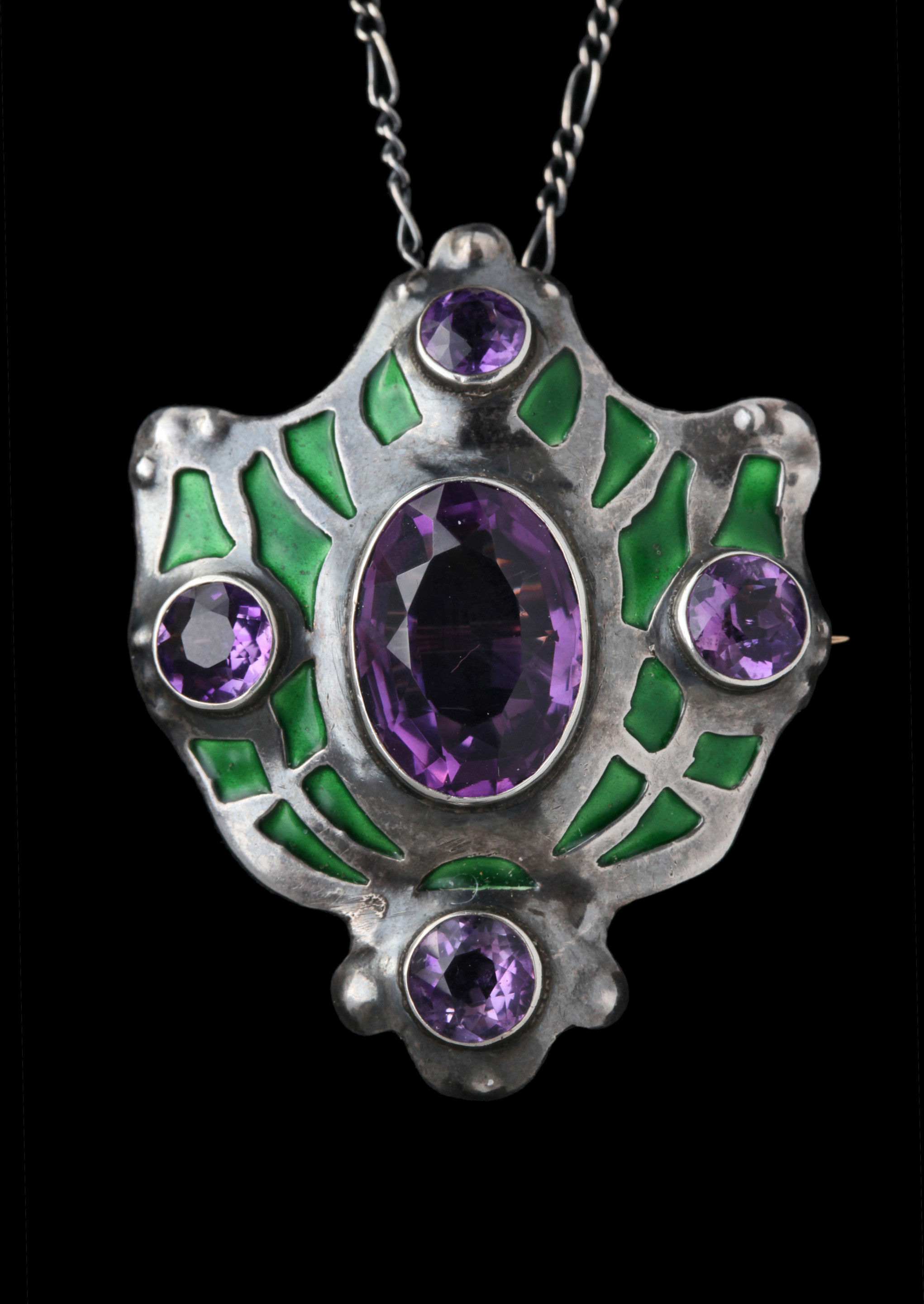 An impressive Arts & Crafts Cloak Clasp attributed to The Guild of Handicraft. Champleve enamel with superb amethysts.