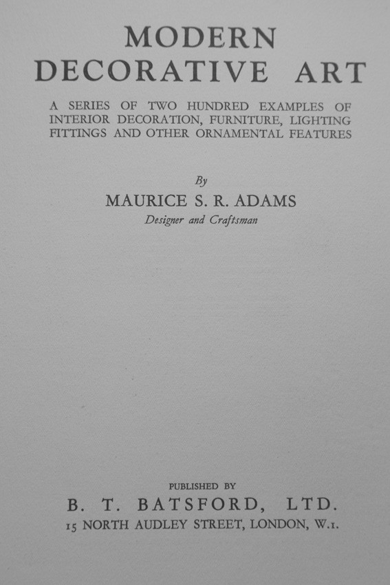 Modern Decorative Art, Maurice S. R. Adams, 1930, A Series of Two Hundres Examples of Interior Decoration, Furniture, Lighting Fittings & other Ornamental Features by Maurice S.R. Adams Designer & Craftsman. Illustrated: p. 66 & 171