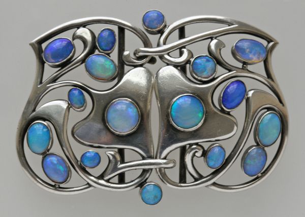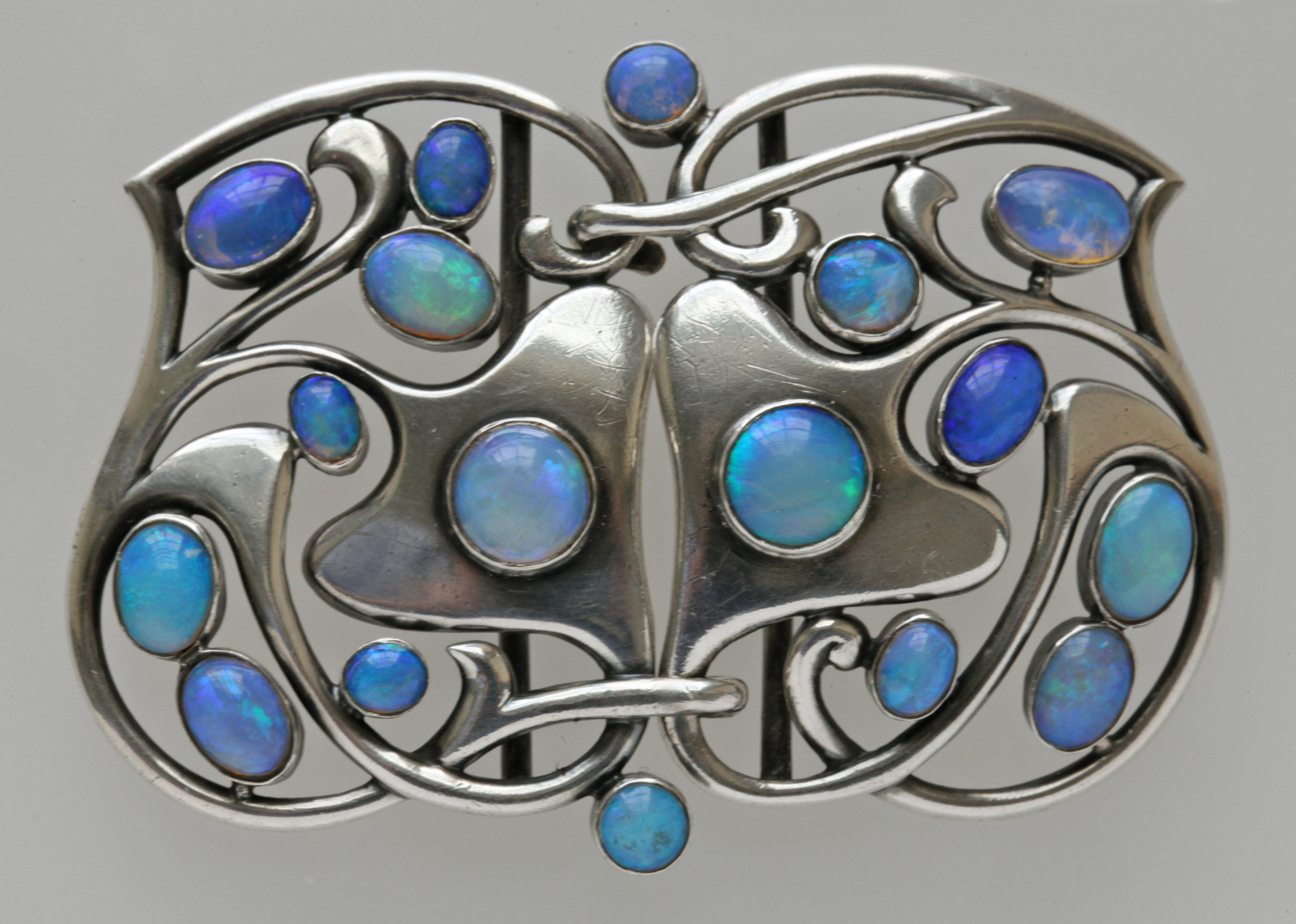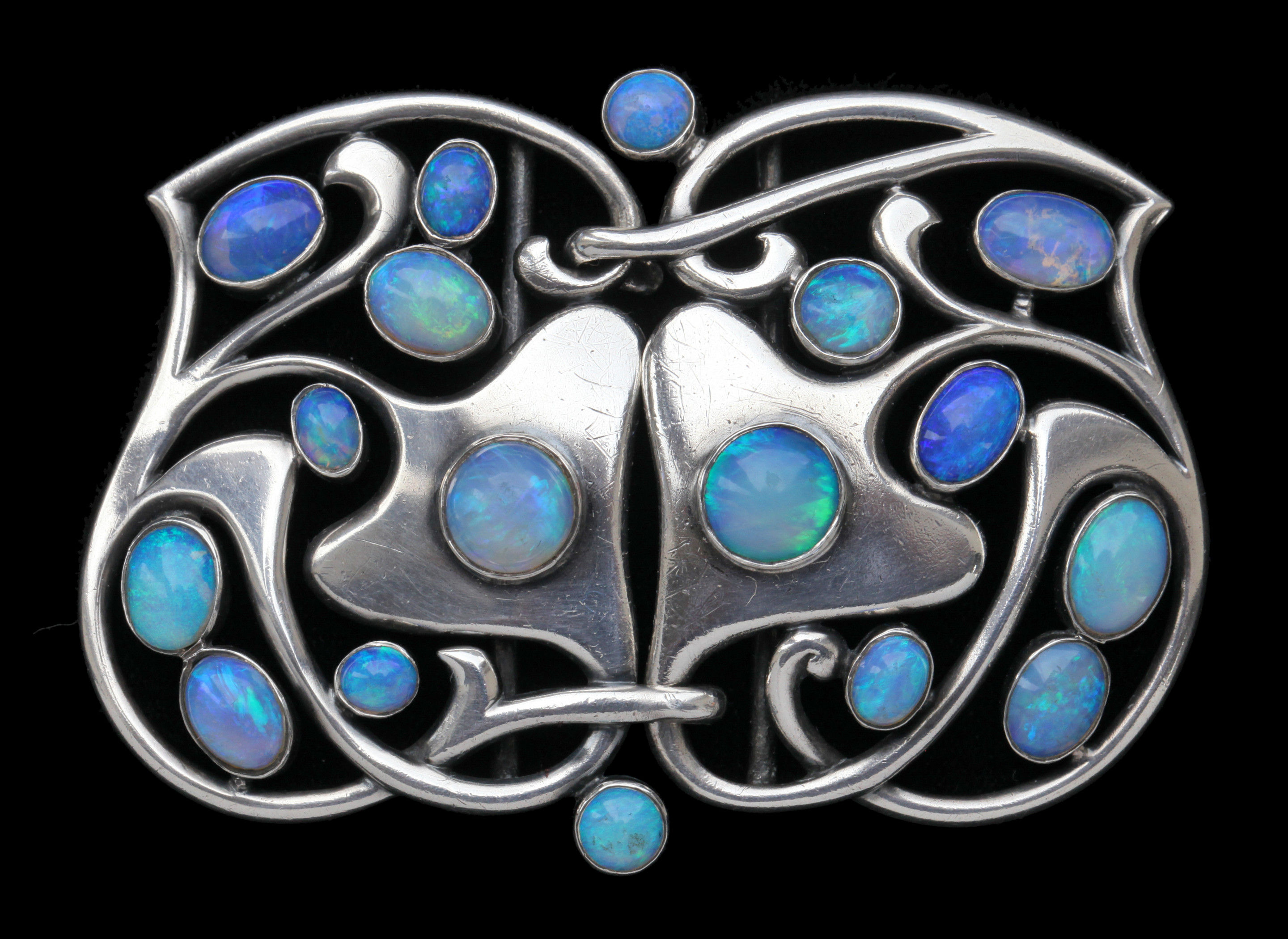 An exceptional Art Nouveau foliate silver buckle by Murrle Bennett & Co set with an abundant selection of beautiful opals.