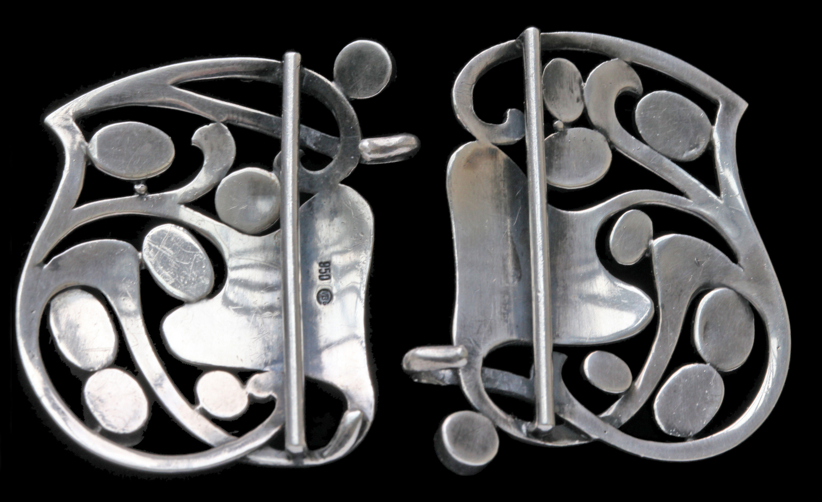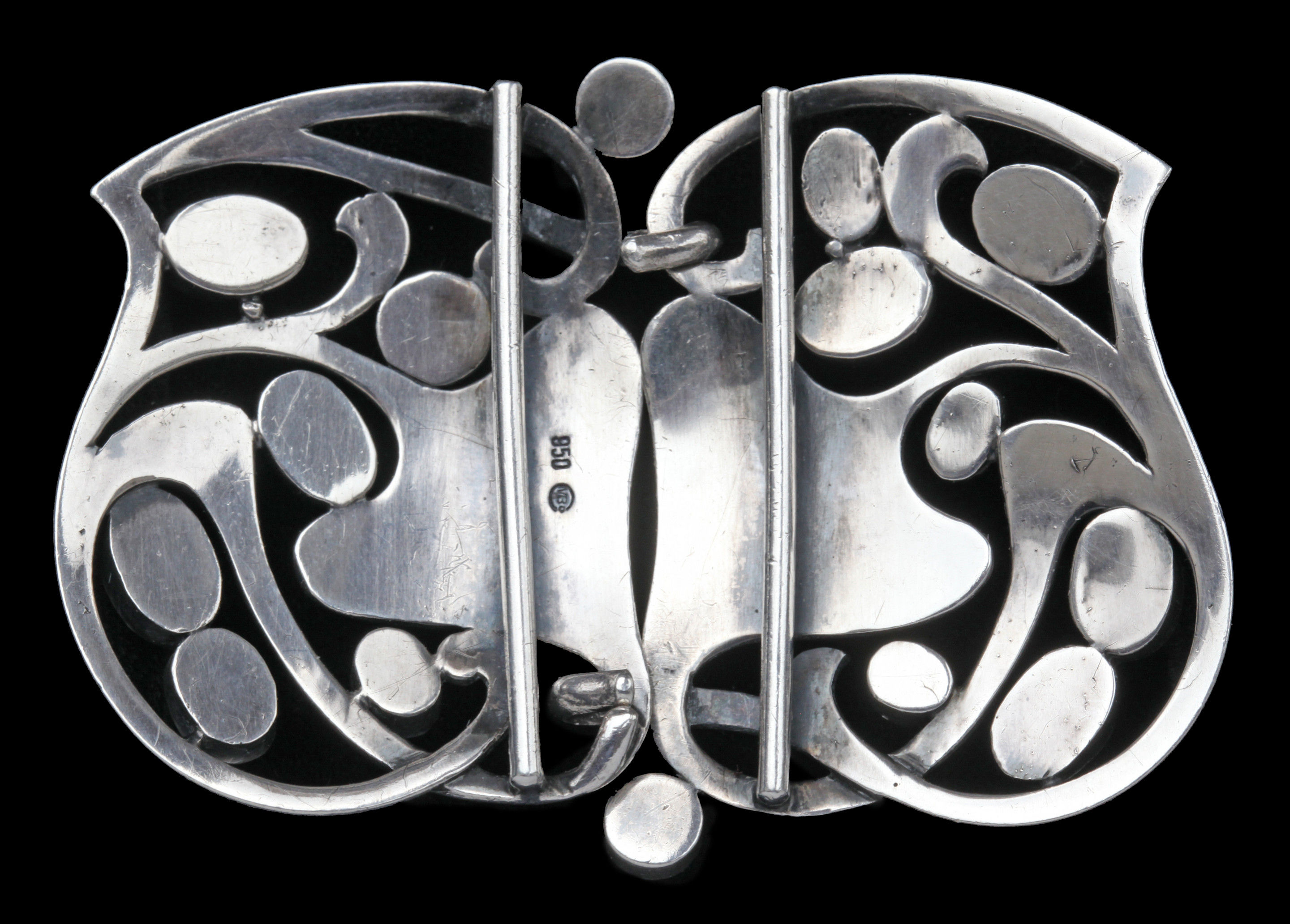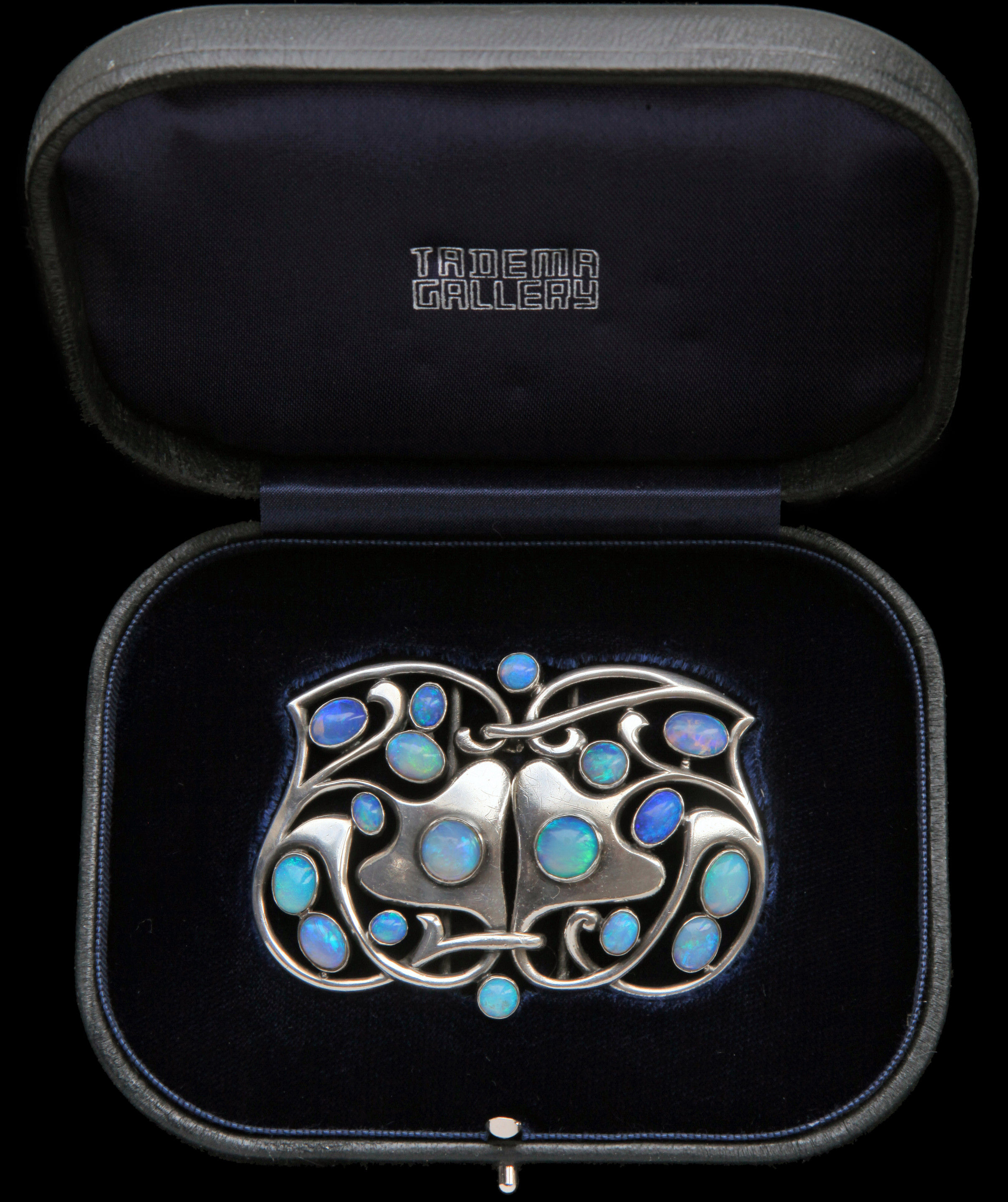 An exceptional Art Nouveau foliate silver buckle by Murrle Bennett & Co set with an abundant selection of beautiful opals.