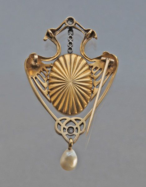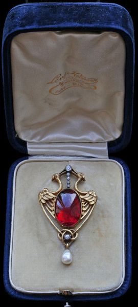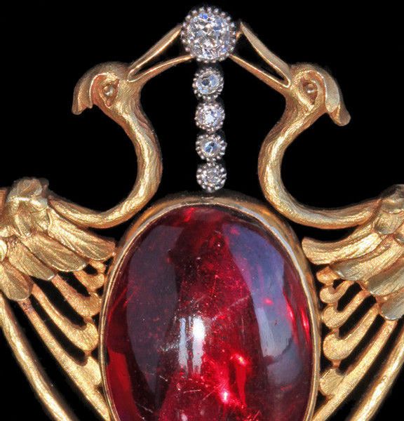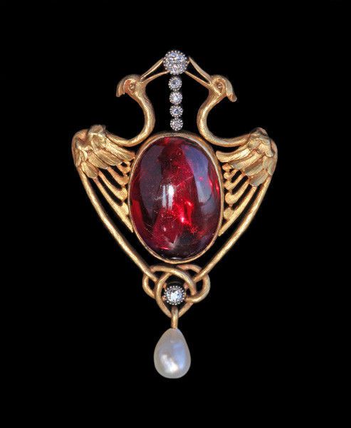 The cabochon cut garnet flanked by two cranes. Studded with brilliant cut diamonds and a drop-shaped pearl