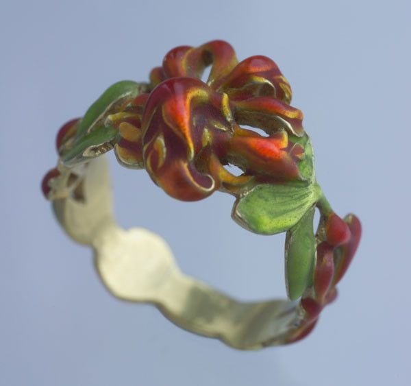 A beautiful Honeysuckle ring attributed to Antoine Beaudouin in gold & enamel