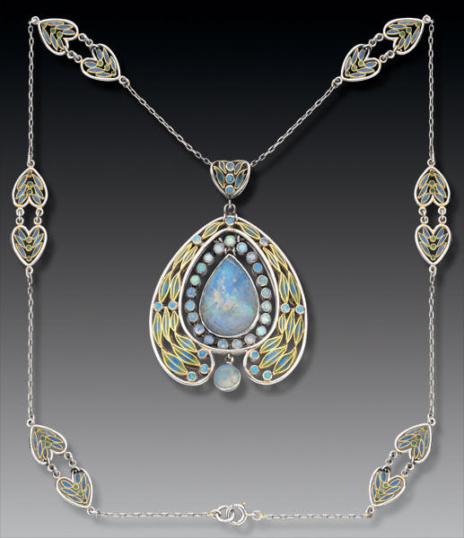 Platinum and gold, set with opals, decorated with plique-à-jour enamelling