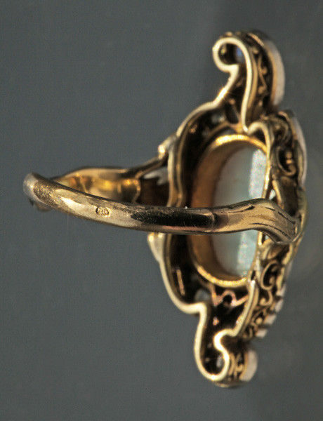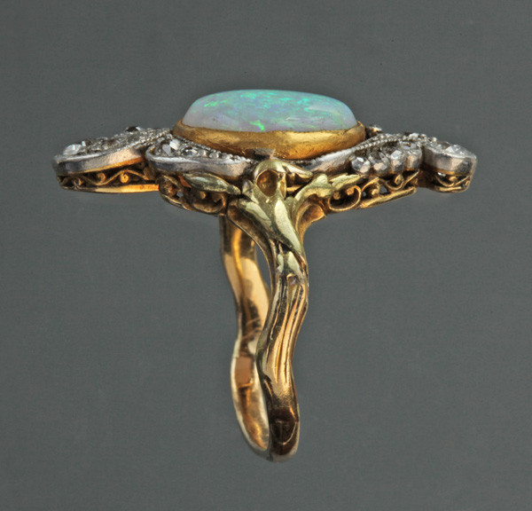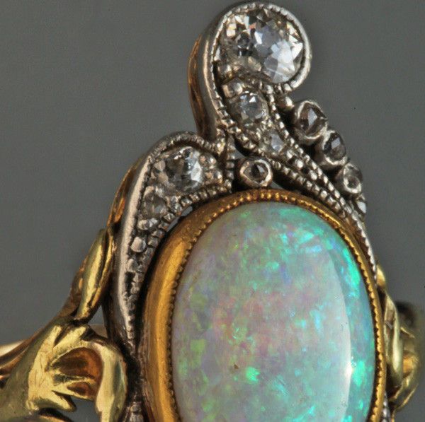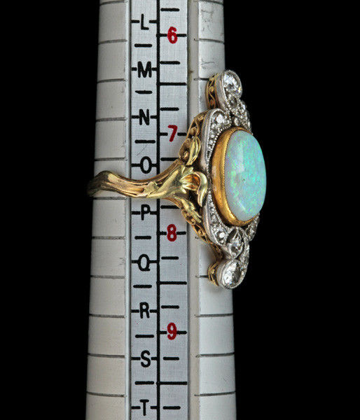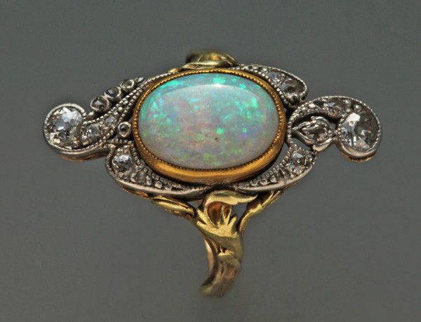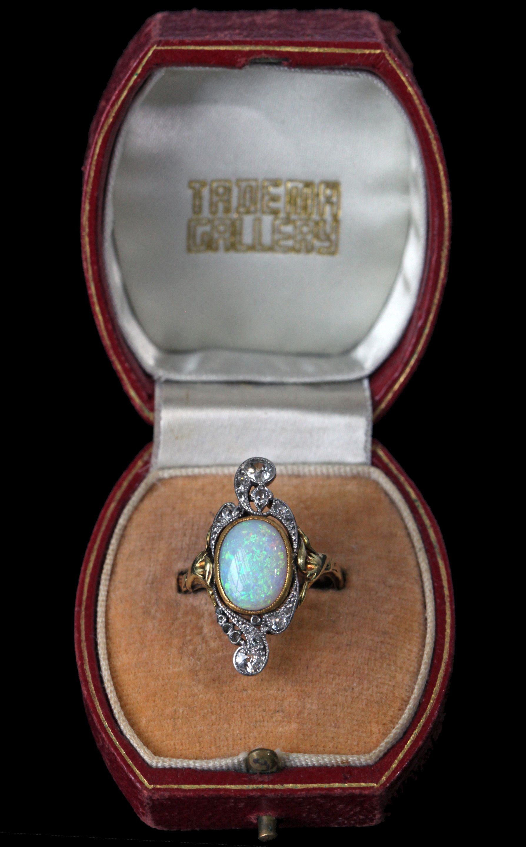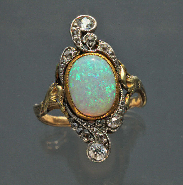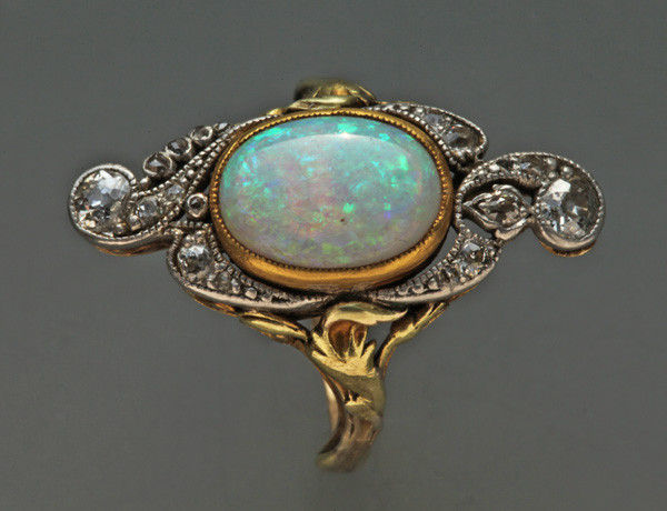 A beautiful Art Nouveau gold, opal & diamond ring 13 old cut diamonds & 4 rose cut diamonds total 0.50 cts approx. Opal size 12 mm x 9 mm approx