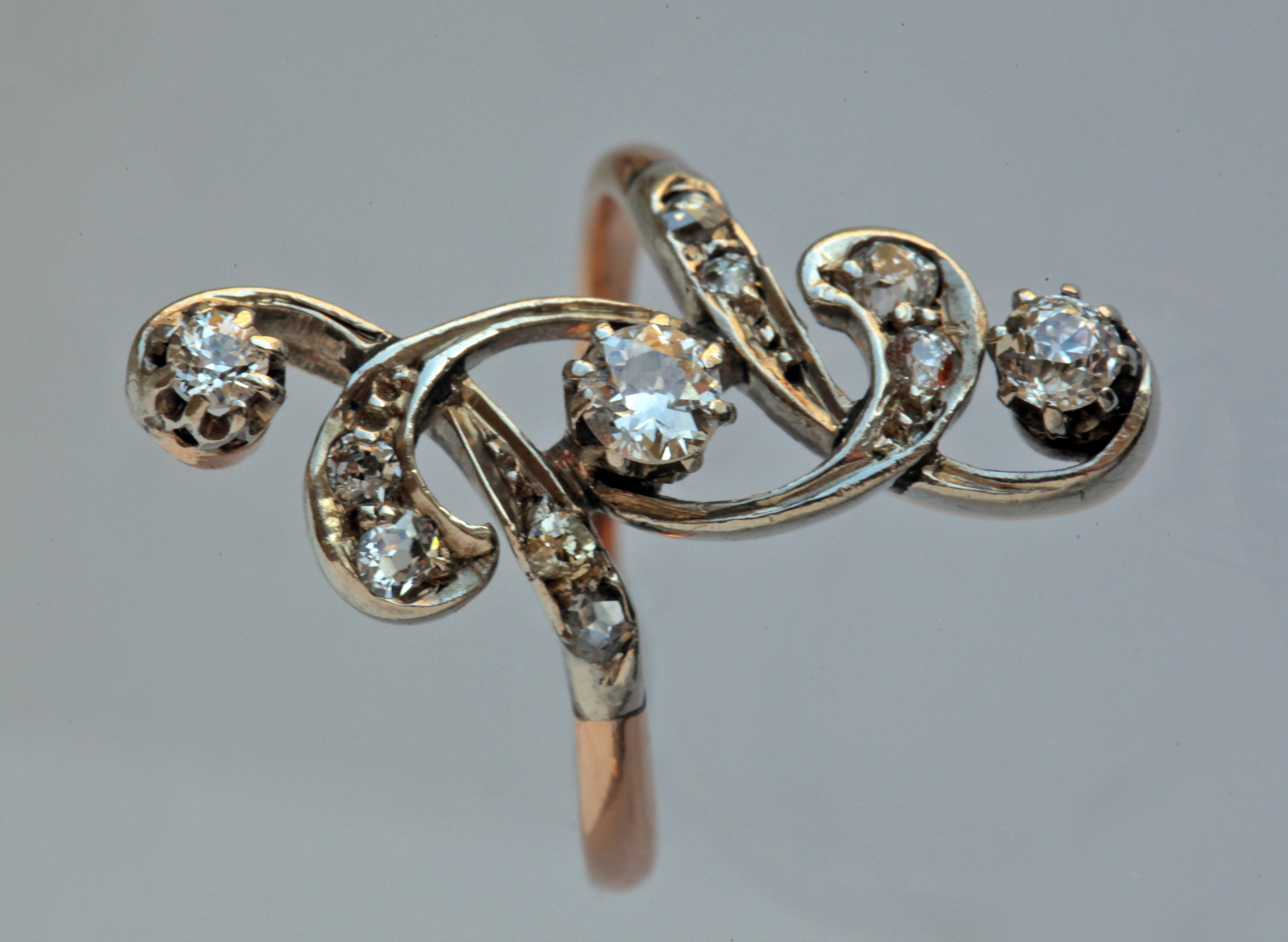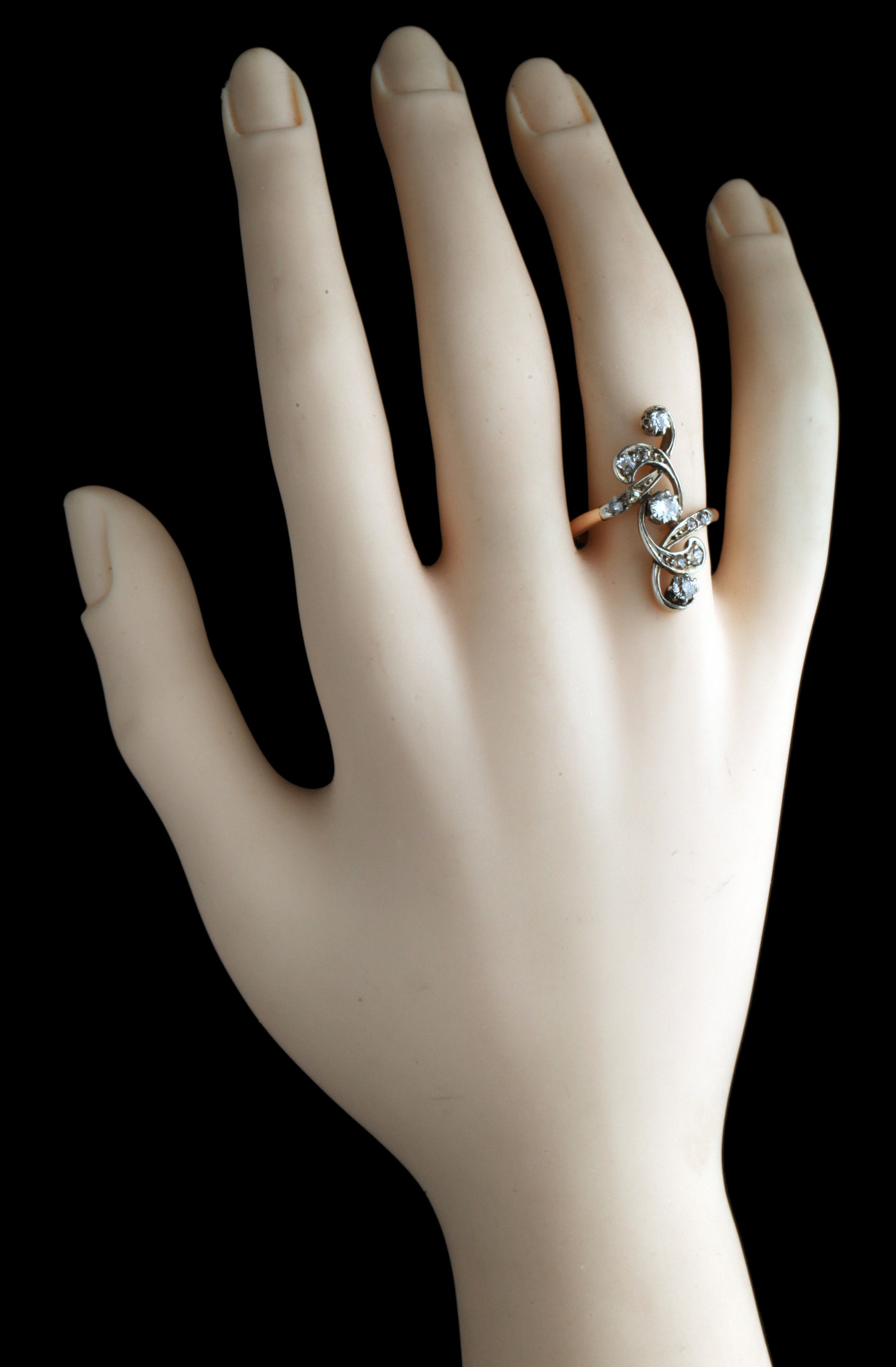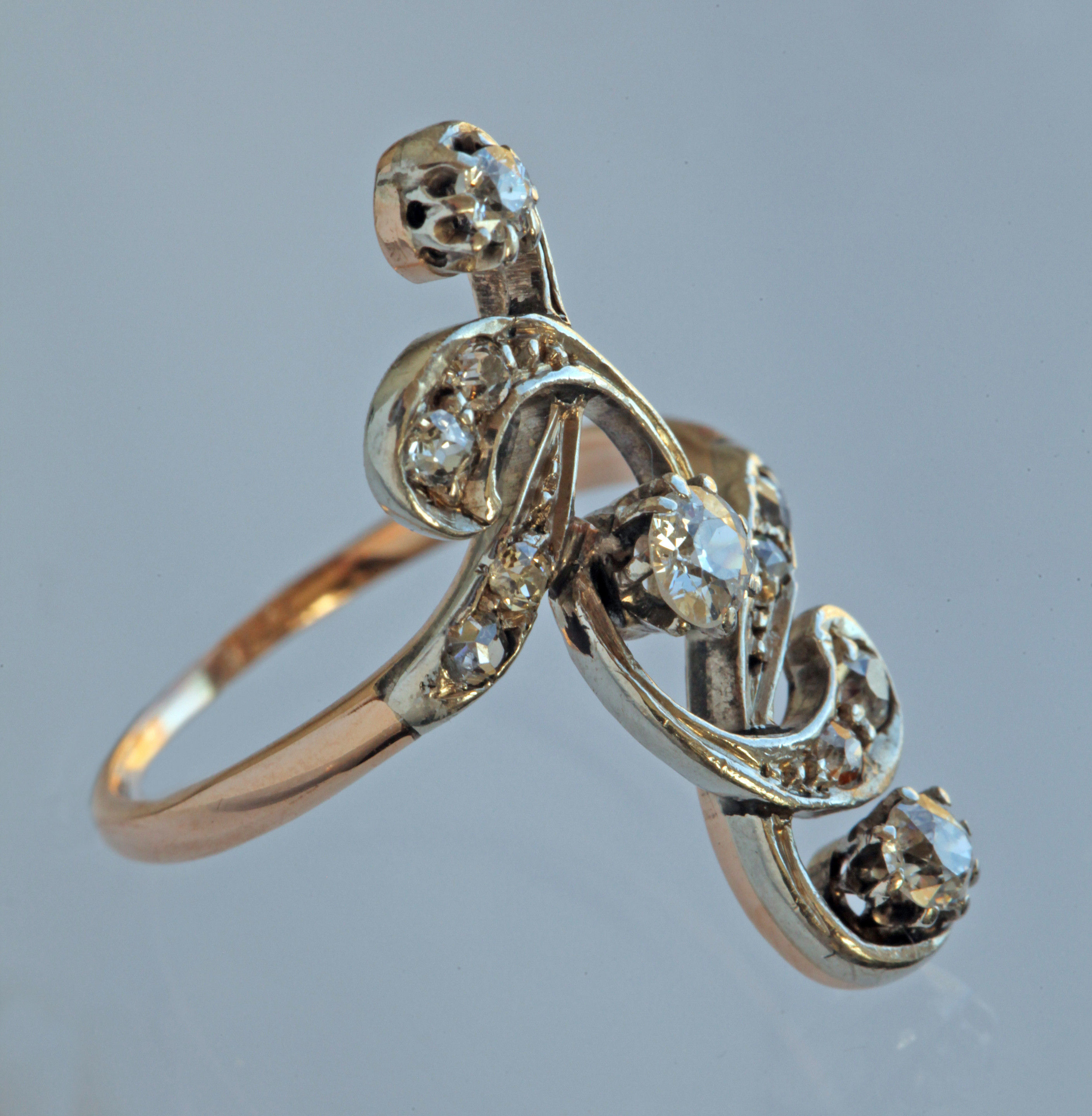 A sinuous Art Nouveau diamond ring probably French Victorian cut diamonds x 10 total 0.30 cts approx.