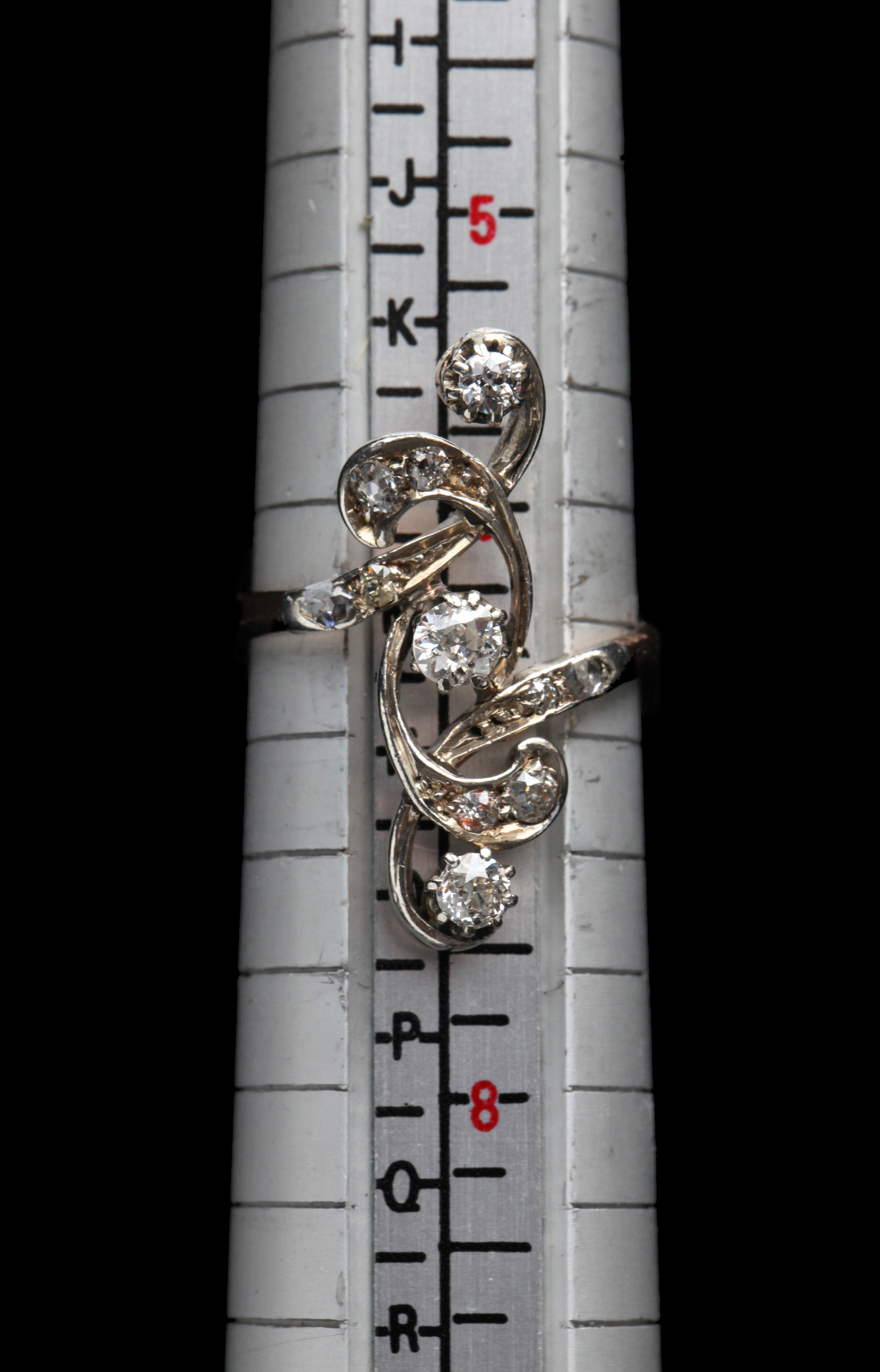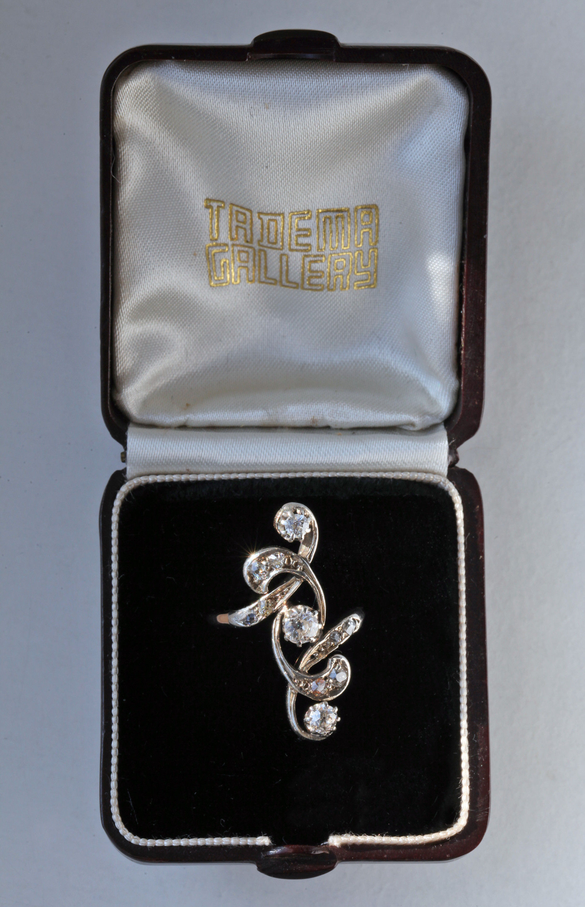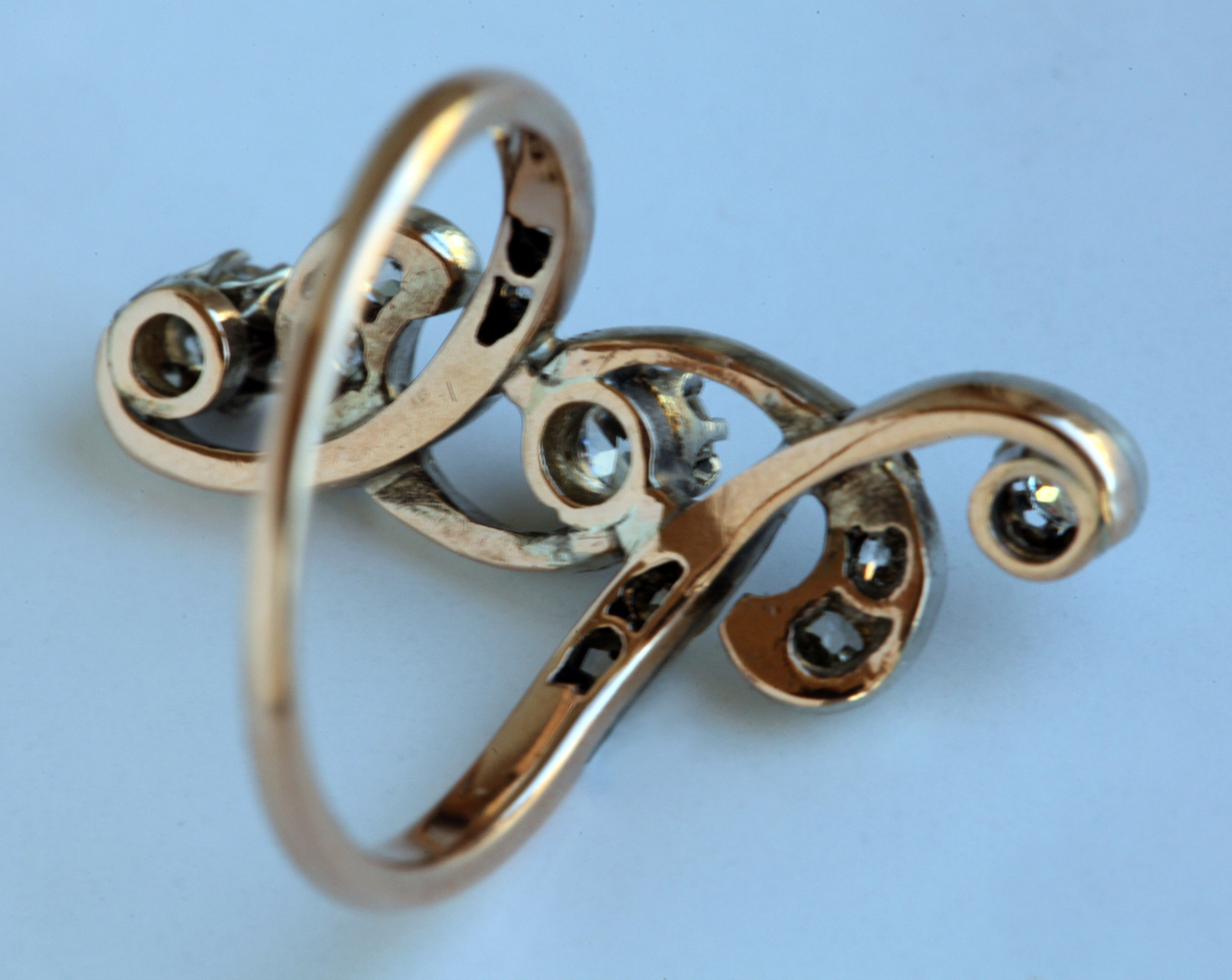 A sinuous Art Nouveau diamond ring probably French Victorian cut diamonds x 10 total 0.30 cts approx.