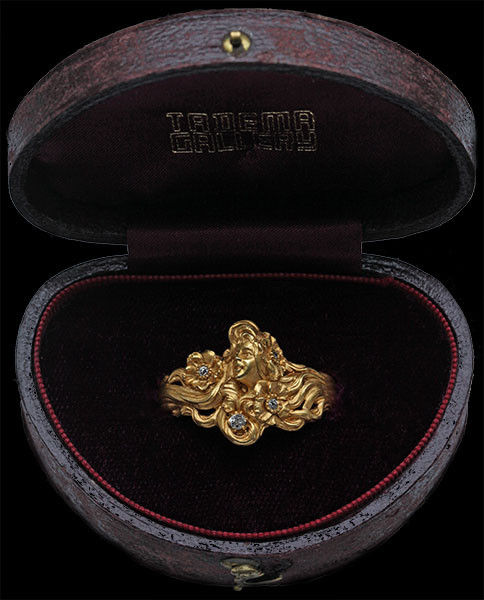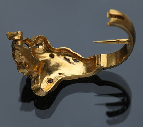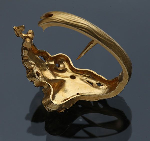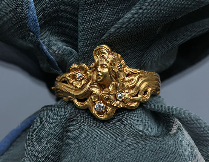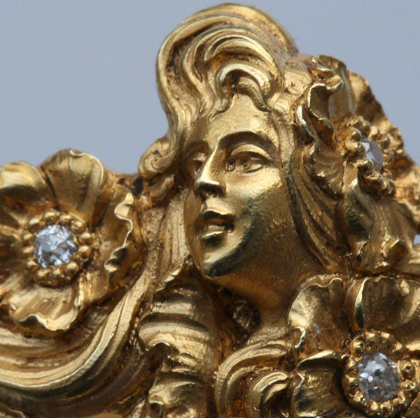 Plisson et Hartz were an important jewellery firm specialising in Art Nouveau pieces made of gold and exquisitely chased, as in this jewel. The combination with diamonds as highlights is typical of their work. Their designs have a sculptural feel. The female face was indicative of the Art Nouveau period and represented the woman in her changing role in society and the awareness of the feminine sensitivity and passion.