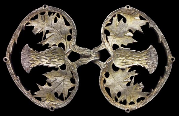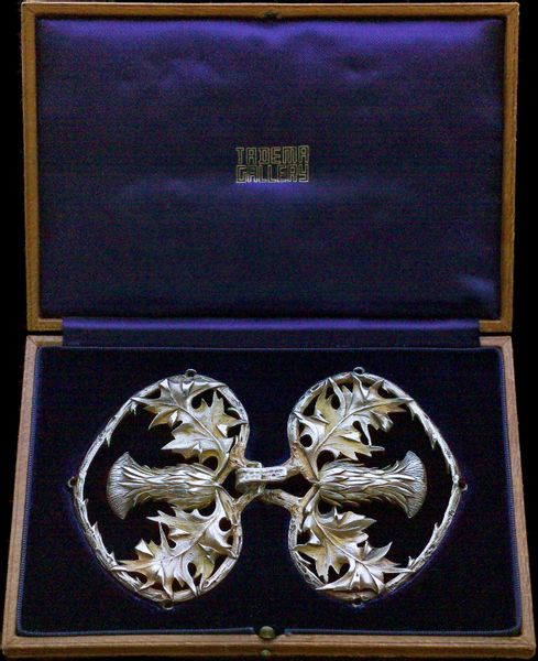This cloak clasp was designed by Ferdinand Erhart, who came from Germany, but was retailed by Maison Vever, Paris, according to the hallmarks. Little is known about his life, yet according to Rolende van Strydonck de Burkel, Le Bijou Art Nouveau en Europe, Paris 1998, p.110, it was Vever who in 1900 had discovered Erhart's talent. A further example of this buckle was also retailed through Cartier Paris, cf. Cartier 1899-1949, Le parcours d'un style, Lisbon, Calouste Gulbenkian Foundation, colour plate 1. In the literature the dates for this buckle design vary from 1895-1908. Erhart is mainly known for his buckles in chased silver with foliage and floral motifs.e