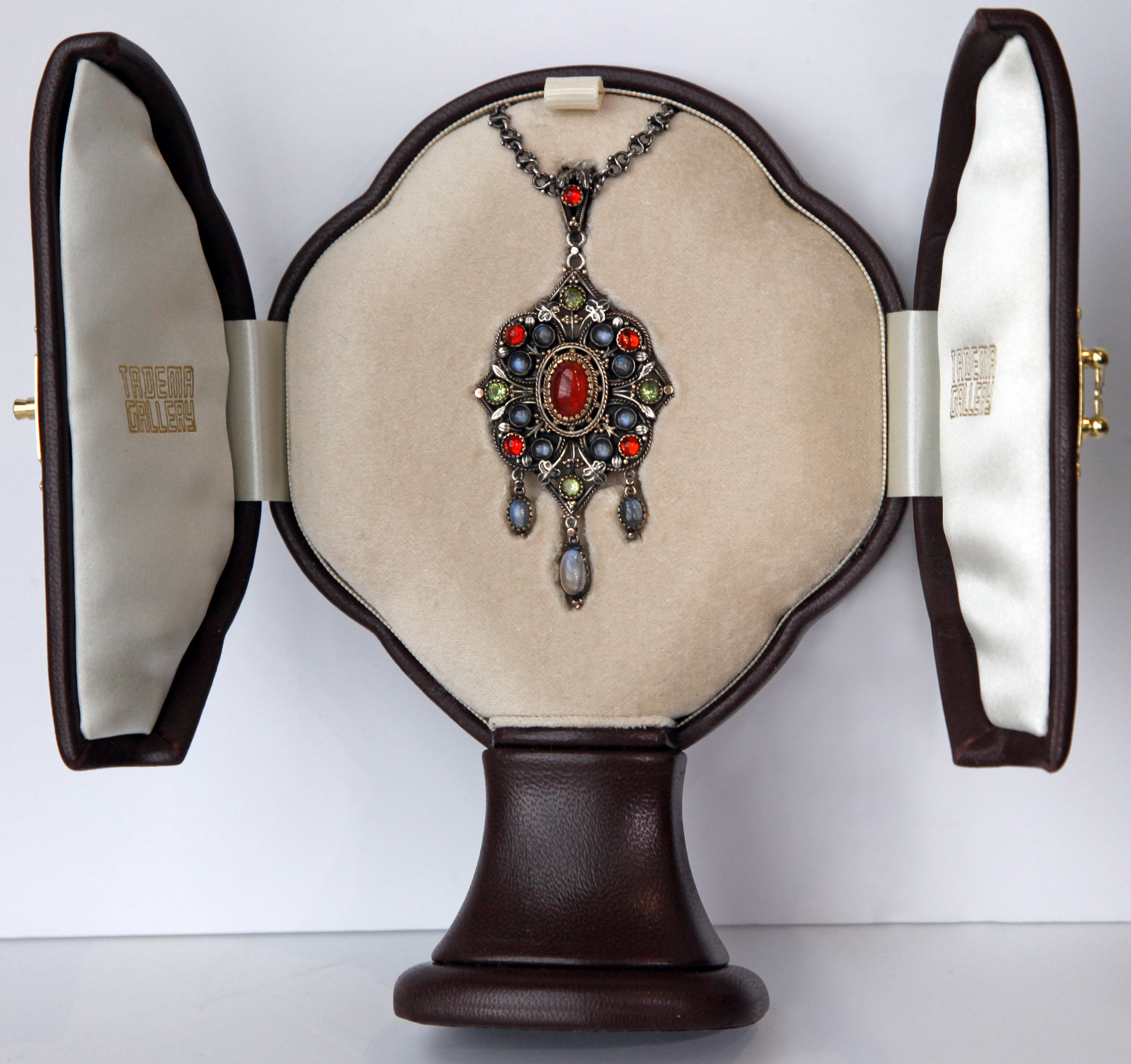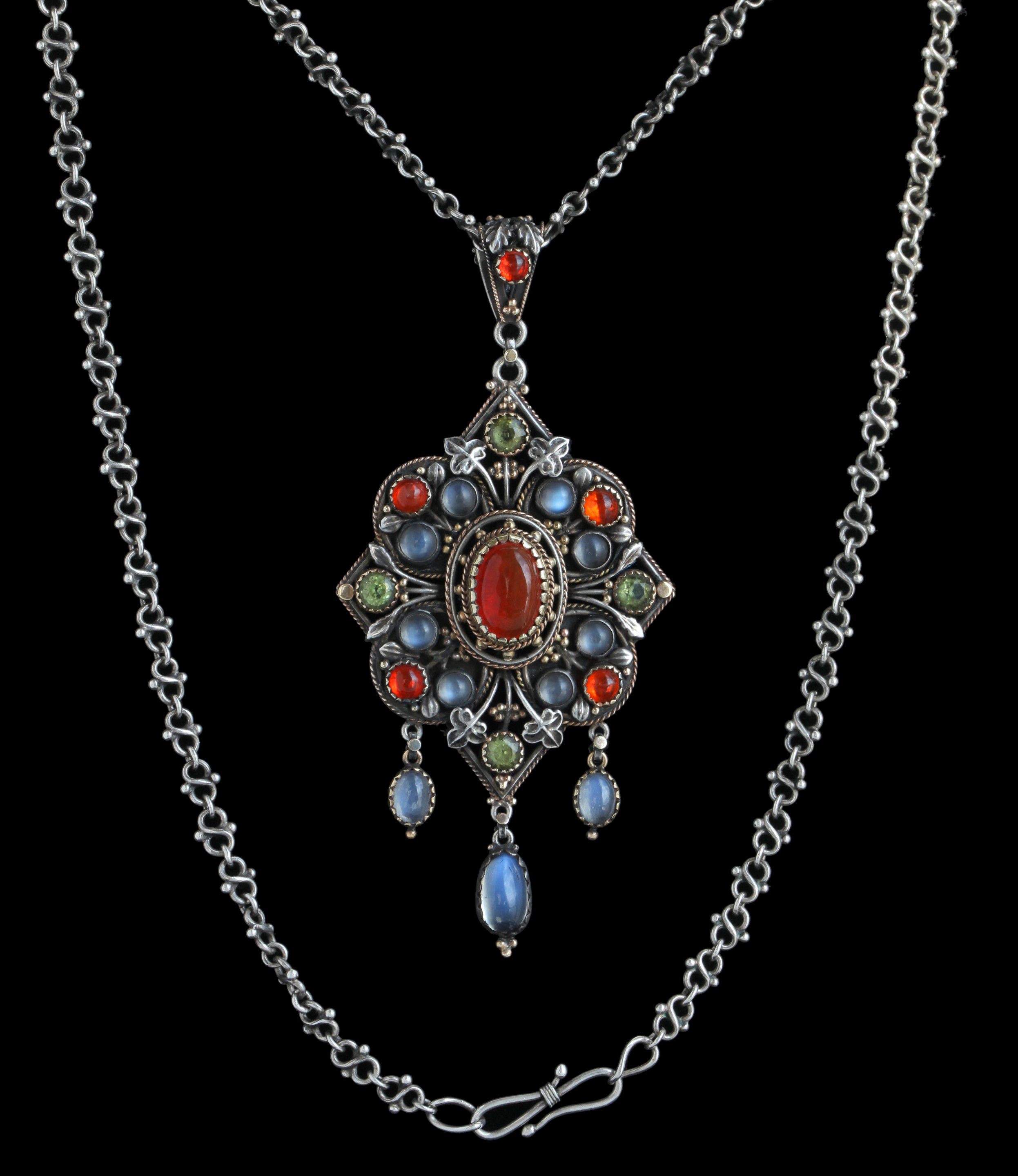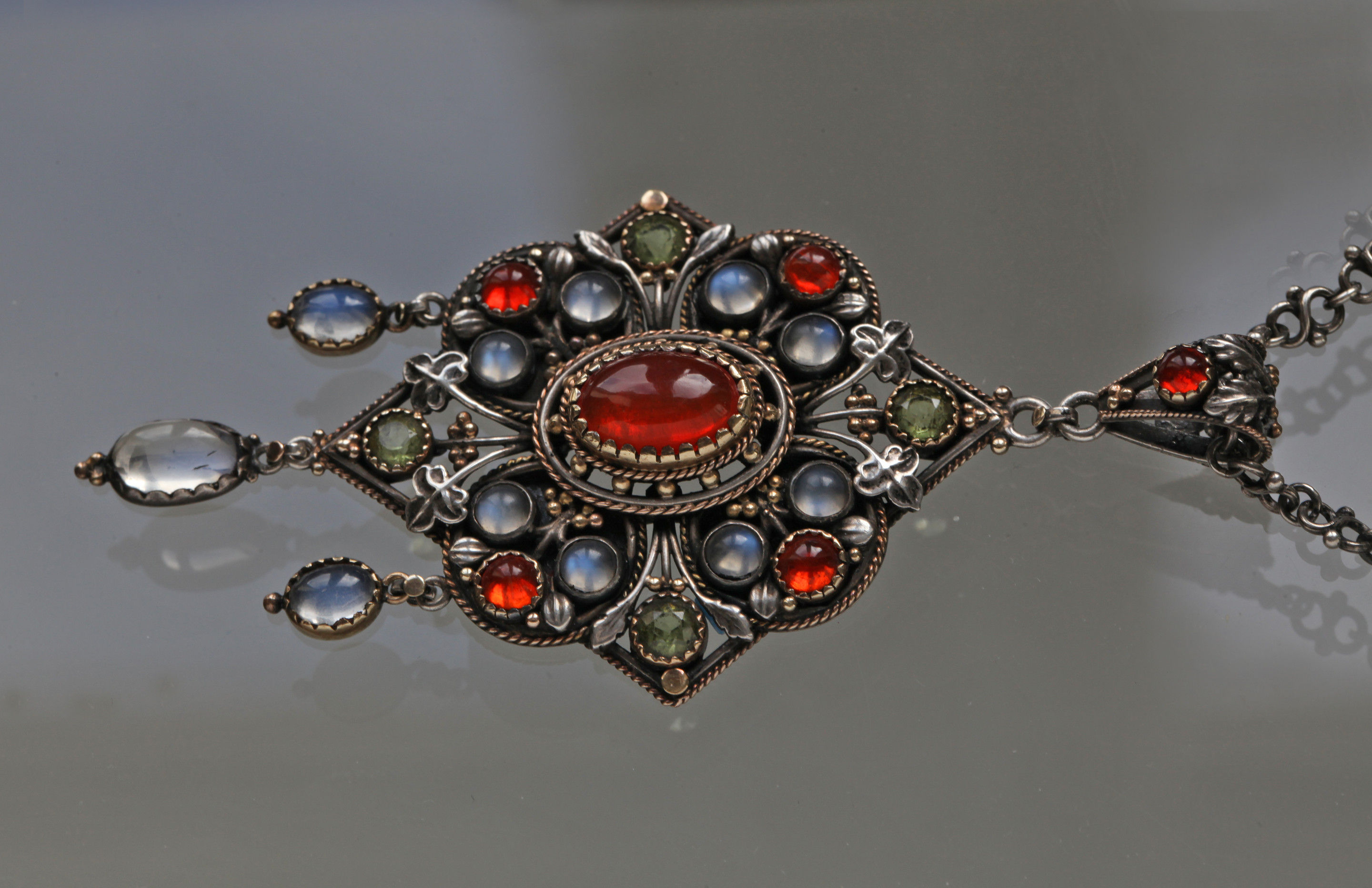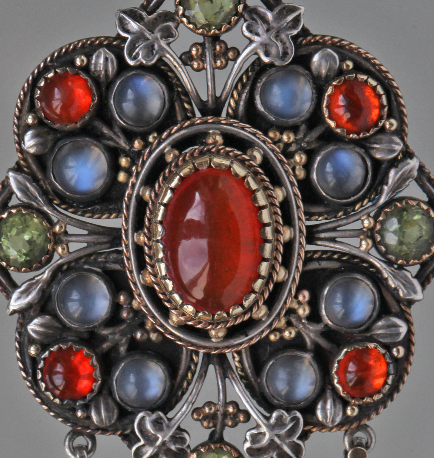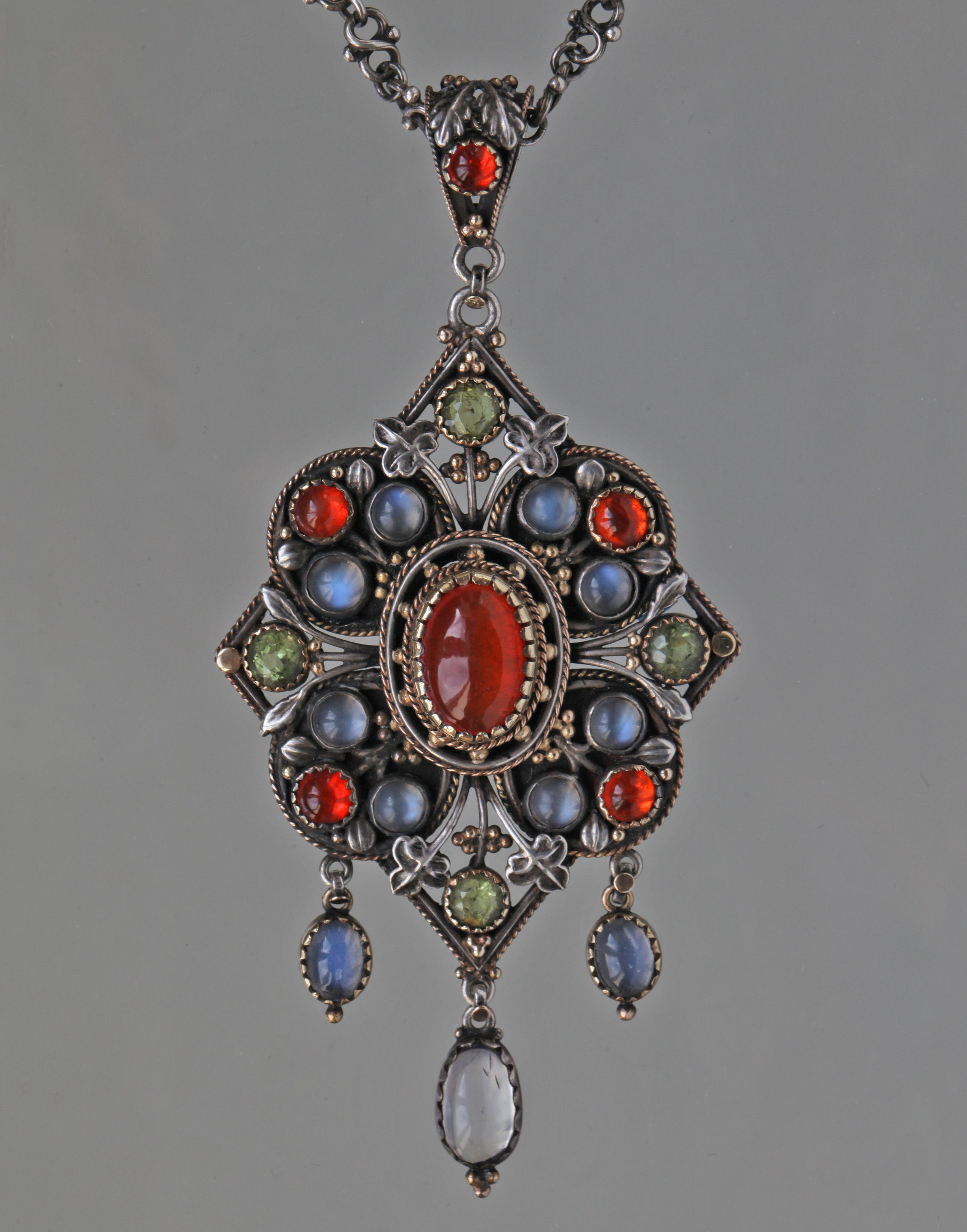This silver & gold pendant is of Puginesque Gothic form, incorporating a quatrefoil against a diamond shaped frame with cabochon fire opals, moonstones & peridots set with delightful Gothic leafage.