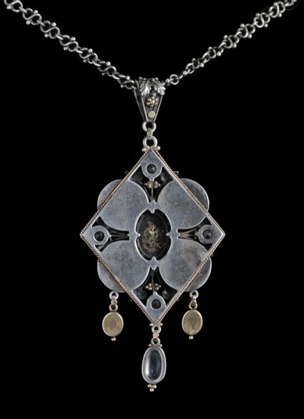 This silver & gold pendant is of Puginesque Gothic form, incorporating a quatrefoil against a diamond shaped frame with cabochon fire opals, moonstones & peridots set with delightful Gothic leafage.