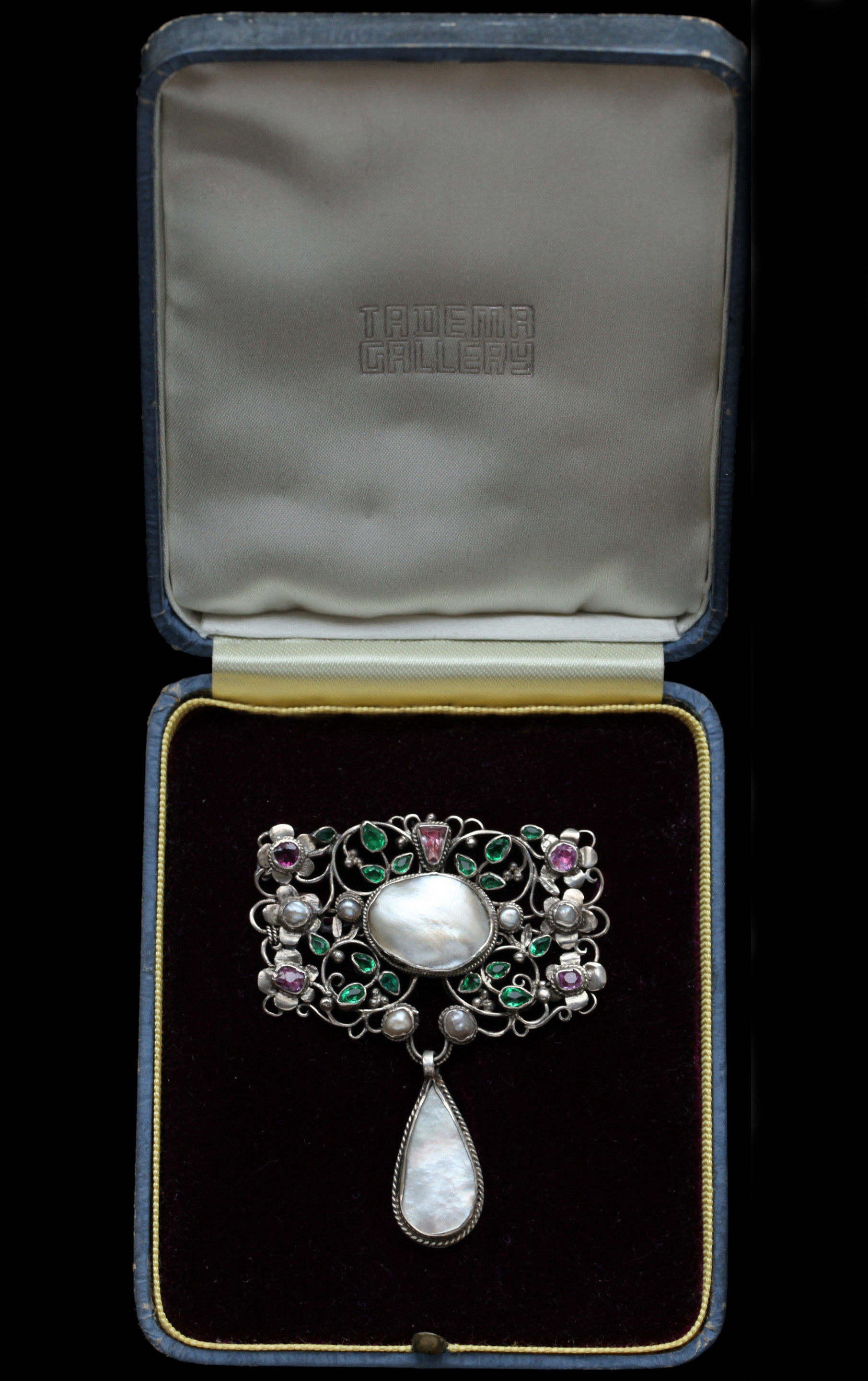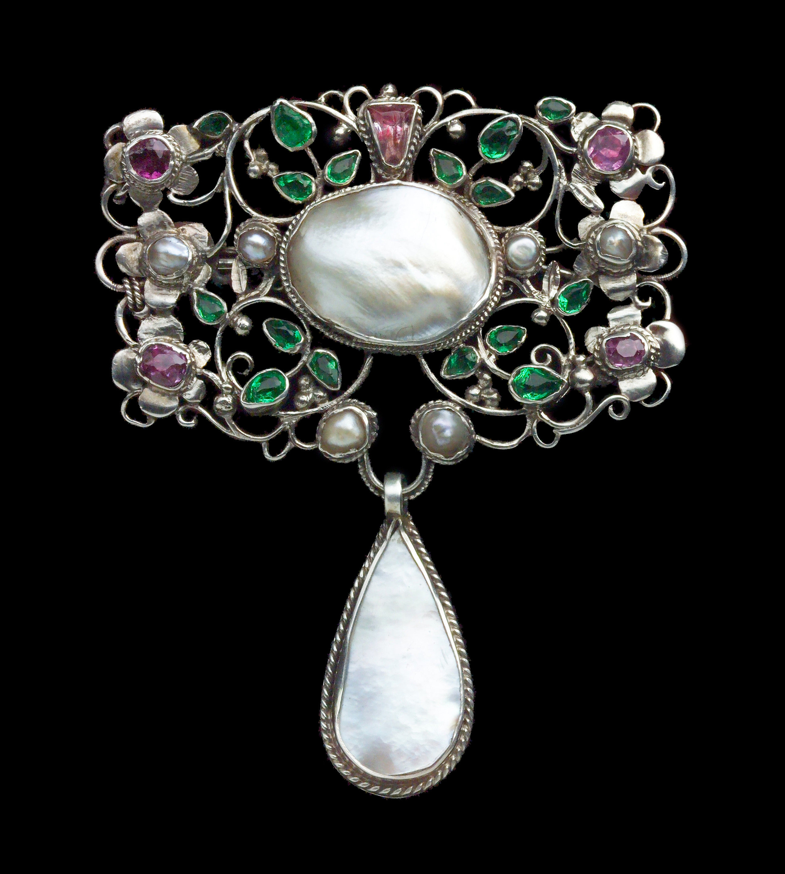 This Briar Rose pendant/brooch by the Gaskins has a lively design of roses & leaves set off by beautiful blister pearls.