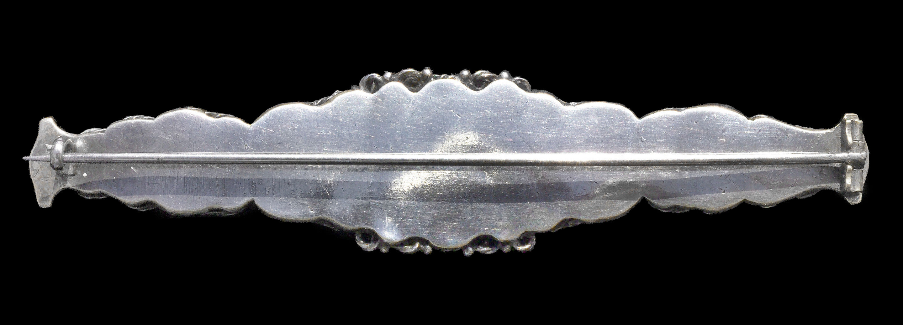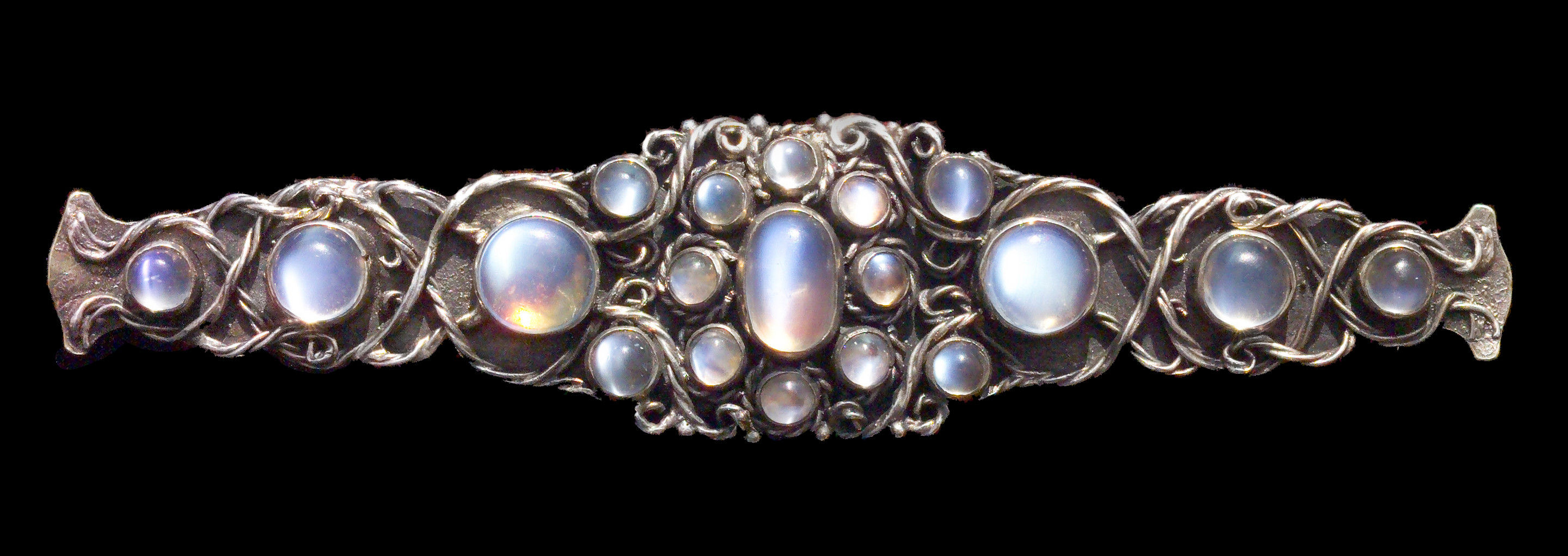 Unusual long Arts & Crafts brooch with pretty moonstones.