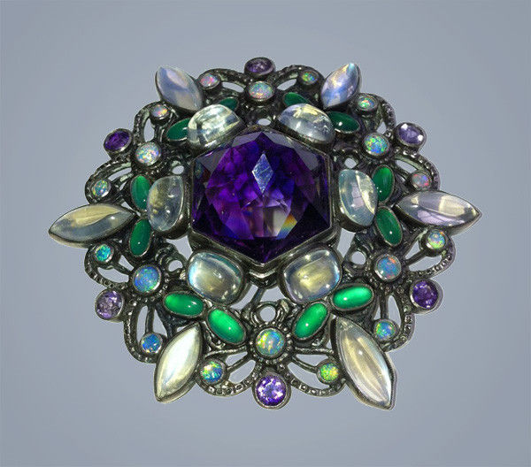 Silver, amethyst, moonstone, chalcedony, opal