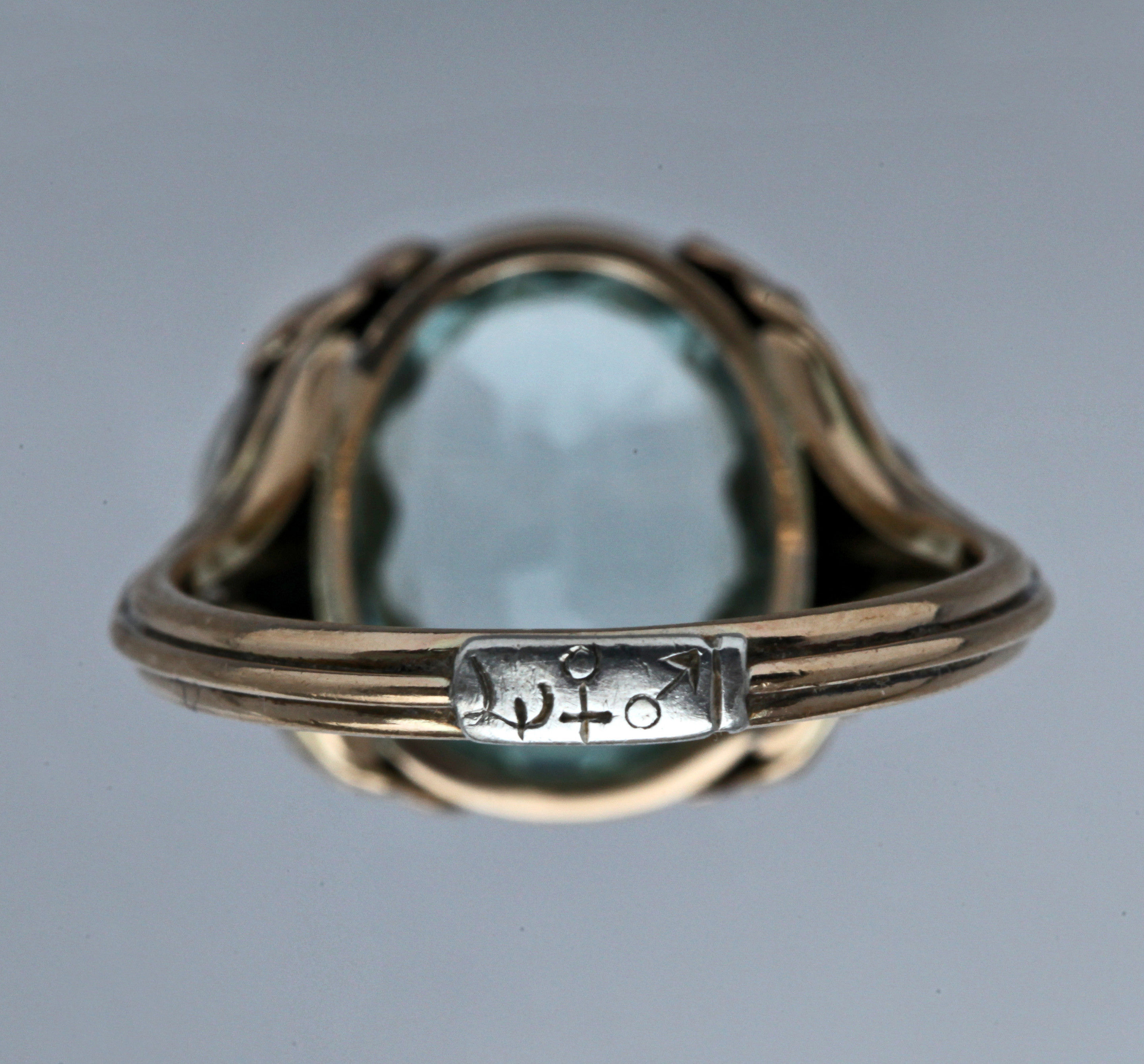 Romantic Arts & Crafts ring with with symbols of grapes & a rose. Hieroglyphic style cartouche containing the planetary symbols of Jupiter, Venus & Mars.