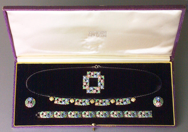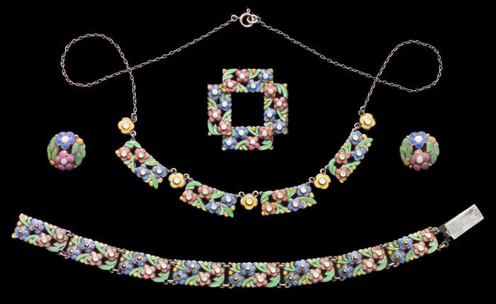 Brooch H: 3.2 cm W: 3.2 cm, Earrings Diameter: 1.5 cm Necklace H: 1 cm W: 41.5 cm, Bracelet H: 1 cm W: 17.5 cm