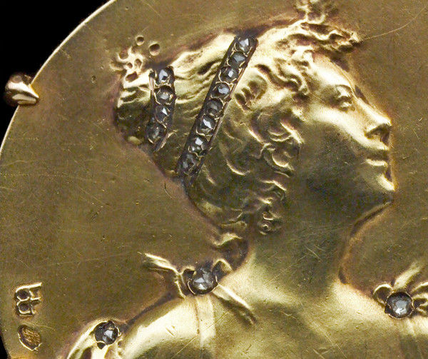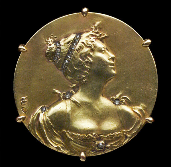 Comte d' Epinay de Briort - Art Nouveau Brooch depicting a young woman with diamonds in her hair & dress