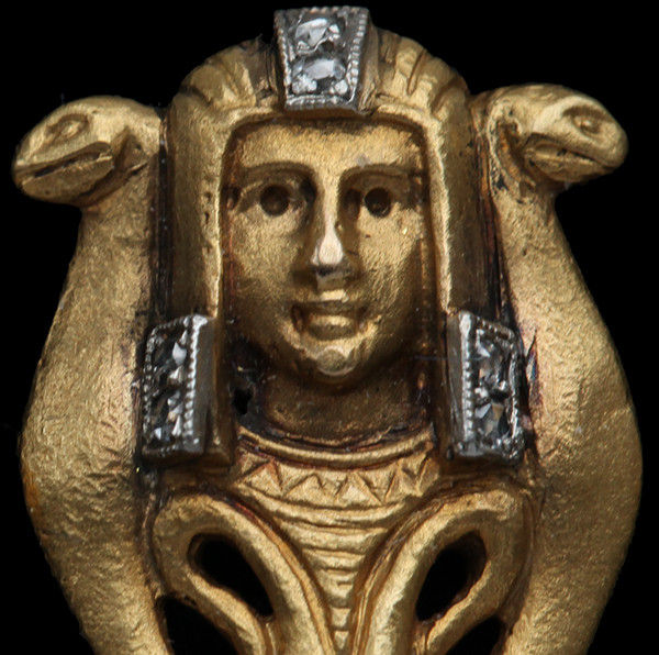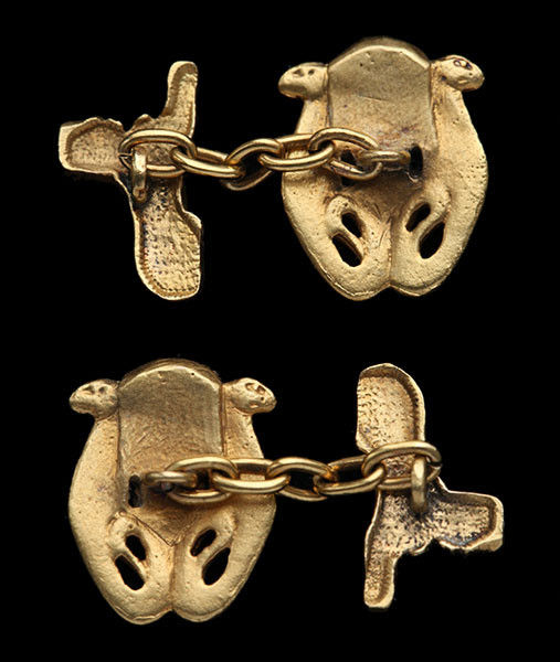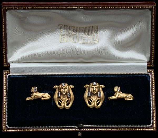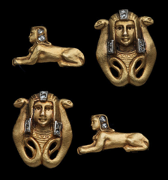 A Mannerist example of Egyptian Revival Cufflinks. They are probably unique, as the technique used for their manufacture required the destruction of the carved wax model in the casting process. Ancient Egyptian gold artefacts & Benin bronzes were made in the same way.