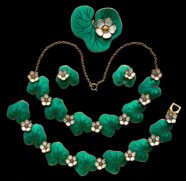 Brooch length: 4.3 cm (1.7 in) Earrings length 2.2 cm (0.9 in) Width: 2.2 cm (0.9 in) Necklace length: 37.5 cm (14.7 in) Width: 2.3 cm (0.9 in) Bracelet length: 18 cm (7 in) Width: 2.2 cm (0.8 in)