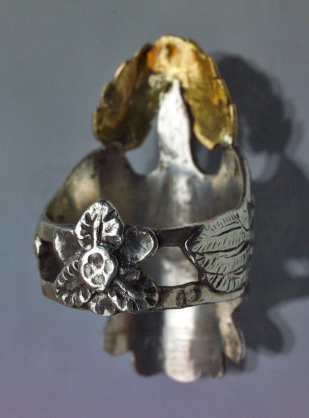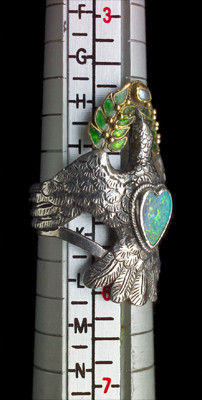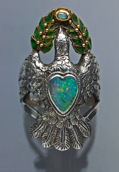 The Dove of Peace ring with enamelled olive branch surmounted by an opal heart possibly by Henry Wilson