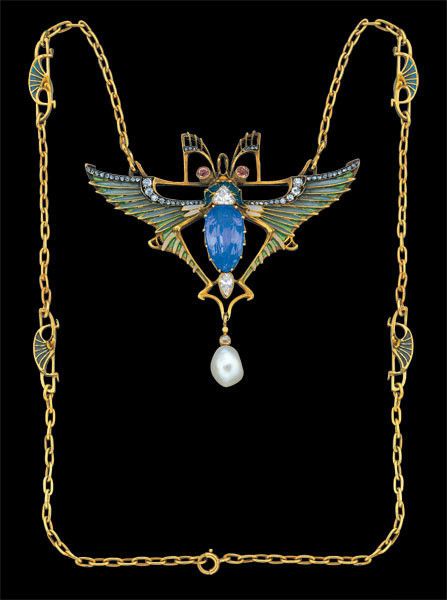 A fantastically creative version of an ancient Egyptian winged scarab amulet. The gold chain is intersperced with matching plique-à-jour lotus flowers. Designed by Leopold Gautrait & made by Leon Gariod.
