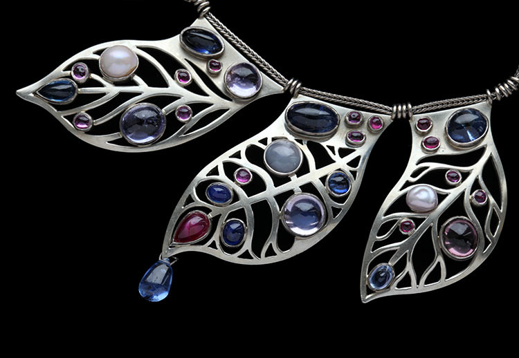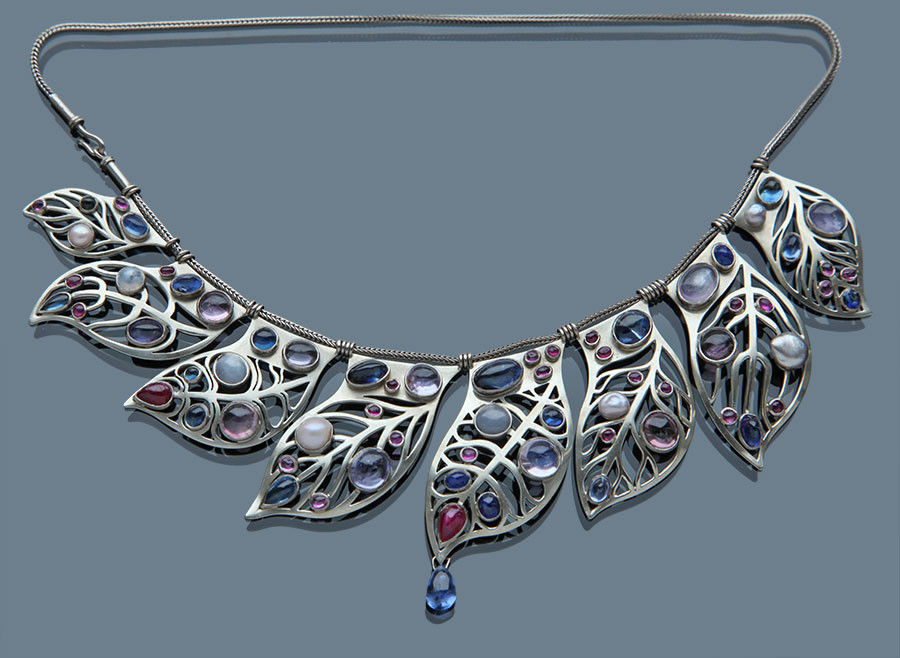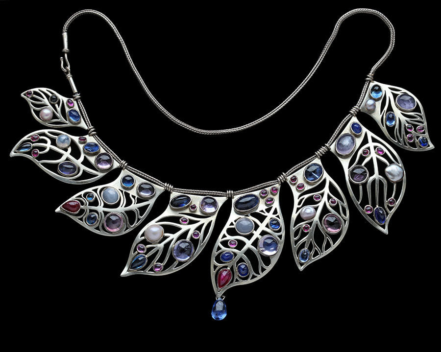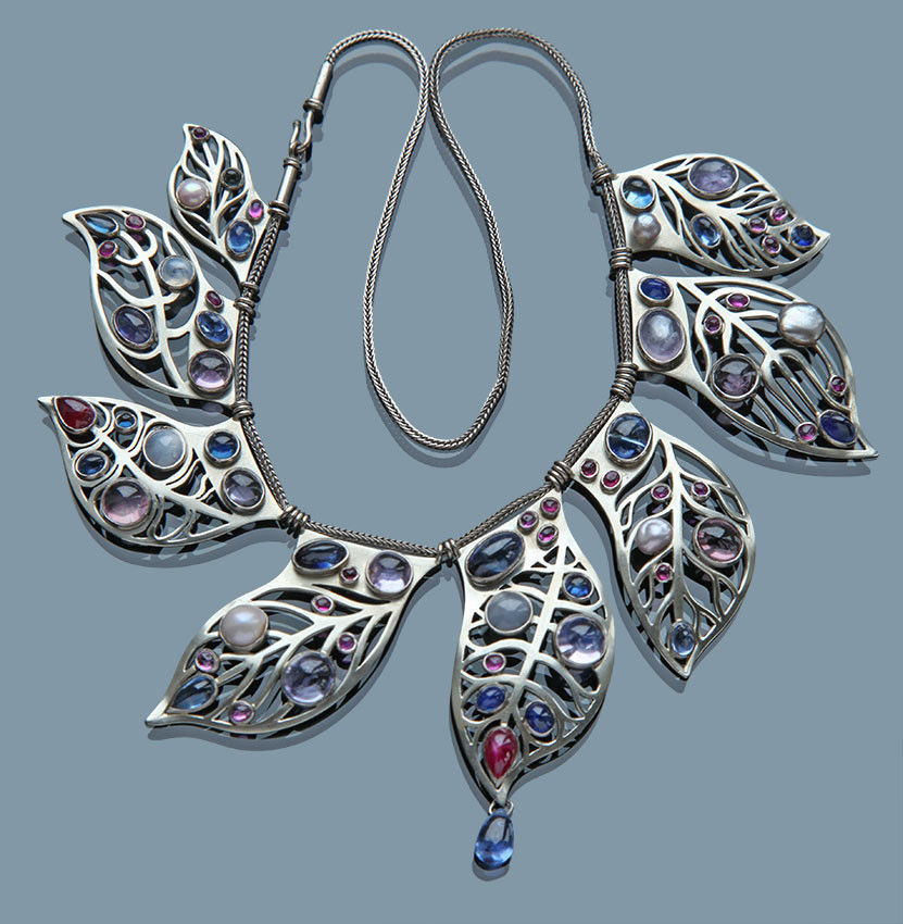 The stylised leaves set with 32 cabochon sapphires of varying shapes and colours 10.00cts approx & 28 cabochon rubies 3.80cts approx. 5 pearls of various shapes and colours