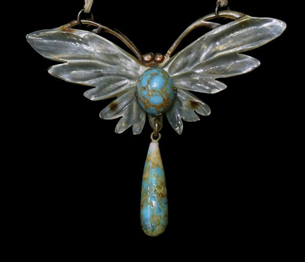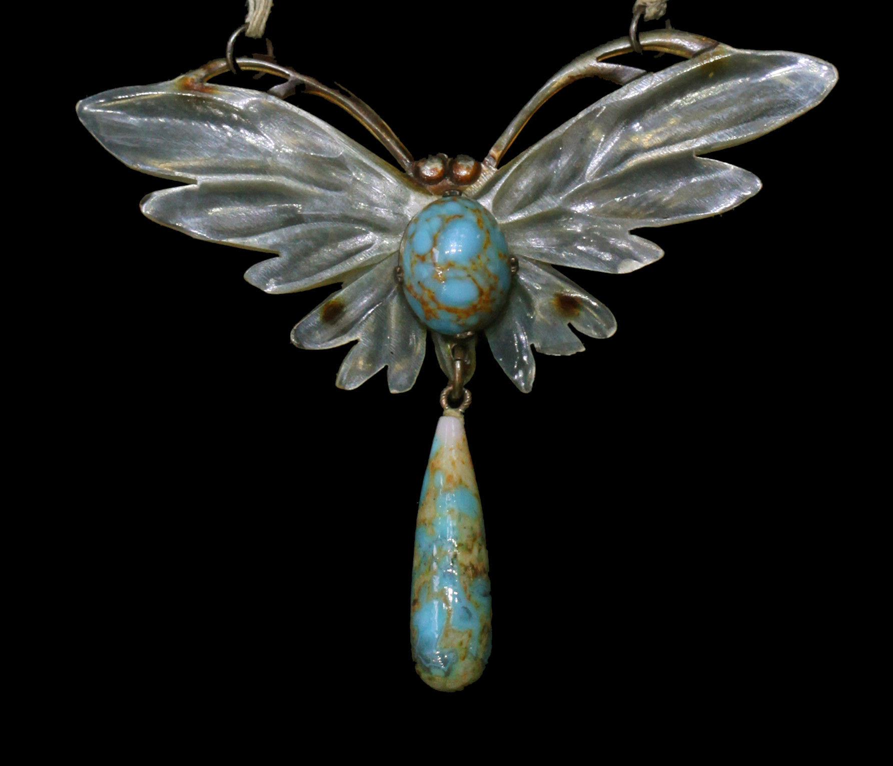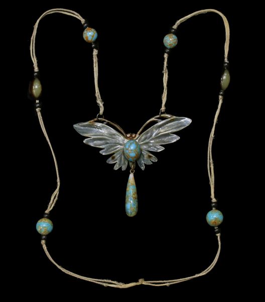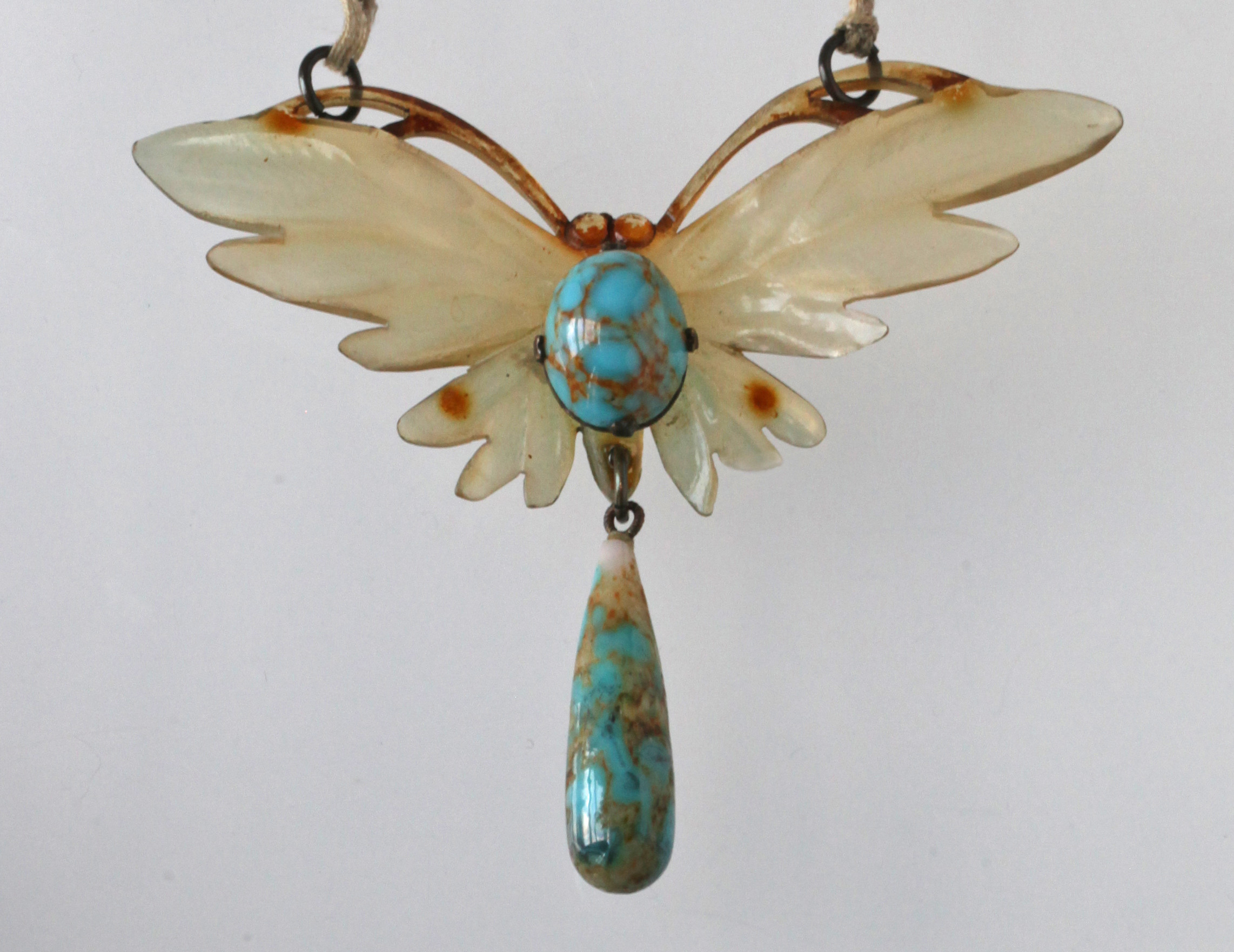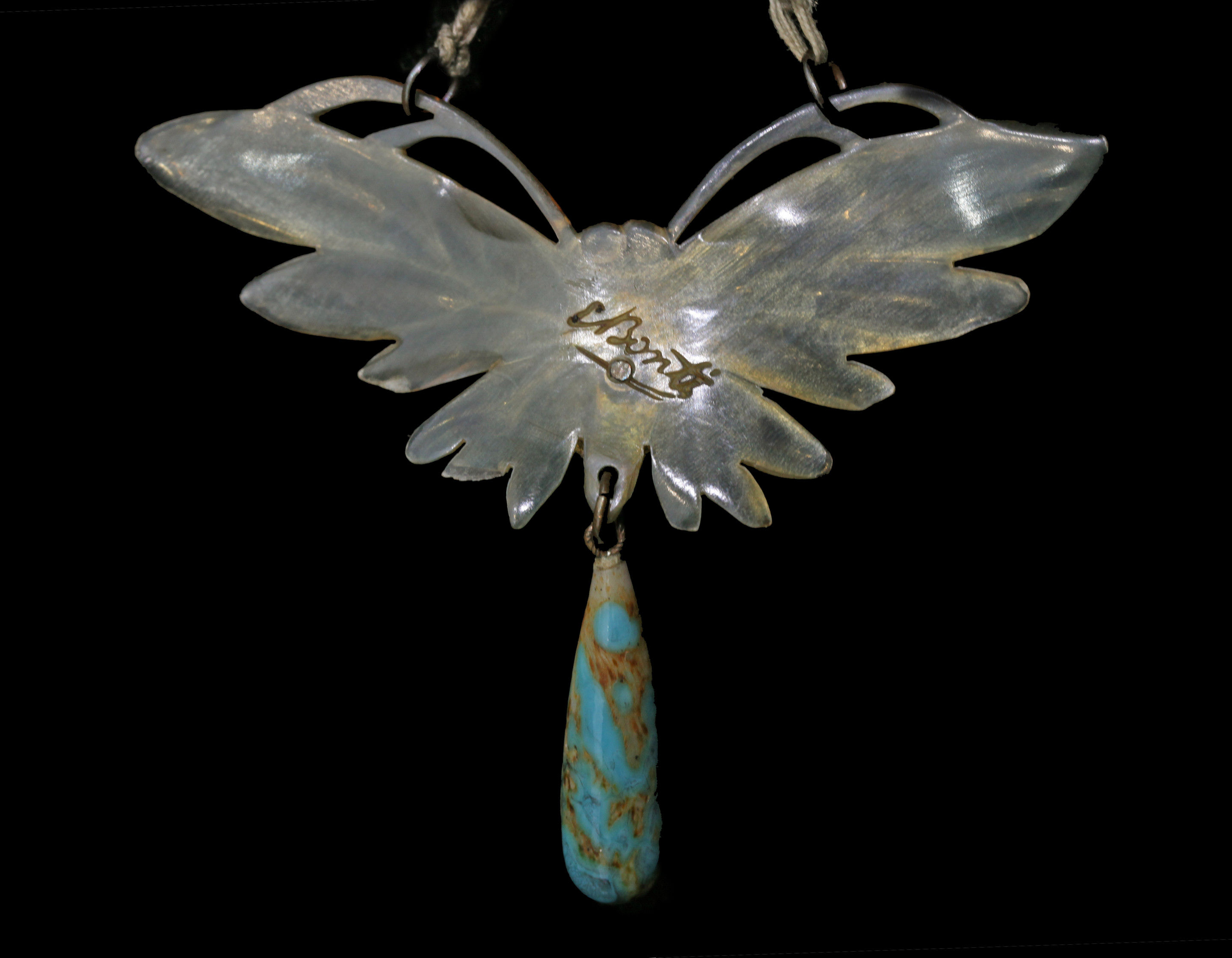 Elizabeth Bonté Art Nouveau Butterfly Pendant. The engraved hand carved horn is heightened with colour.