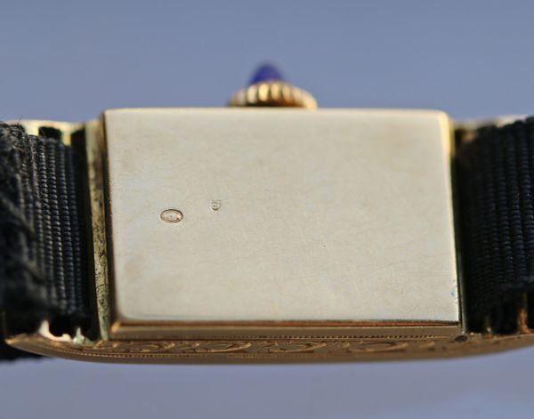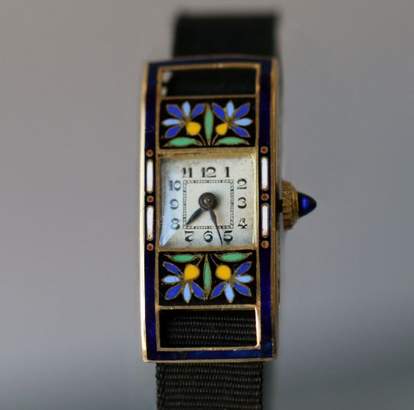 The arched rectangular case with polychrome champleve enamel & sapphire winder