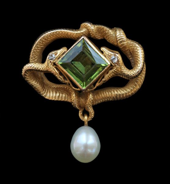 The naturalistic snakes biting a large emerald cut fine green peridot