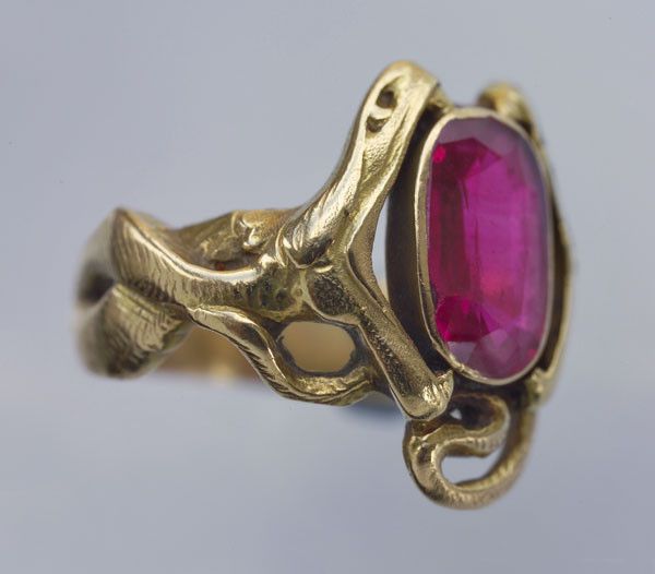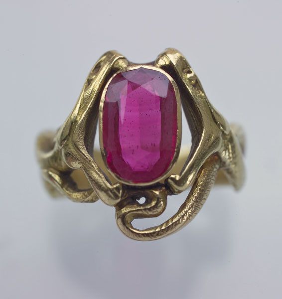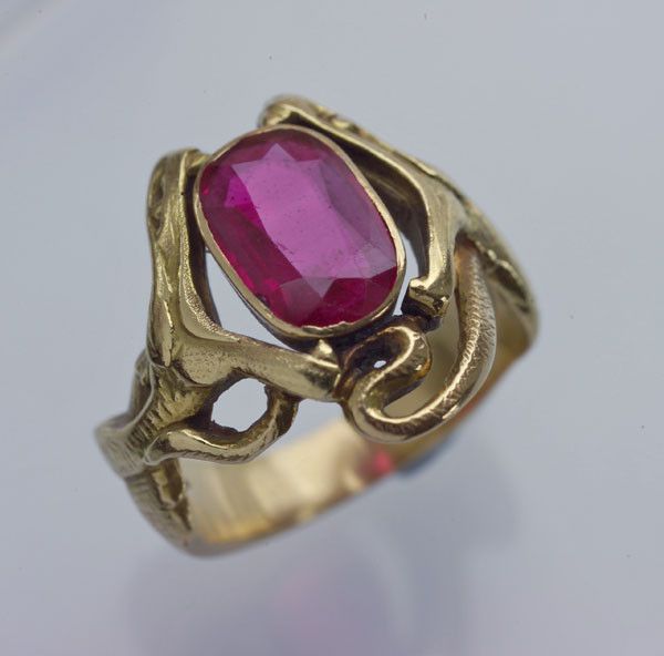 A depiction of a pair of snakes fighting over a ruby 'egg'. Perhaps a visual pun on two admirers fighting over the same woman 'She's a ruby'. A very stylish design contemporary with, & with echoes of Laliques serpent pendant in the Hermitage. Unfortunately the maker's mark has been lost in sizing the ring in the past.