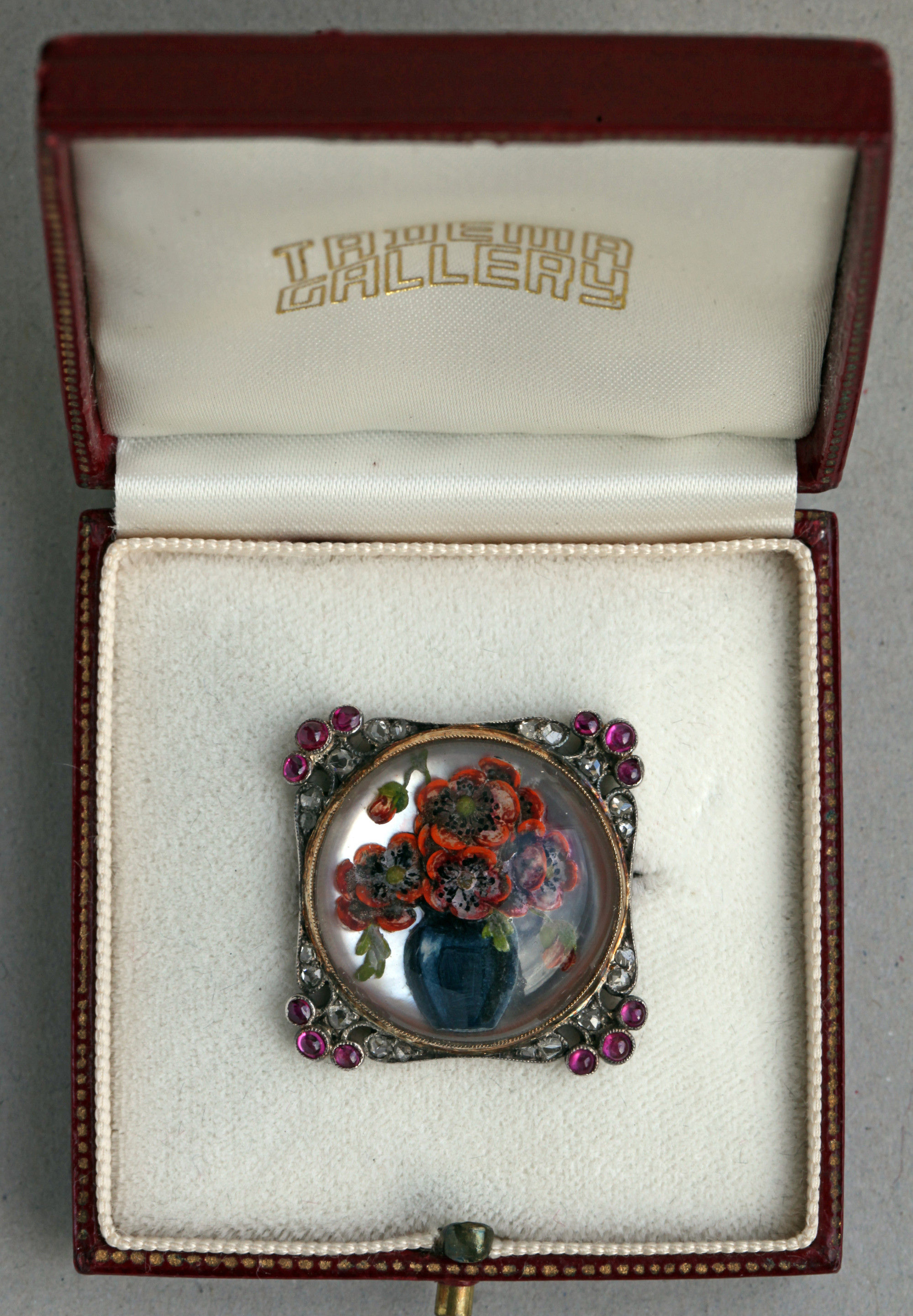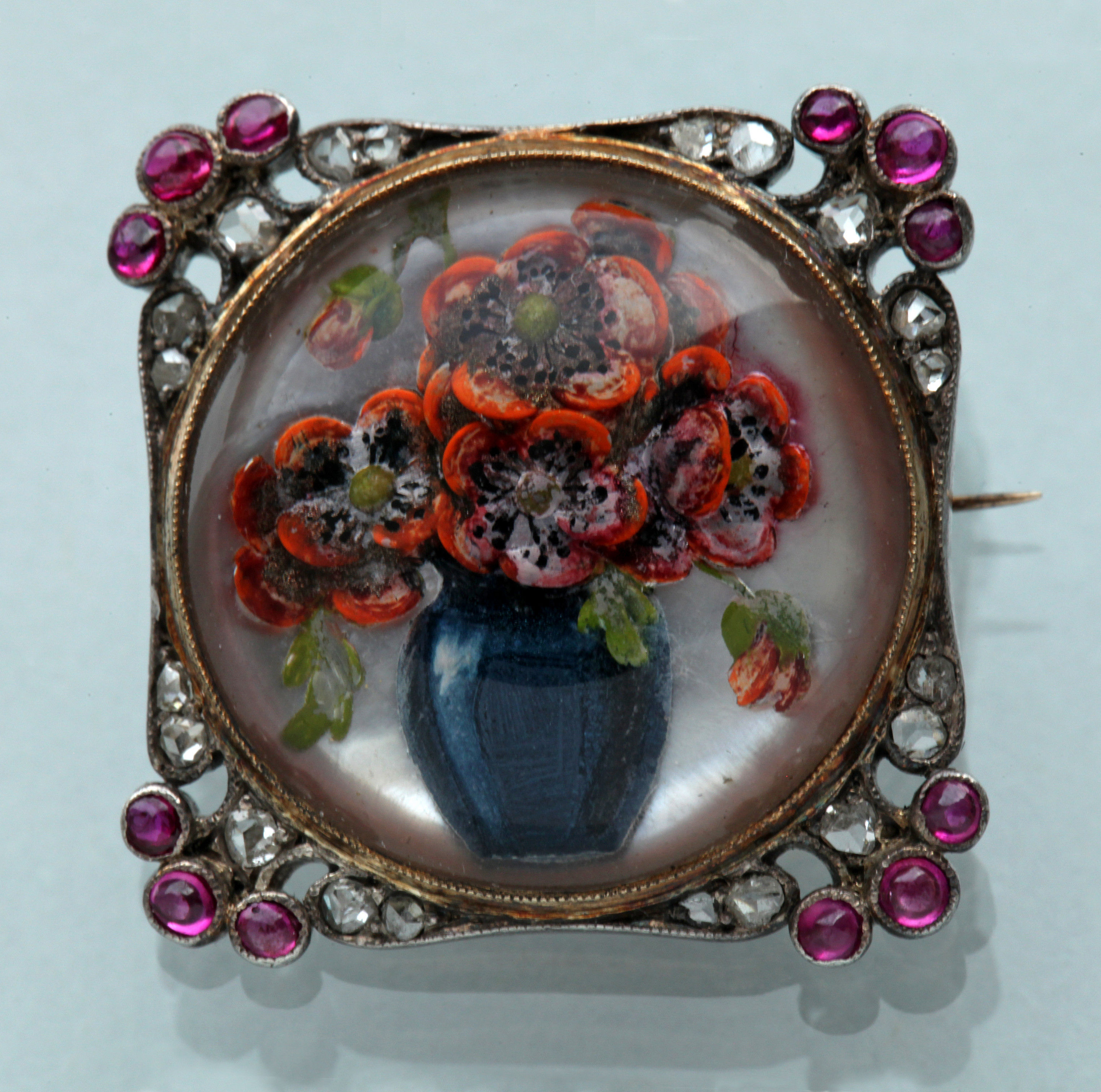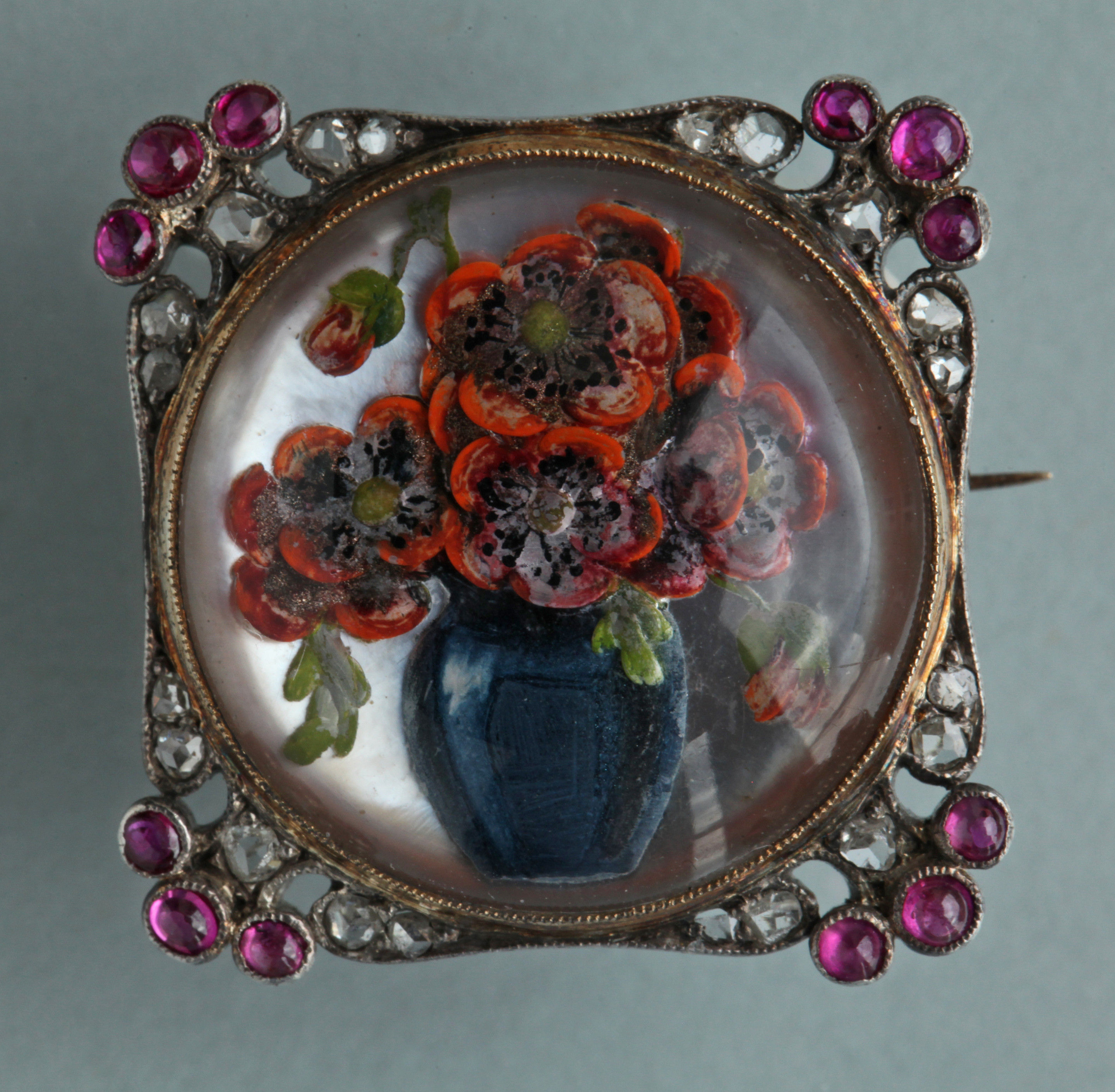 Intaglio cut cabochon rock crystal with back painting representing a vase of anemones.