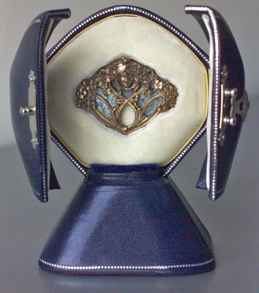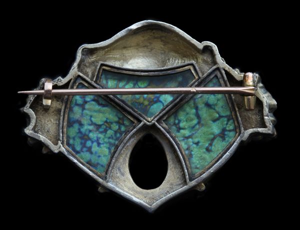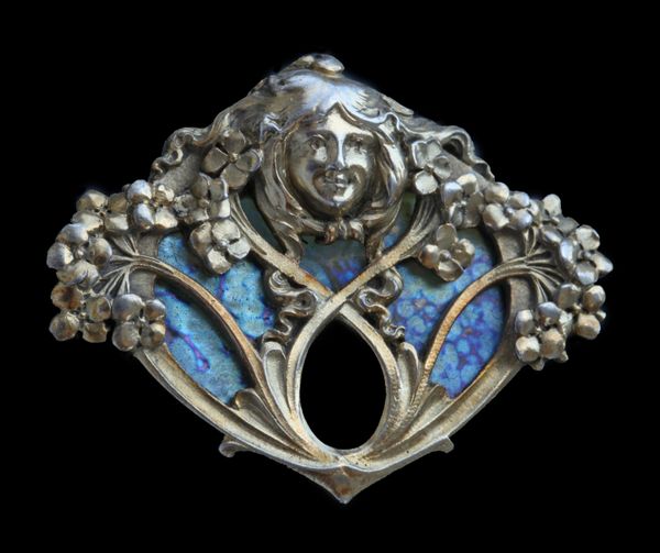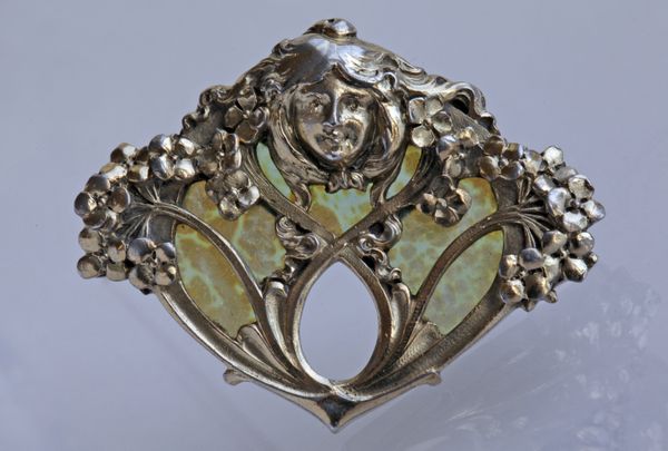 Vienna secession brooch bas relief signature style as used by many of the archetypal Art Nouveau designers. The maiden surrounded by honesty flowers. The design accented with a background of opalescent Loetz studio glass.