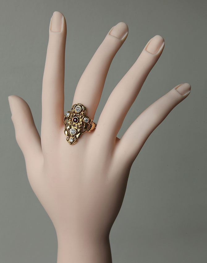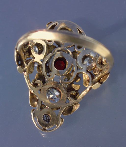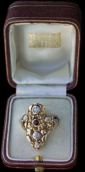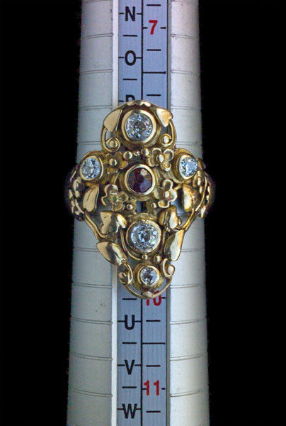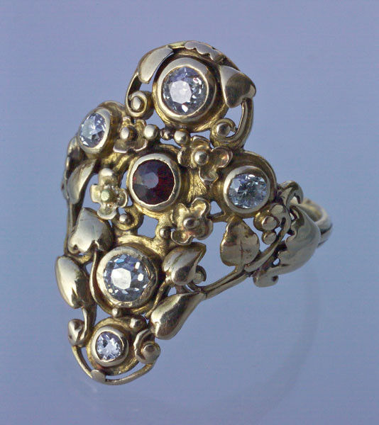 This ring is deceptive in that the craftsman has made all the individual leaves & flowers, involving over 50 separate gold elements, which is the hallmark of fine Arts & Crafts jewelry. 5 Old European cut diamonds 0.7 cts approx