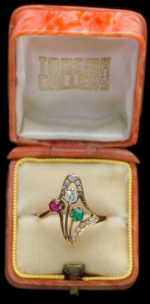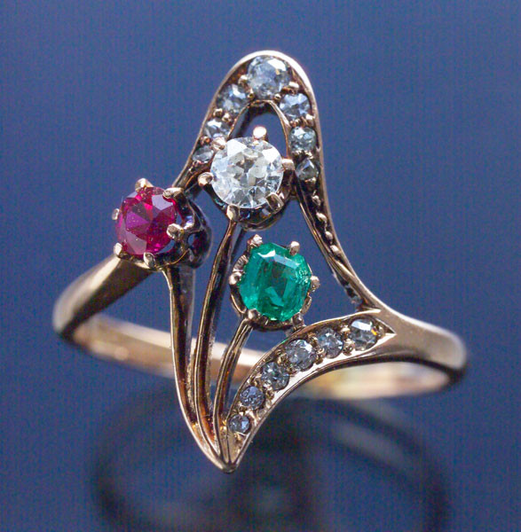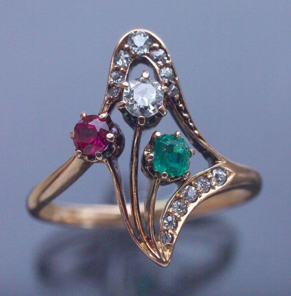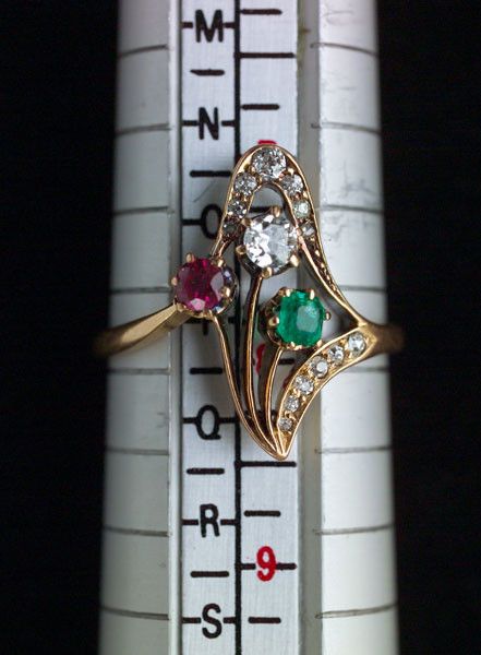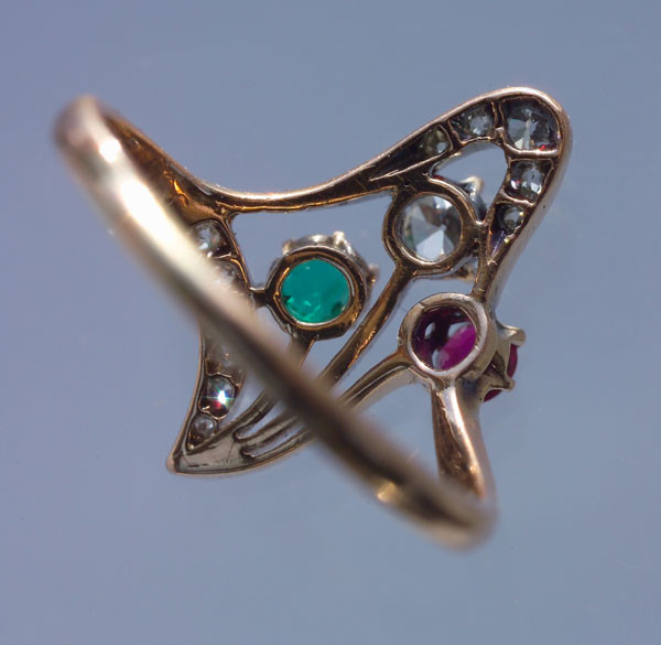 Ruby 0.15 cts approx, emerald 0.15 cts approx Old cut diamond 0.20 cts approx 13 Victorian cut diamonds 0.15cts approx surrounding