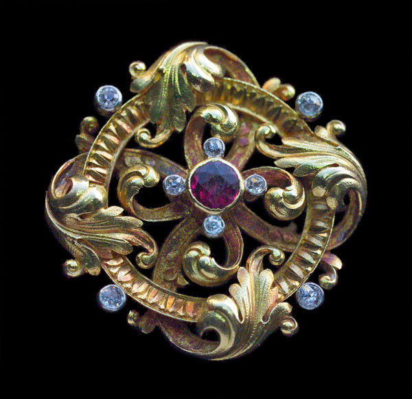 Acanthus leaves entwining a garter decorated with classical leaf motif encompassing a large cenral ruby & scattered old cut diamonds.