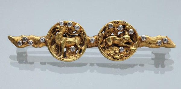 A finely worked scultural brooch of a 'Fox & Stag' in gold & diamond