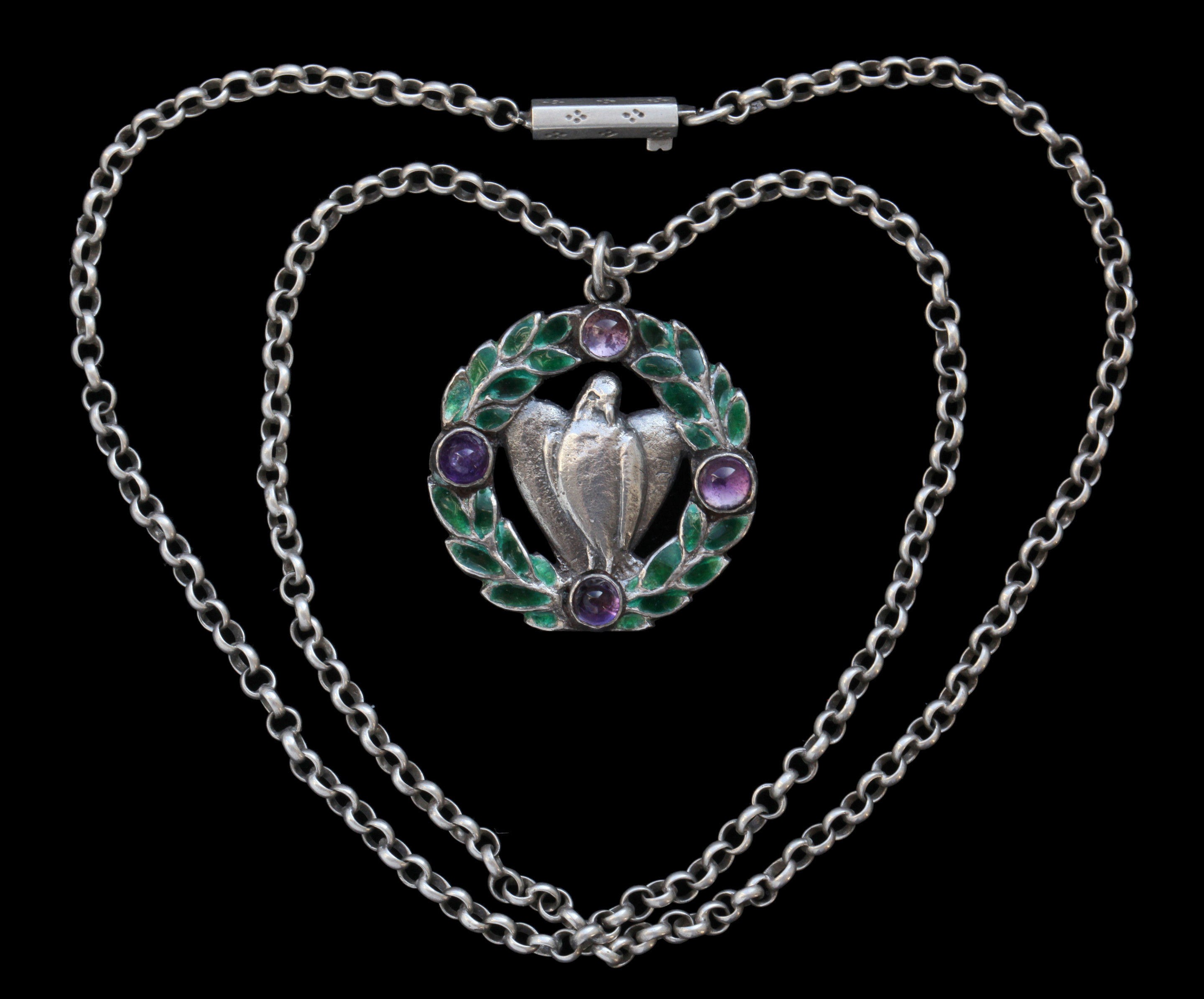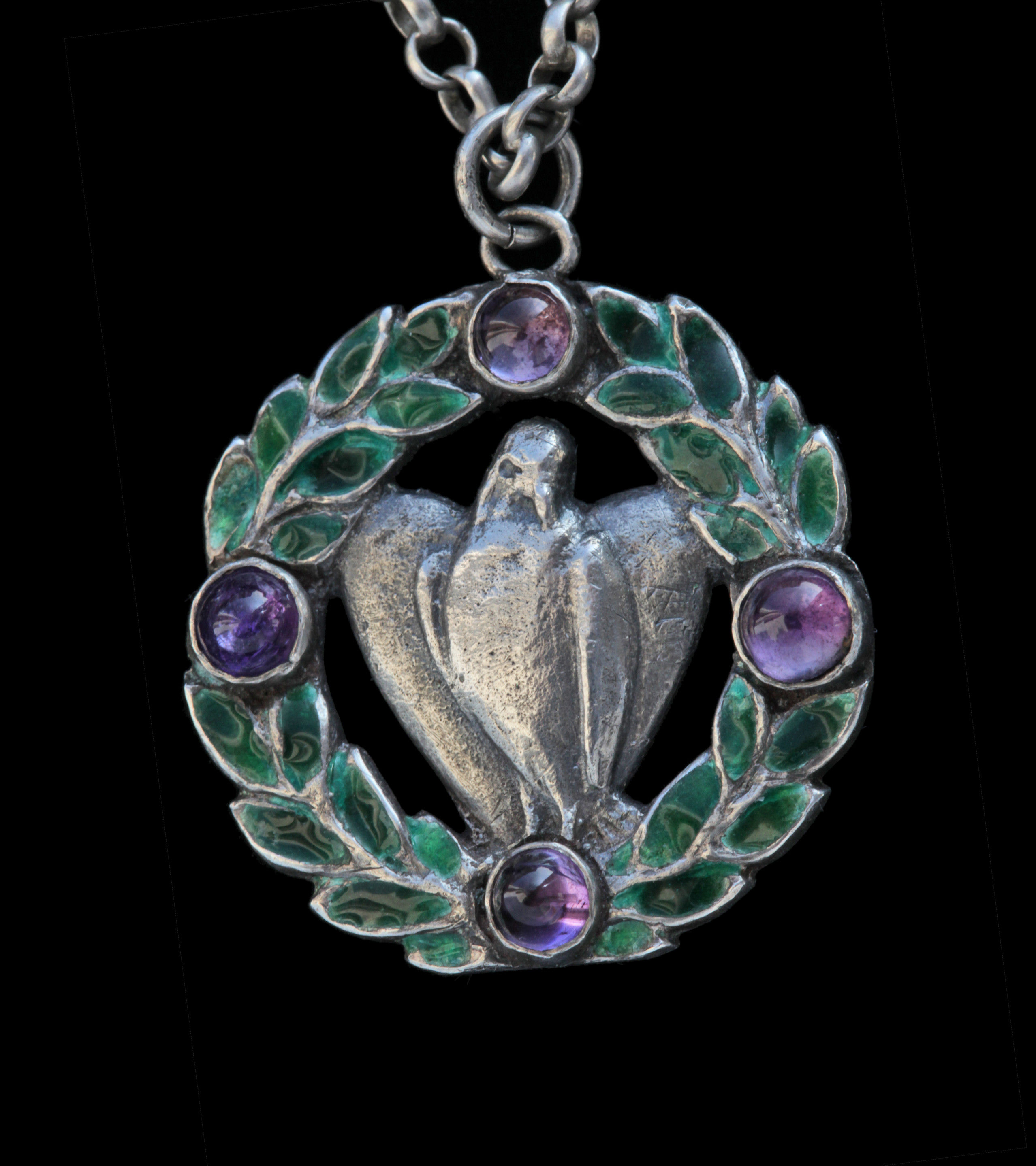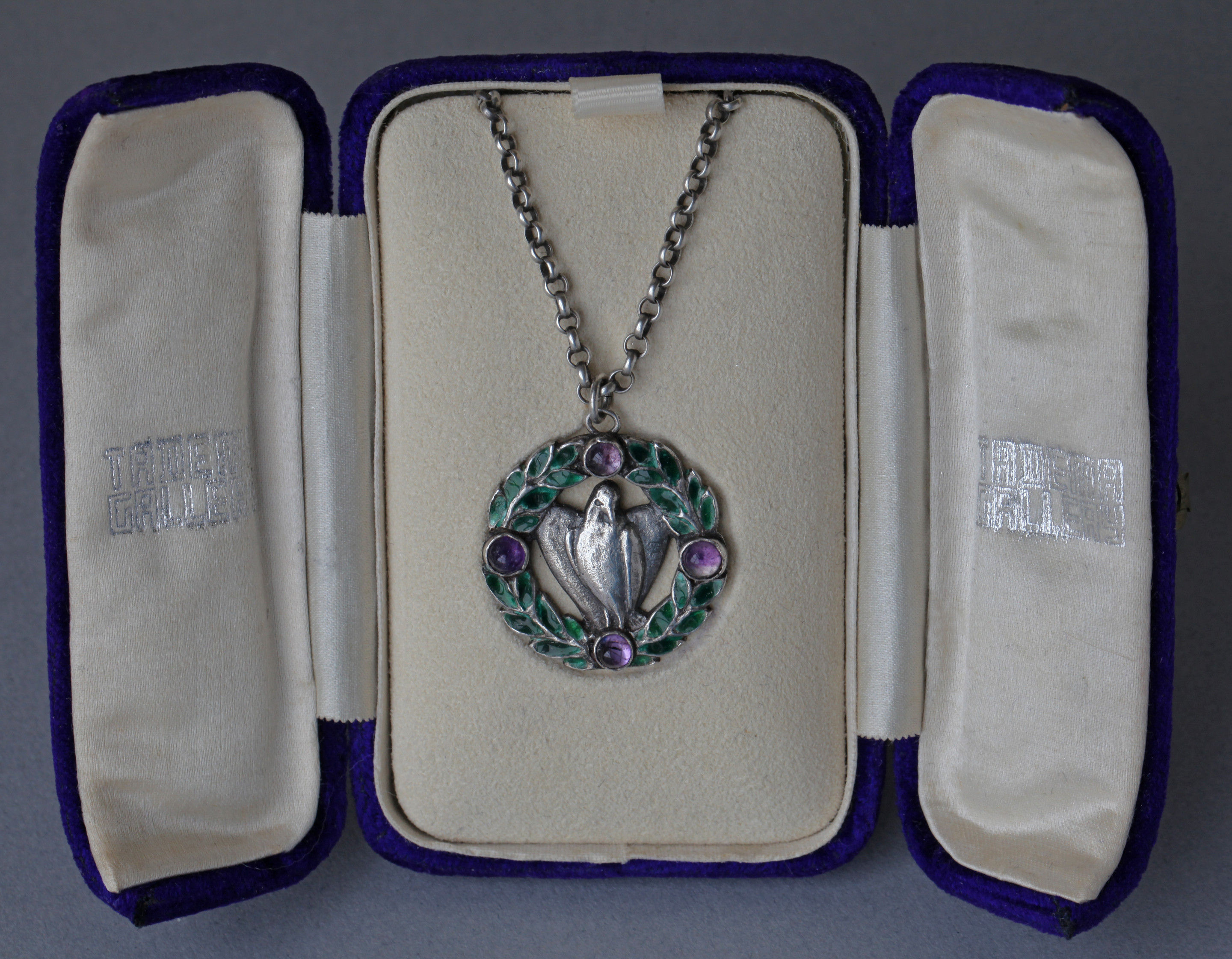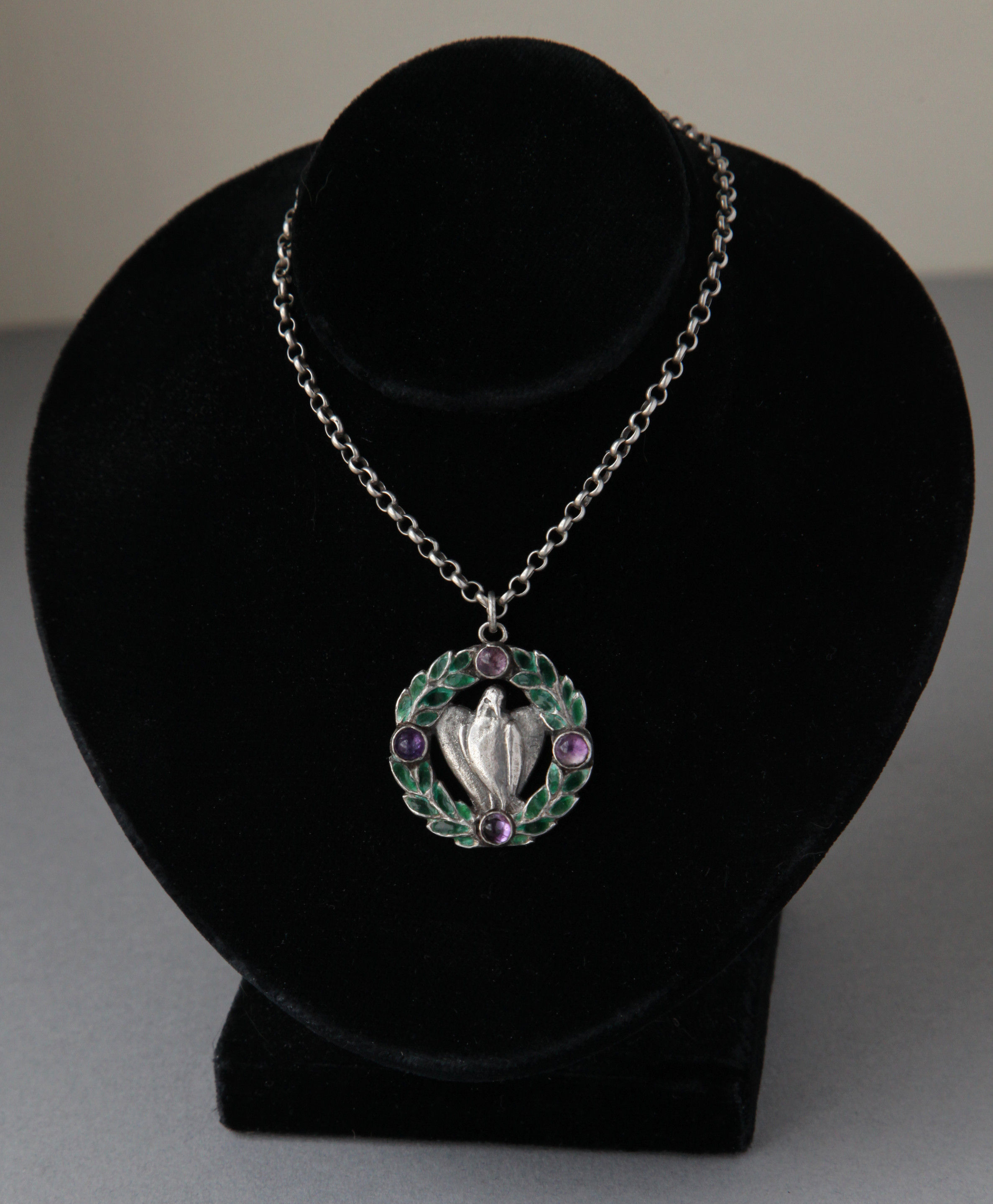 The colors of purple, white & green suggest this pendant was possibly worn by a member of the Suffragette movement circa 1910.