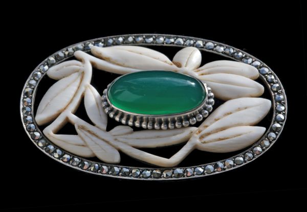 A fusion of Japonisme & the Wiener Werkstatte. The asymmetry of the green oval chalcedony garlanded with ivory laurels reinforcing the Japanese Wabi-sabi, but still holding on to the late Wiener Werkstatte idiom.