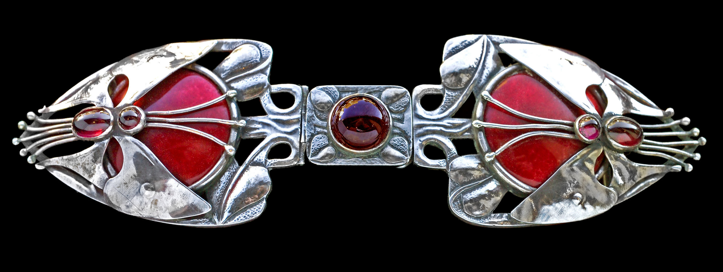 A beautiful Guild of Handicraft buckle in silver, red enamel & garnet designed by C.R.Ashbee