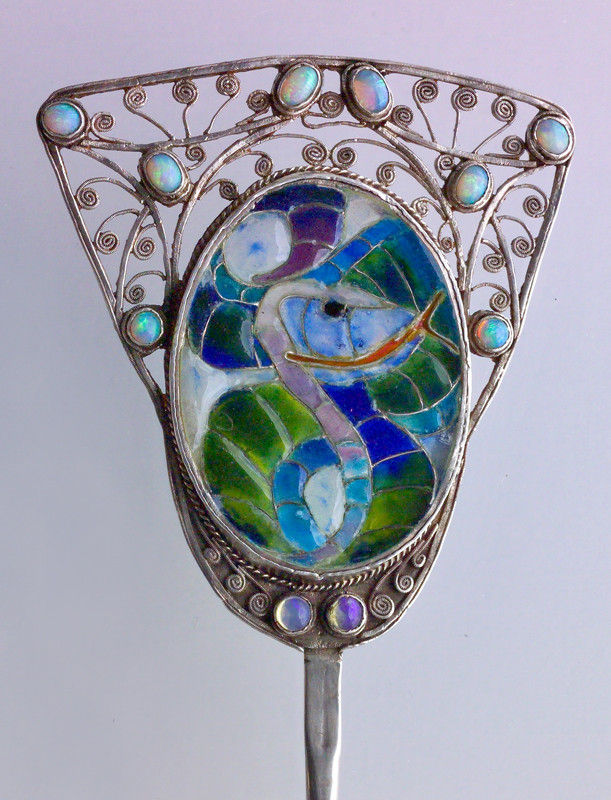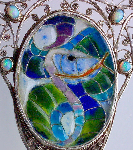 Silver, plique-à-jour enamel, opals
