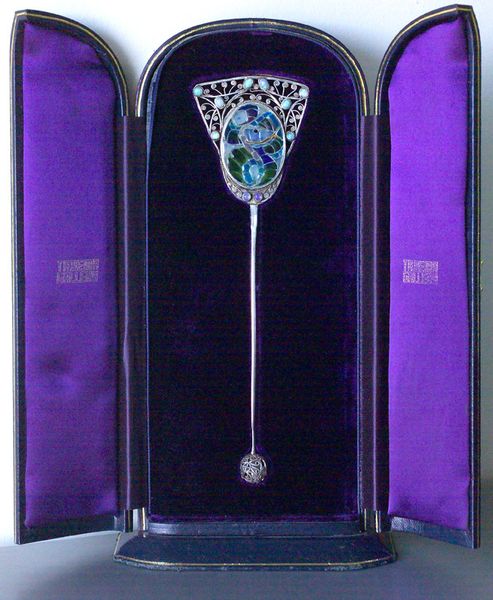 cf. The Guild of Handicraft Limited, Silversmiths & Jewellers by Appointment to Her Majesty The Queen, 1905-06, catalogue 14, p.78 illustrates a hat pin with the same silver filagree stopper.
