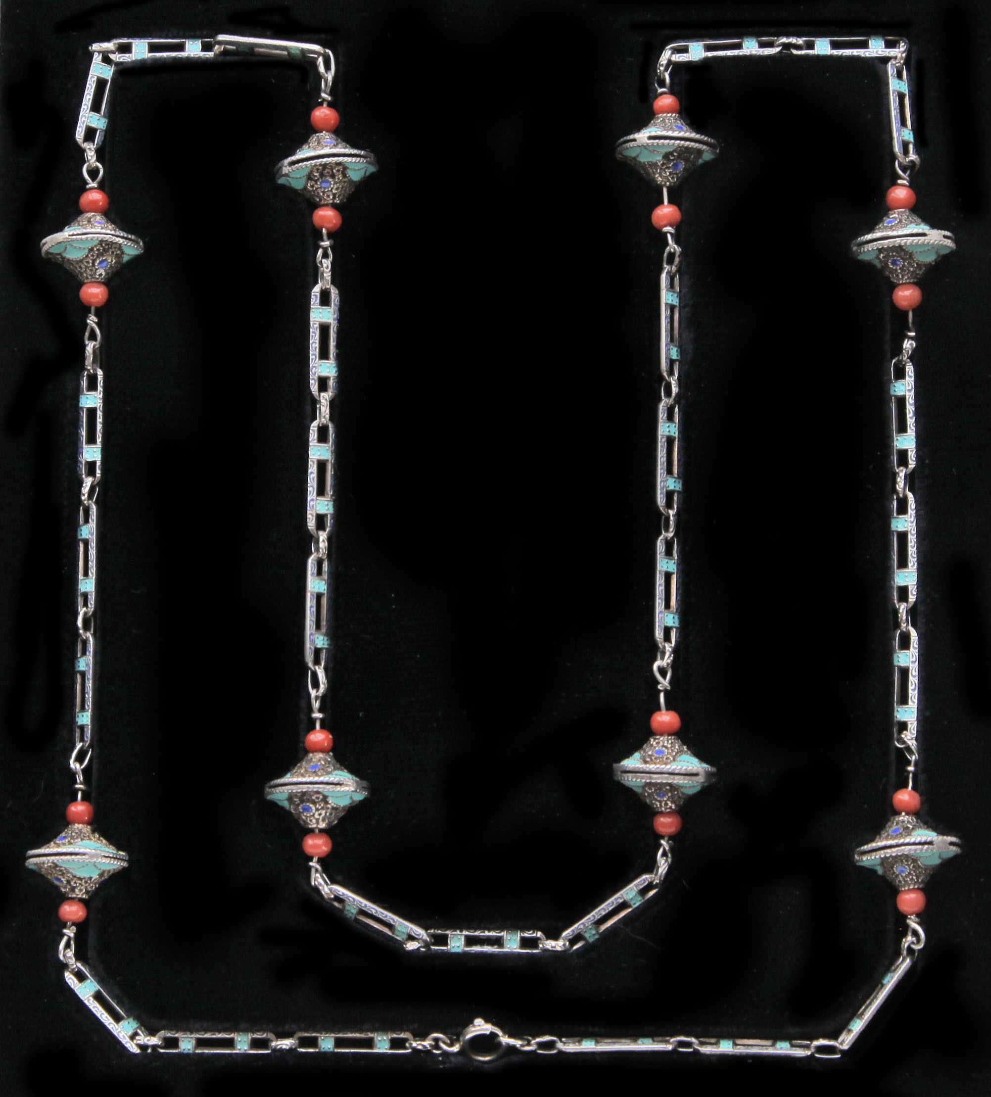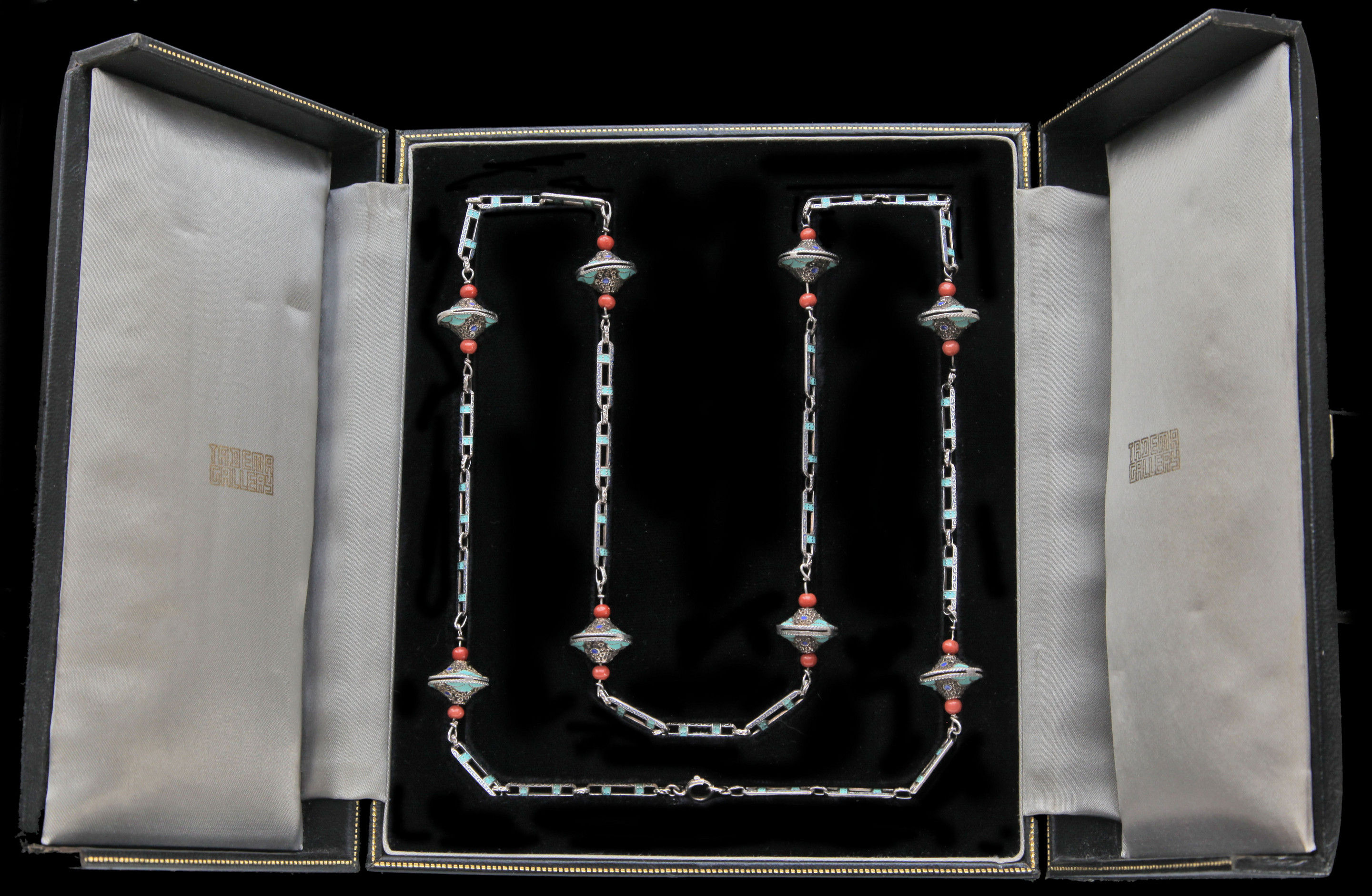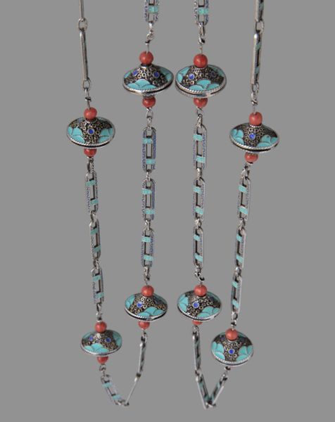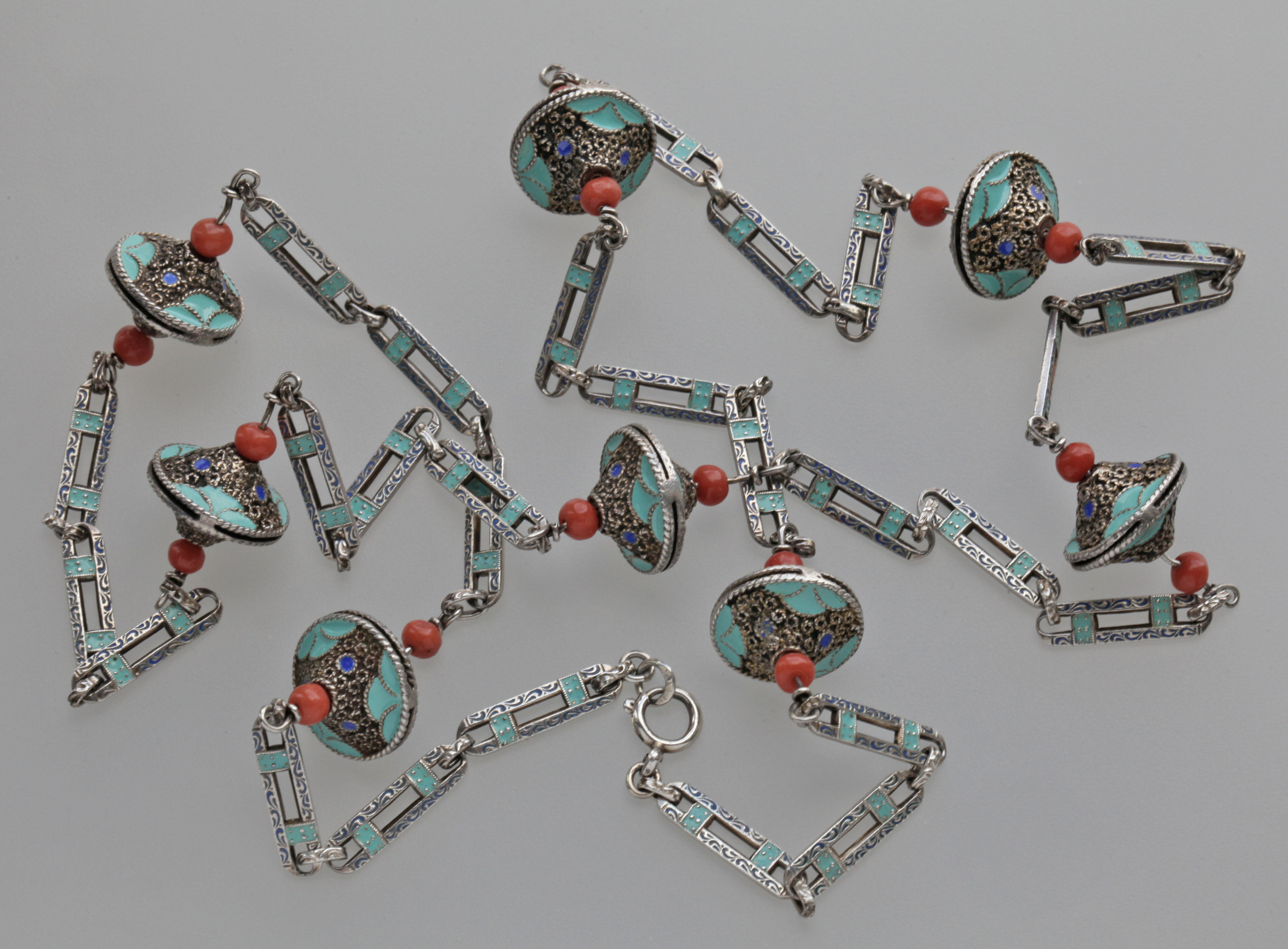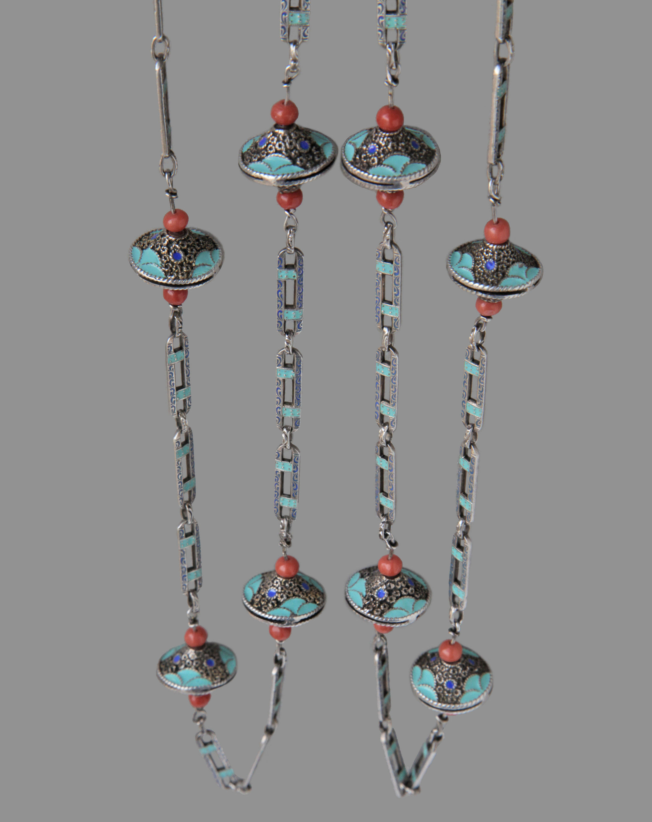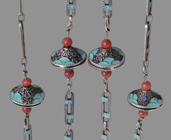 An important Theodor Fahrner Art Deco Sautoir by Gustav Braendle, ornamented with eight silver, enamel & coral decorative kreisels.