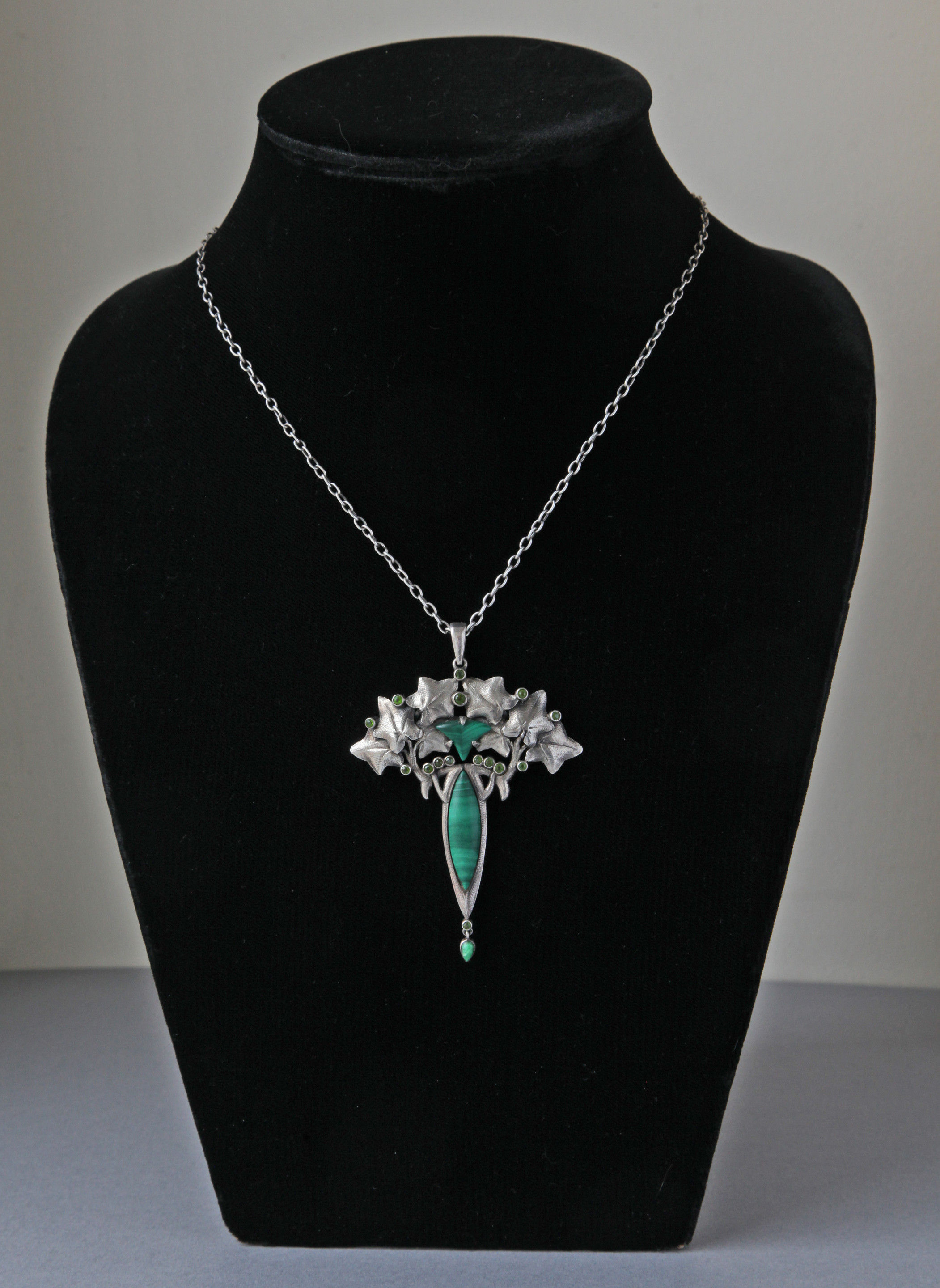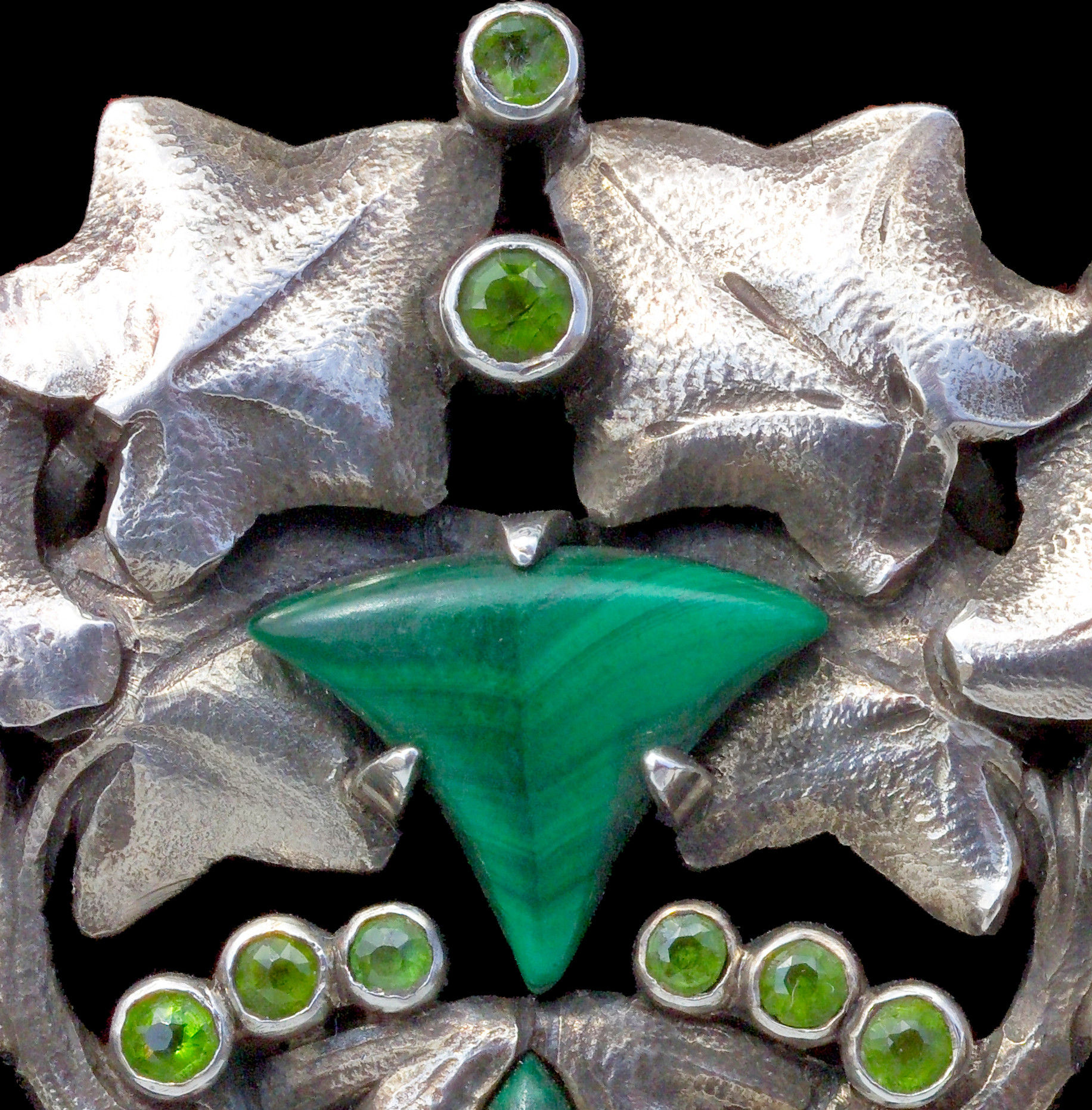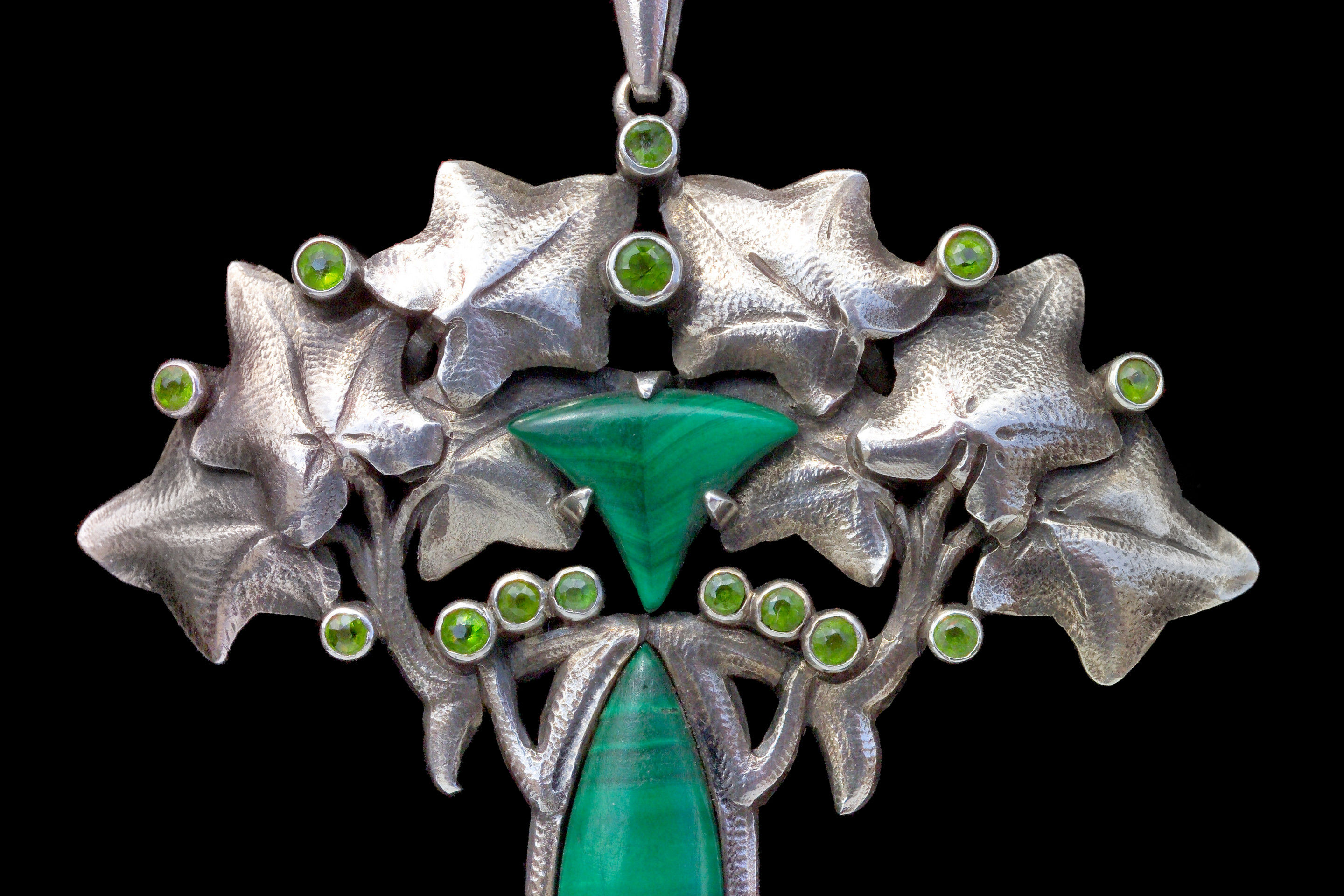 A good French Art Nouveau pendant in the manner of Lucien Gaillard in silver, malachite & demantoid garnet. Ivy's symbolism as an evergreen goes back to Celtic & Pagan origins & has carried on continually through to the present day. A lovely anniversay or friendship gift