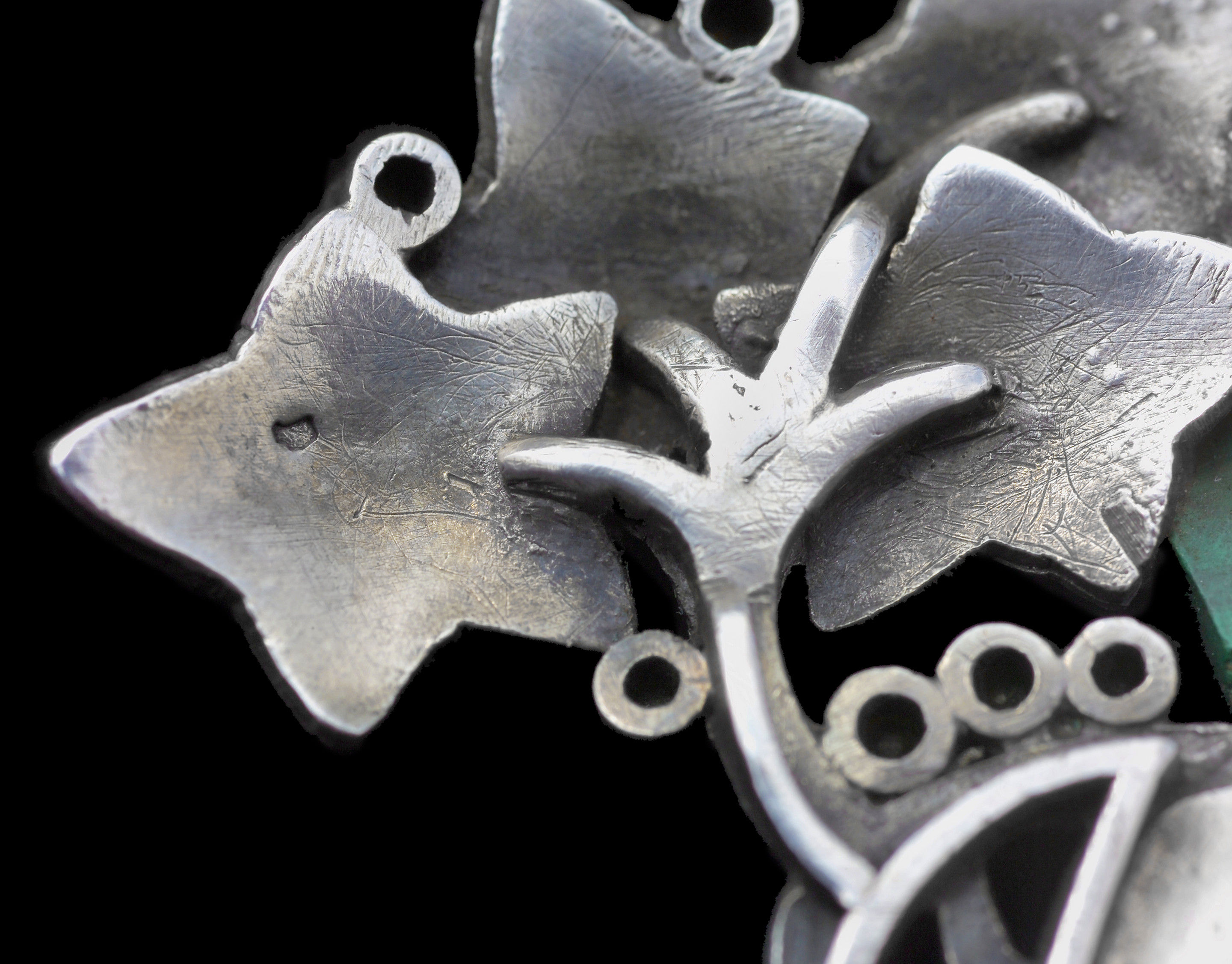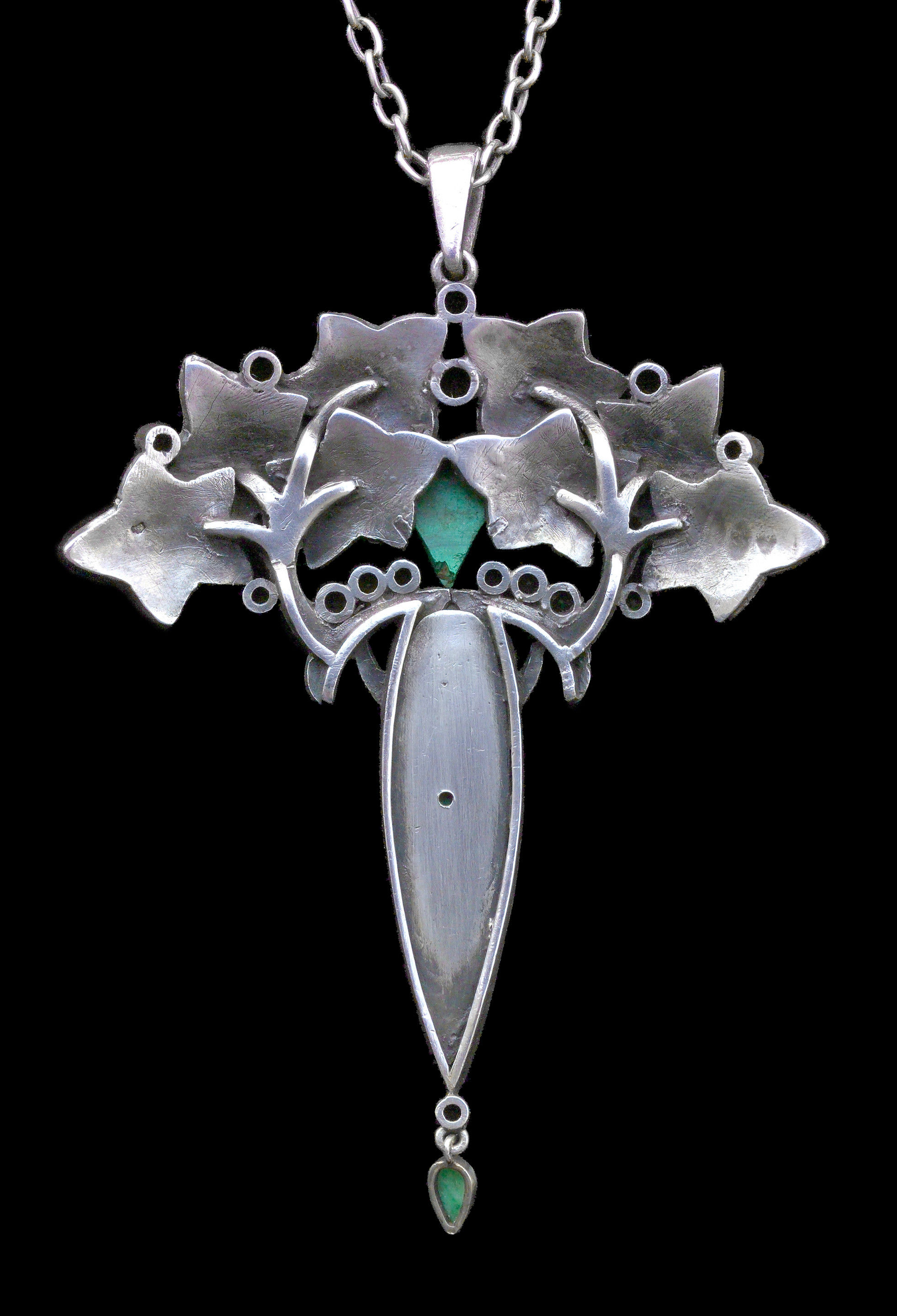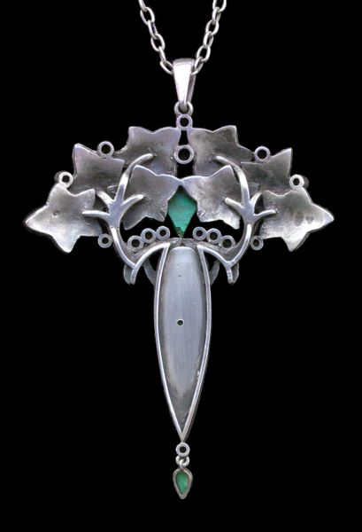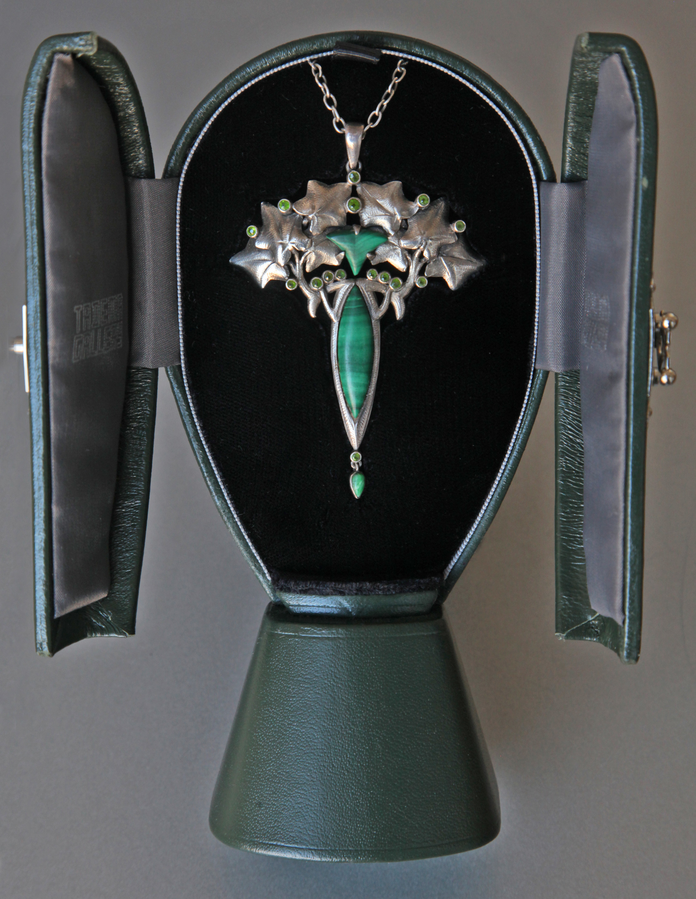 A good French Art Nouveau pendant in the manner of Lucien Gaillard in silver, malachite & demantoid garnet. Ivy's symbolism as an evergreen goes back to Celtic & Pagan origins & has carried on continually through to the present day. A lovely anniversay or friendship gift