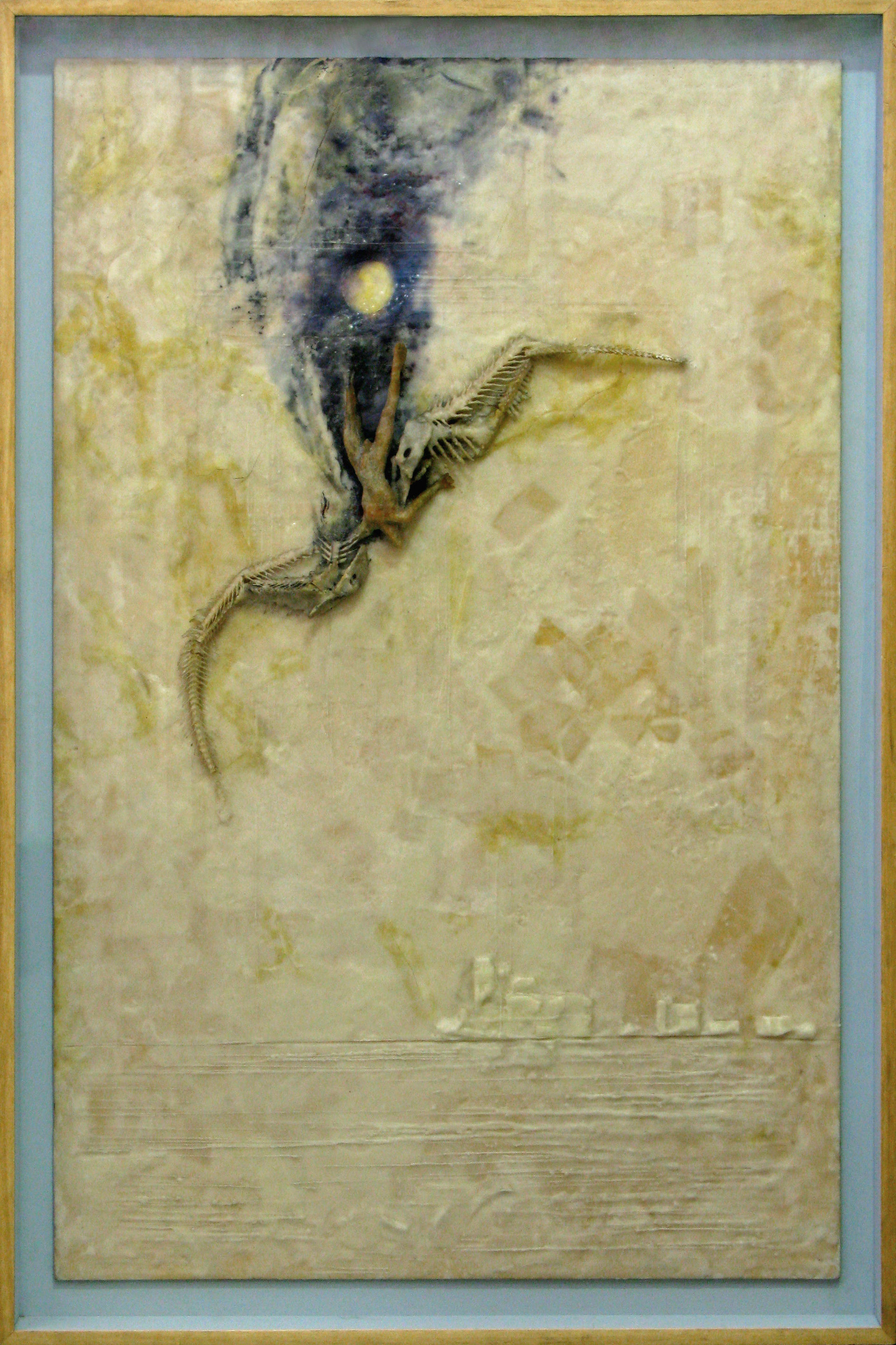 ""Icarus Falls (1959) formerly in the collection of Gavin Maxwell, provides the climax of the series of wax reliefs & which fortunately survived the fire which destroyed Sandaig in 1967. Stripped of his wax feathers & his wings reduced to bony frames, Icarus plummets earthwards, the victim of his own folly…..the very choice of wax as the principal medium creates an additional complex visual metaphor.” P. Cannon-Brooks