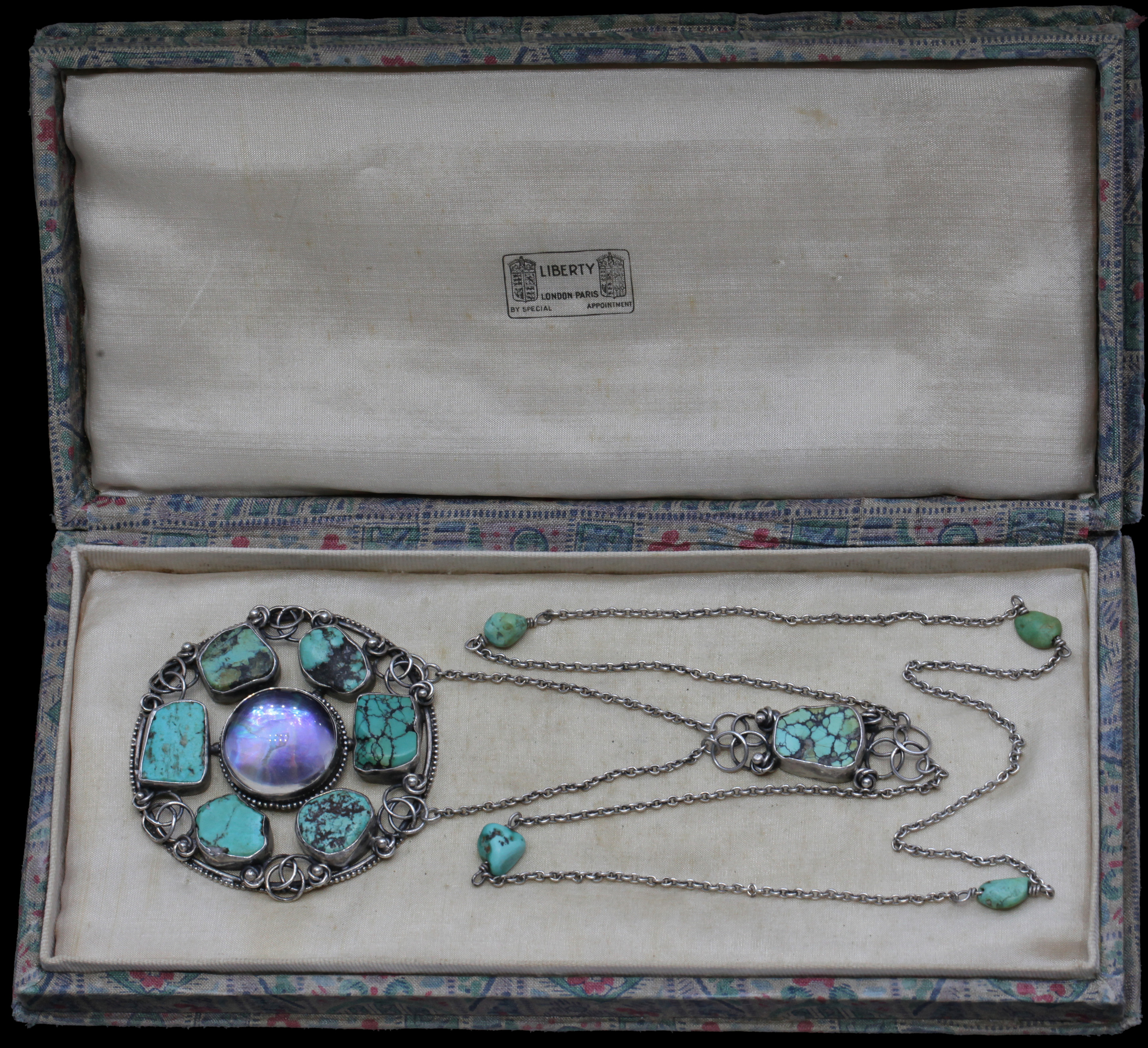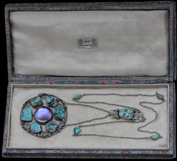 An impressive Arts & Crafts pendant ornamented with Celtic style wrought wire work in the original Liberty & Co silk case