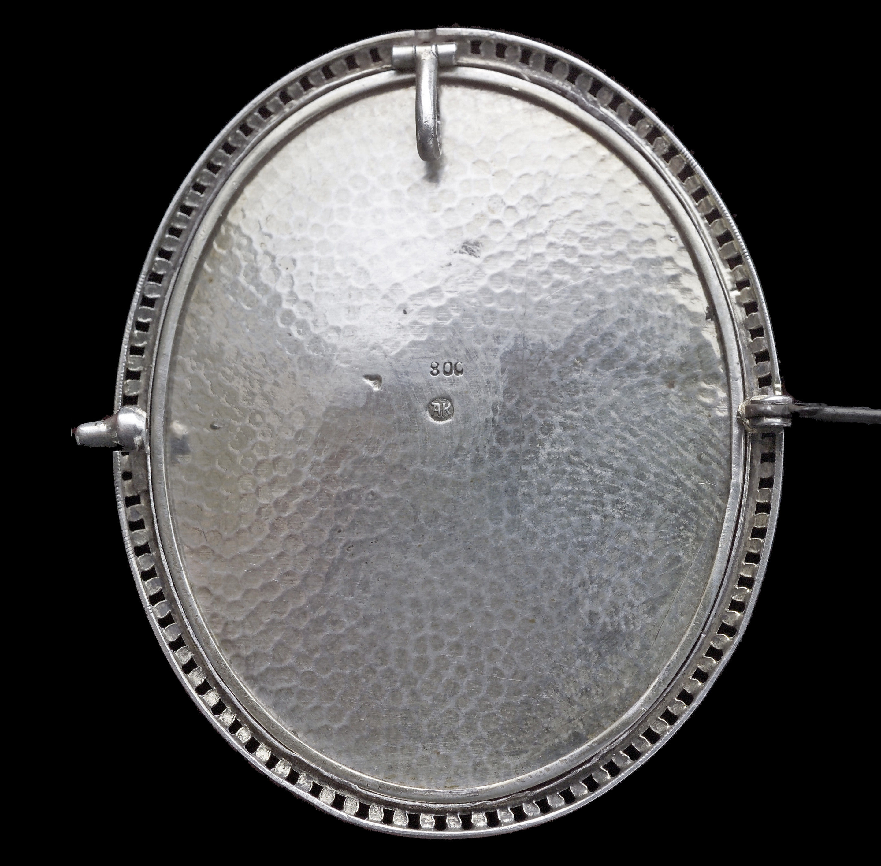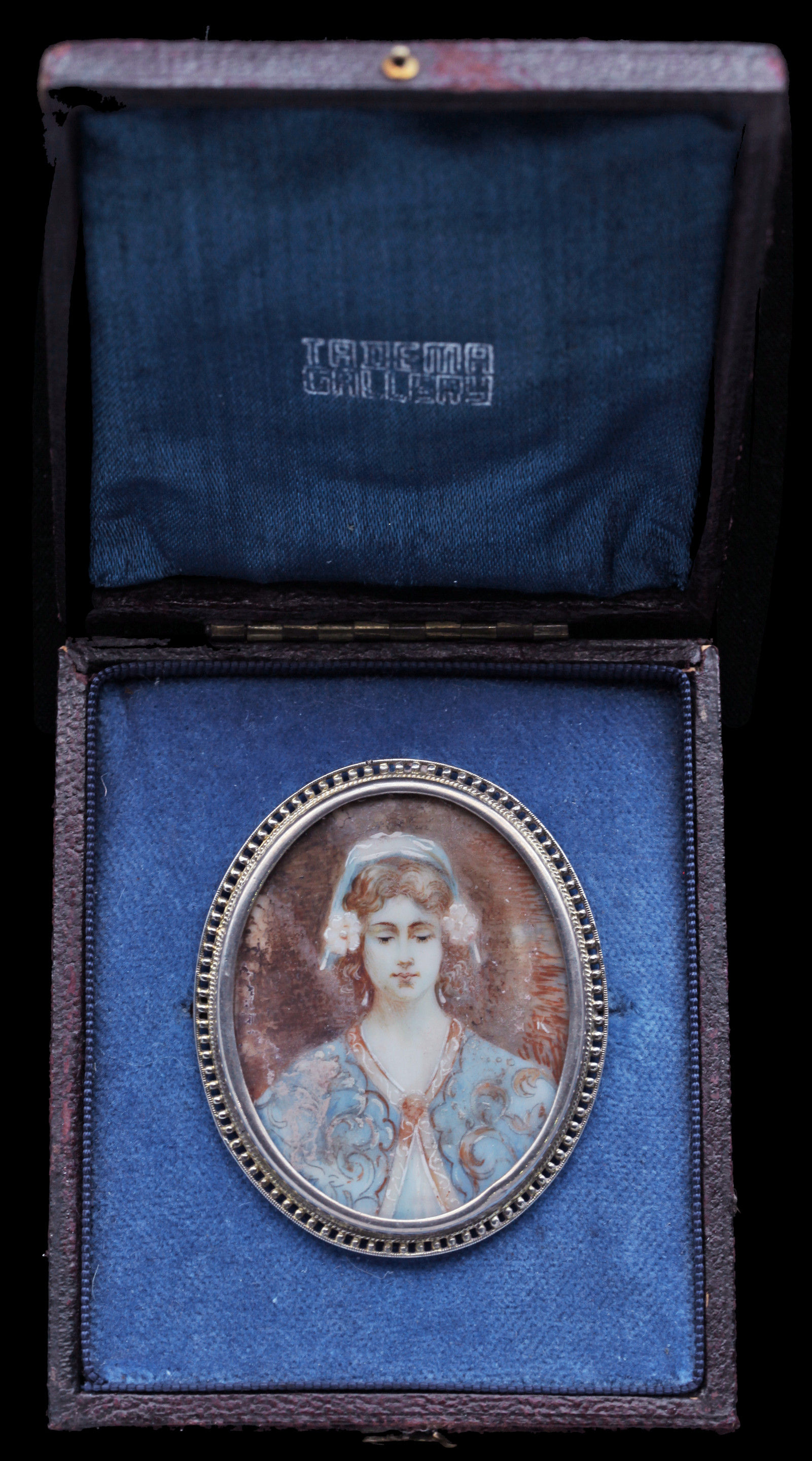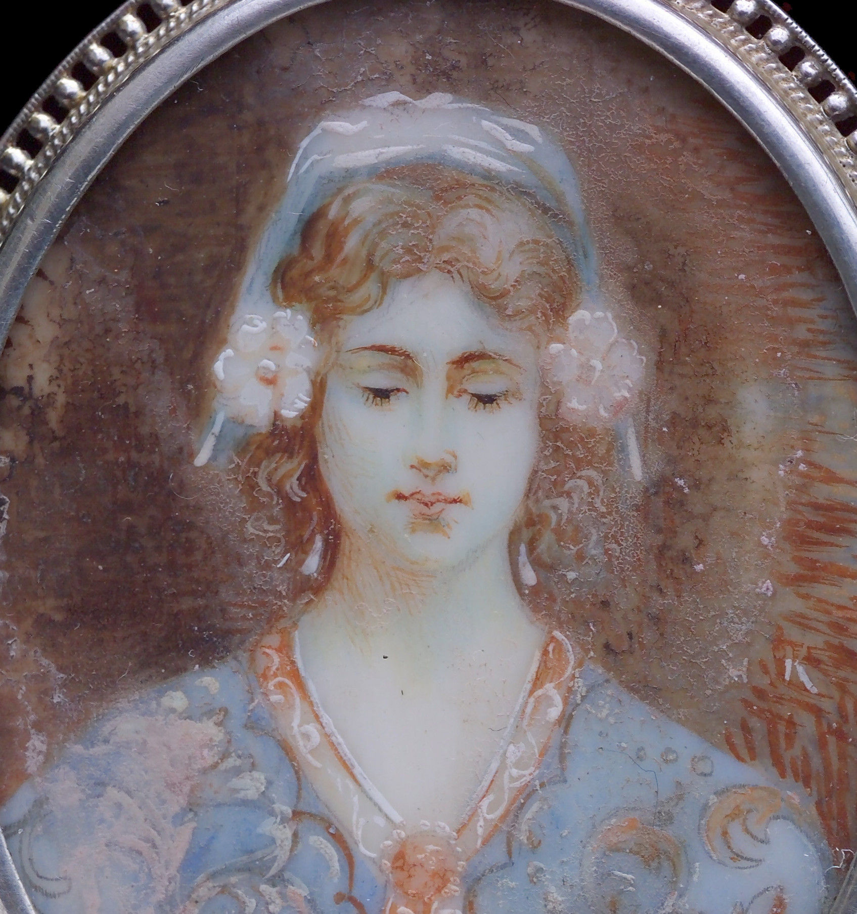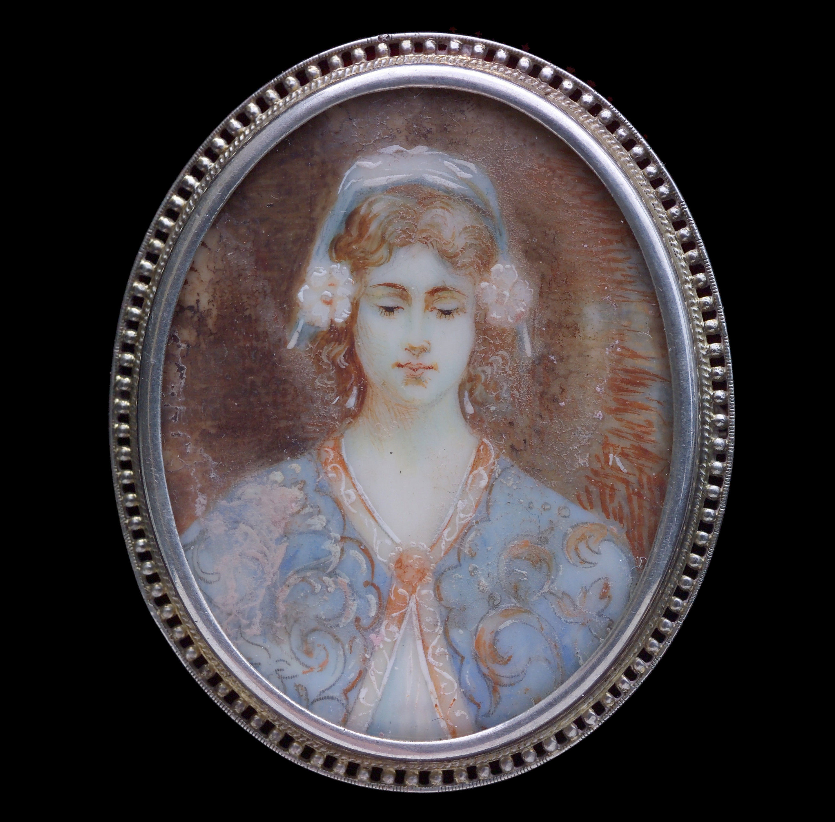 A beautifully painted ivory plaque of a young girl. Mounted in silver with a hinged pendant loop.